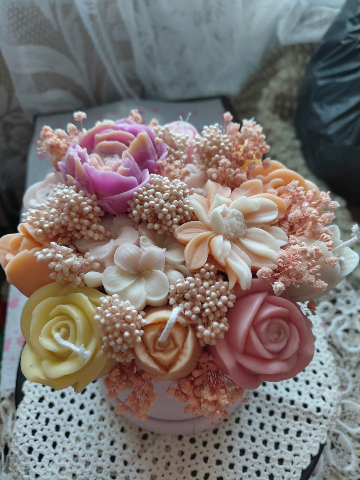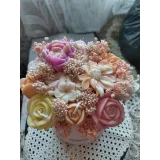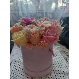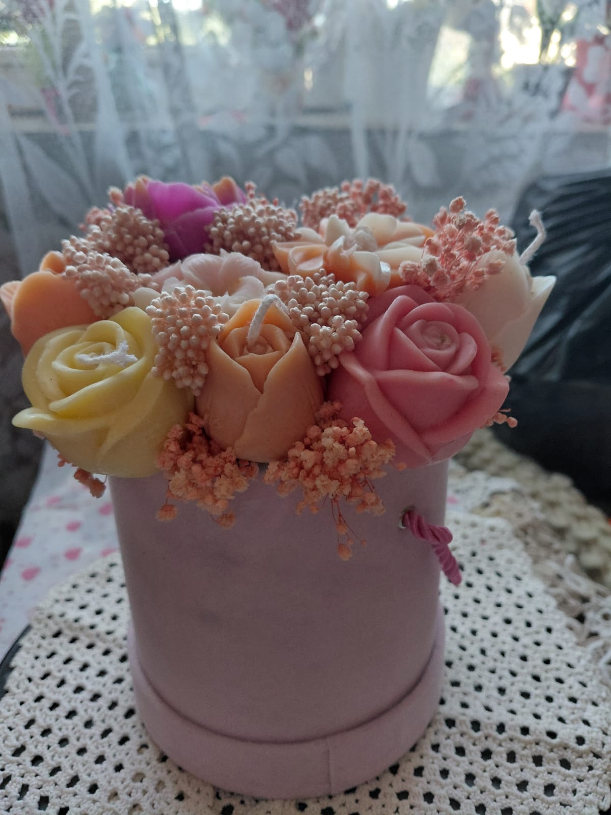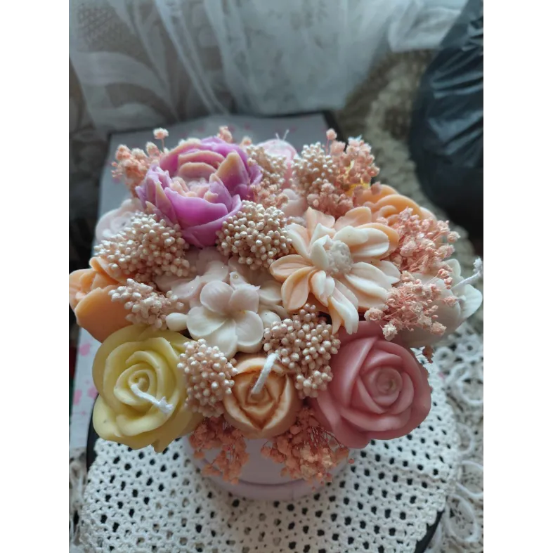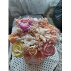 Aranjament floral handmade realizat din flori turnate manual din ceară naturală, dispuse cu grijă într-o cutie rotundă din catifea, roz pudrat. Nuanțele delicate de roz corai, alb și accente subtile creează un aranjament rafinat și armonios, ideal pentru a aduce un plus de eleganță și căldură în orice încăpere.Ideal pentru: cadouri speciale, decor sofisticat pentru casă sau birou, ocazii festive și aniversări.Detalii: