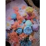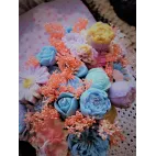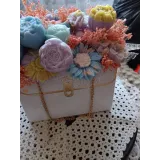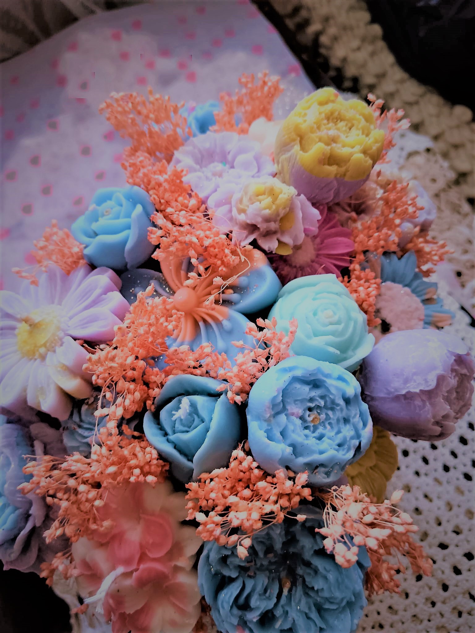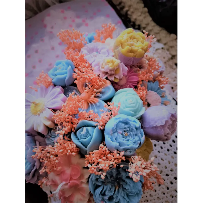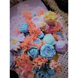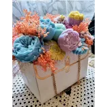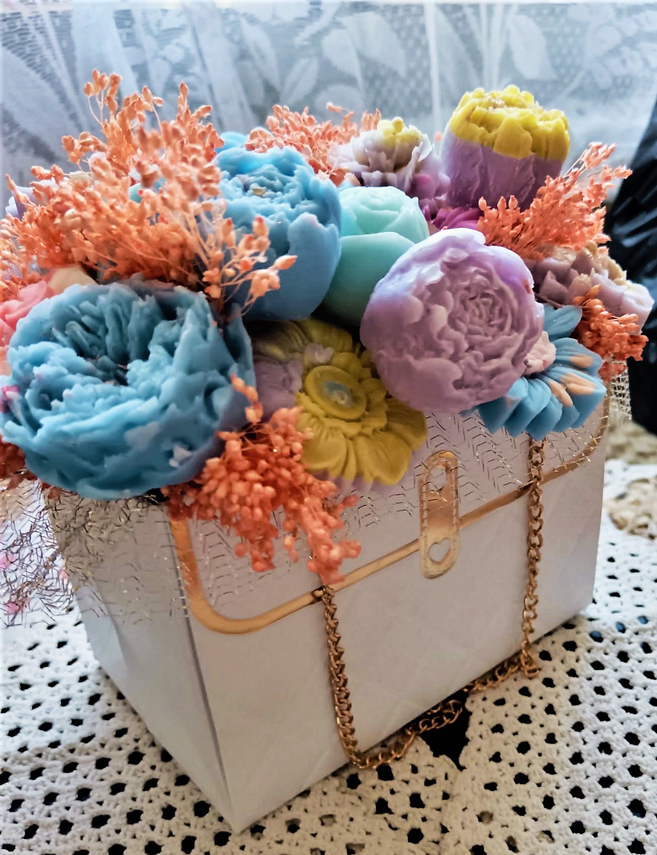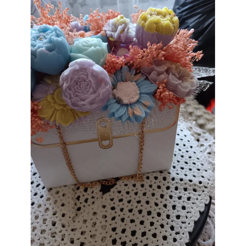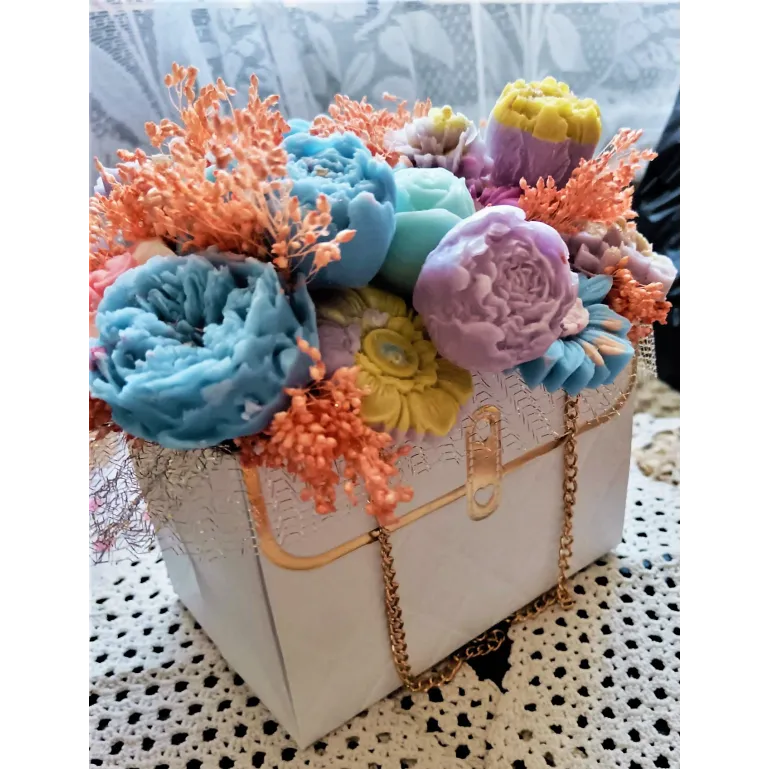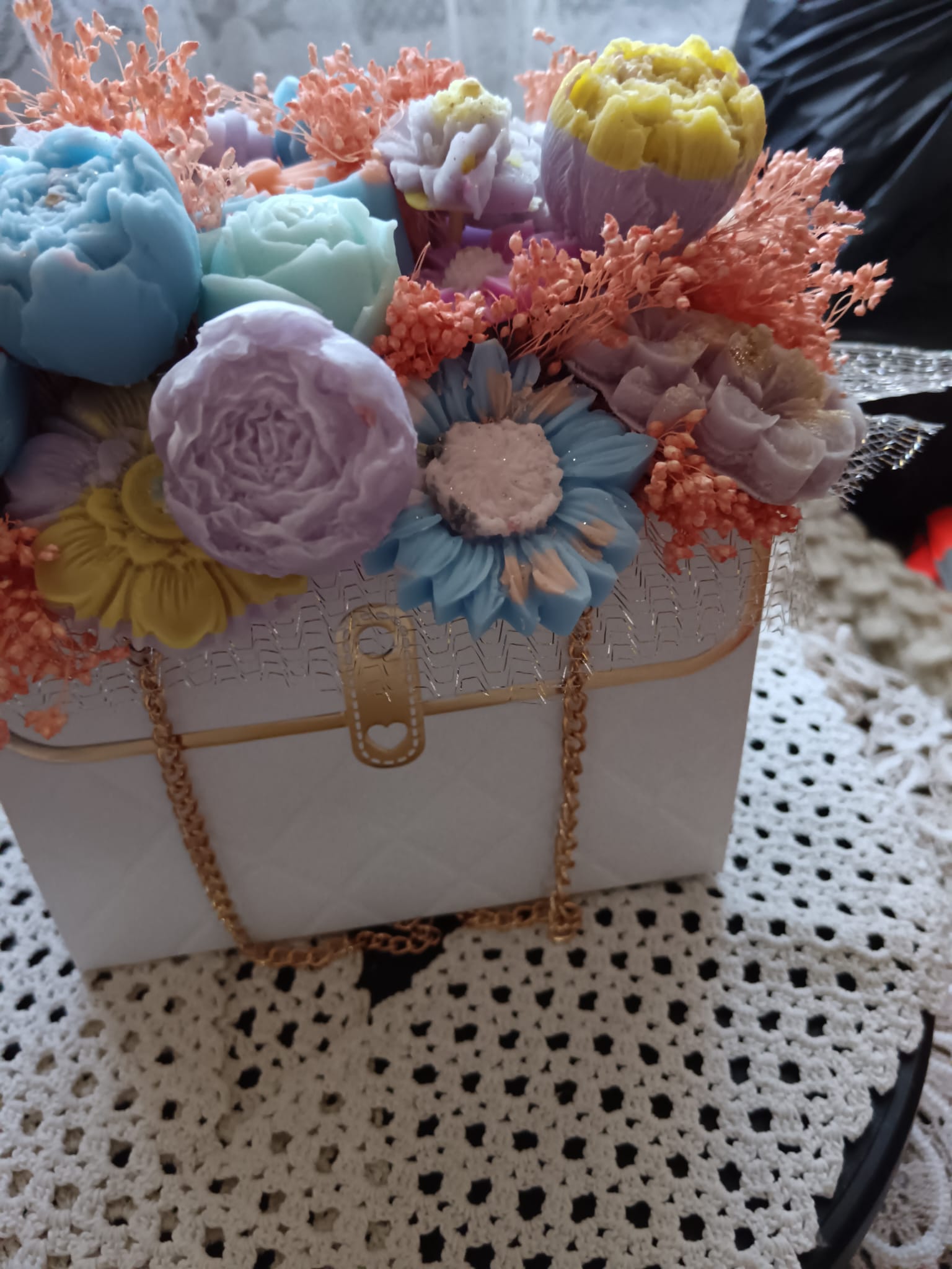 Aranjament floral handmade realizat din flori turnate manual din ceară naturală, dispuse cu grijă într-o cutie elegantă în formă de poșetă, accesorizată cu mânere din lanț auriu. Combinația de culori – albastru, portocaliu și mov deschis – aduce un plus de rafinament și prospețime, transformând orice spațiu într-un colț plin de armonie și eleganță.Ideal pentru: cadouri speciale, decor sofisticat pentru casă sau birou, ocazii festive.Detalii: