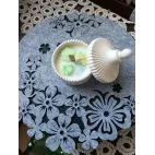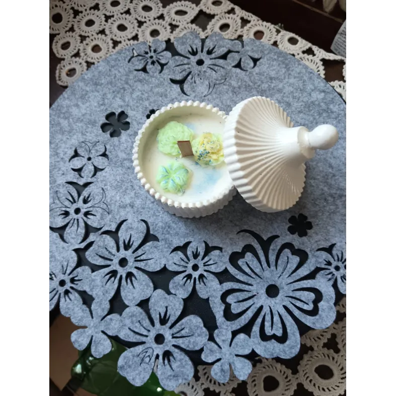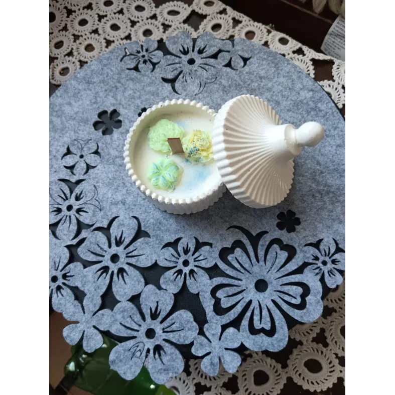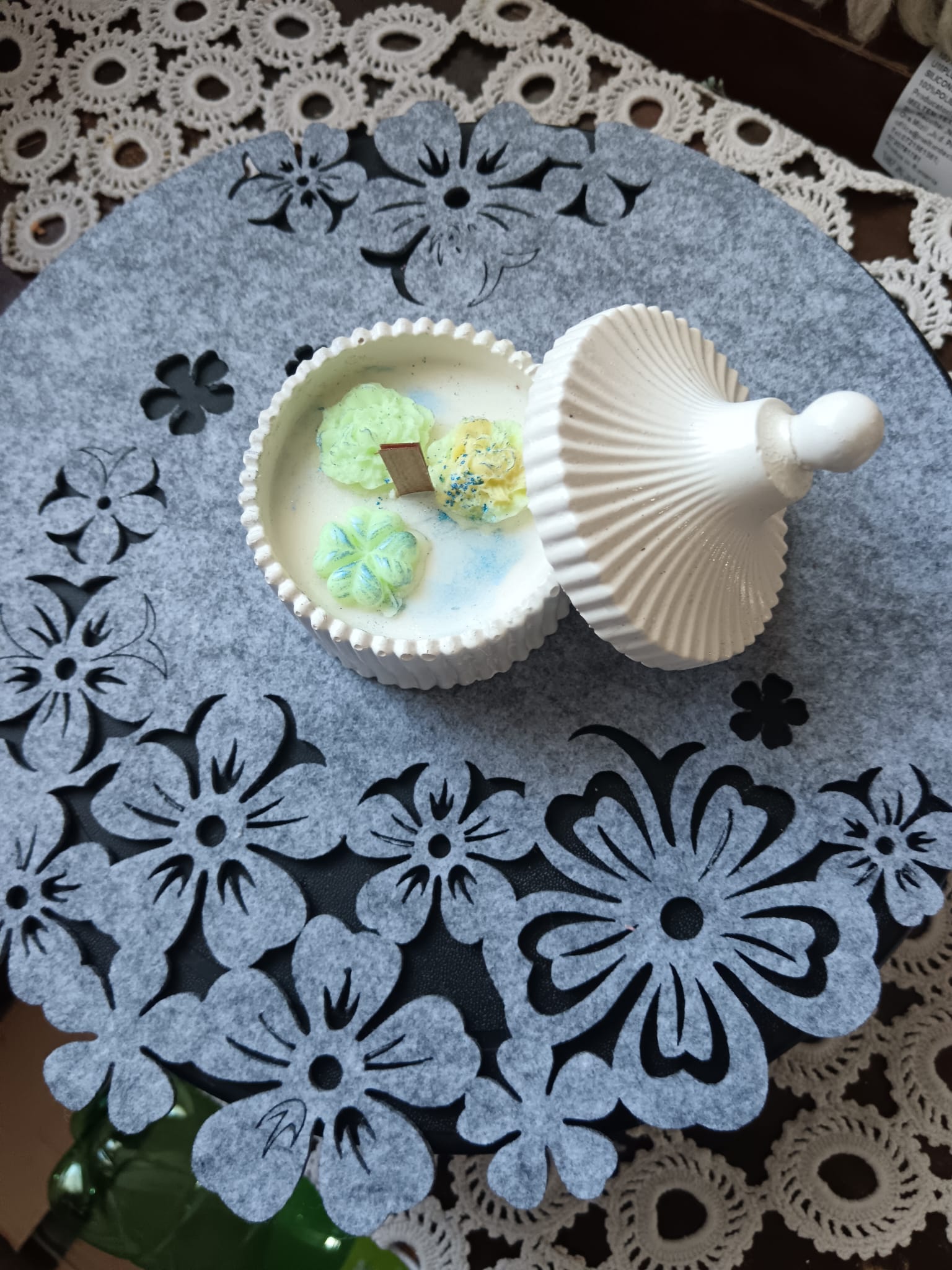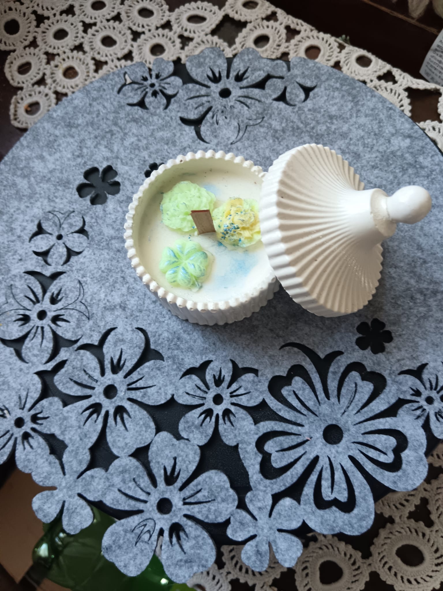 Lumânare parfumată, într-un recipient ceramic turnat manual.