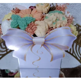 Aranjament realizat din ceară naturală de soia cu parfumuri subtile. Se pot personaliza după preferință atât culorile cât și parfumul și modelul de flori!