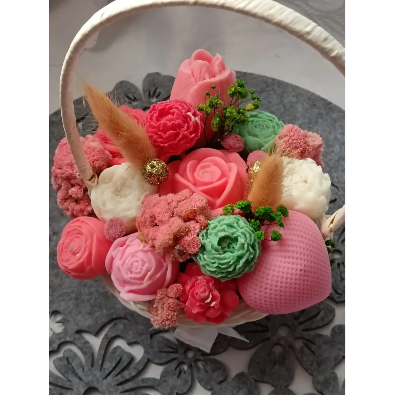Aranjament realizat din ceară naturală de soia cu parfumuri subtile. Se pot personaliza după preferință atât culorile cât și parfumul și modelul de flori!