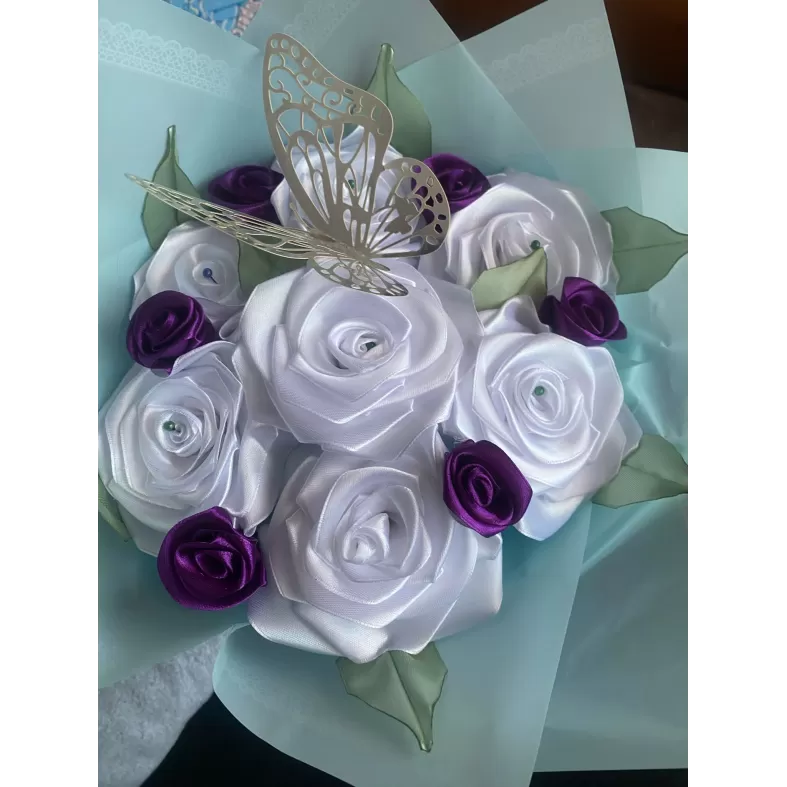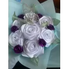 Buchet trandafiri satin 7buc trandafiri mari albi +6 boboci trandafiri mov .