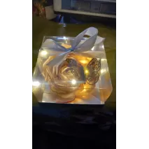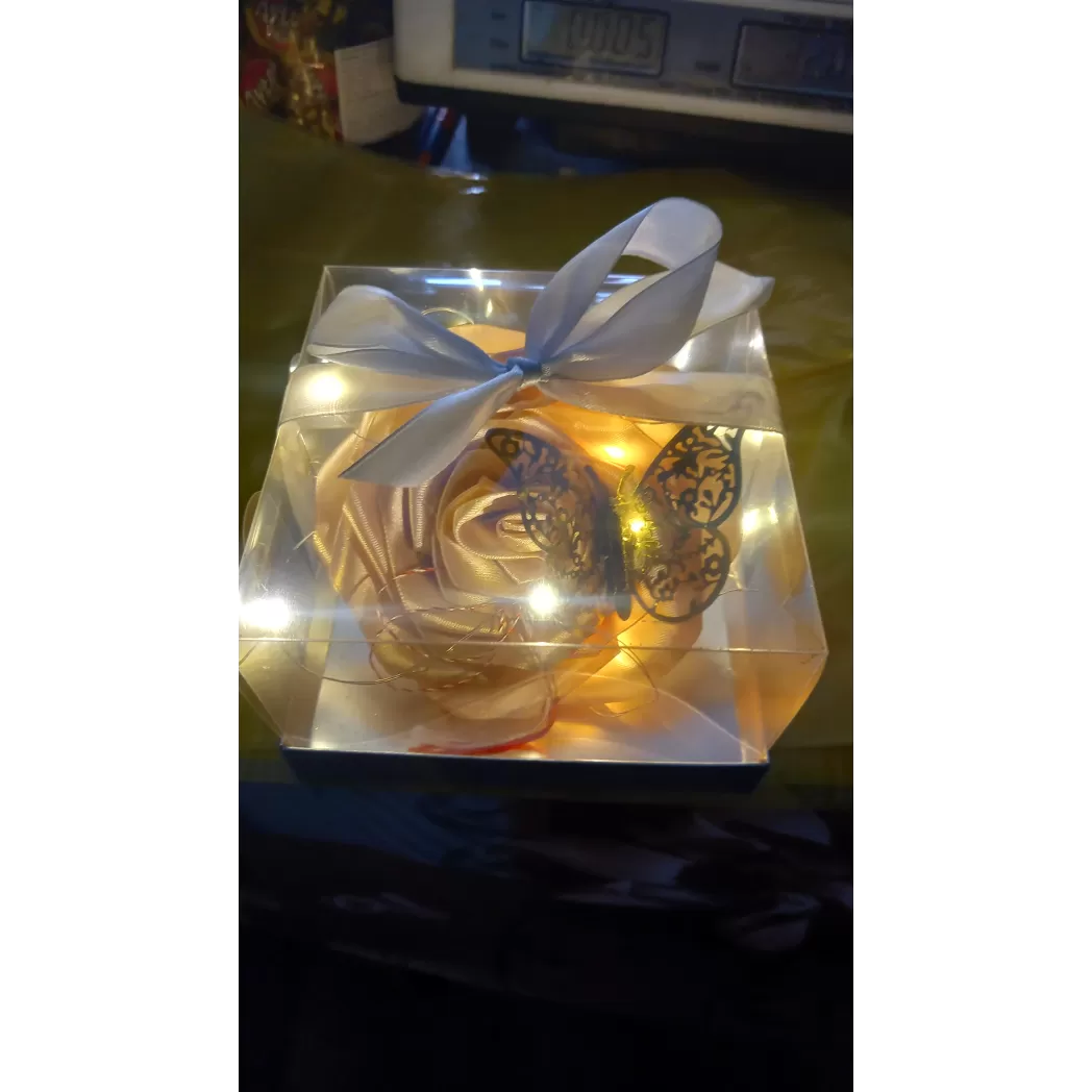 Trandafir din satin cu instalatie care funcționează  pe baterii ag1, ambalat in cutie acetofan 12 ×12×7 cm.