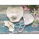 Set bebelusi pentru prima poza din viata lui. Este lucrat din fire special create pentru pielea fina si delicata a bebelusilor.