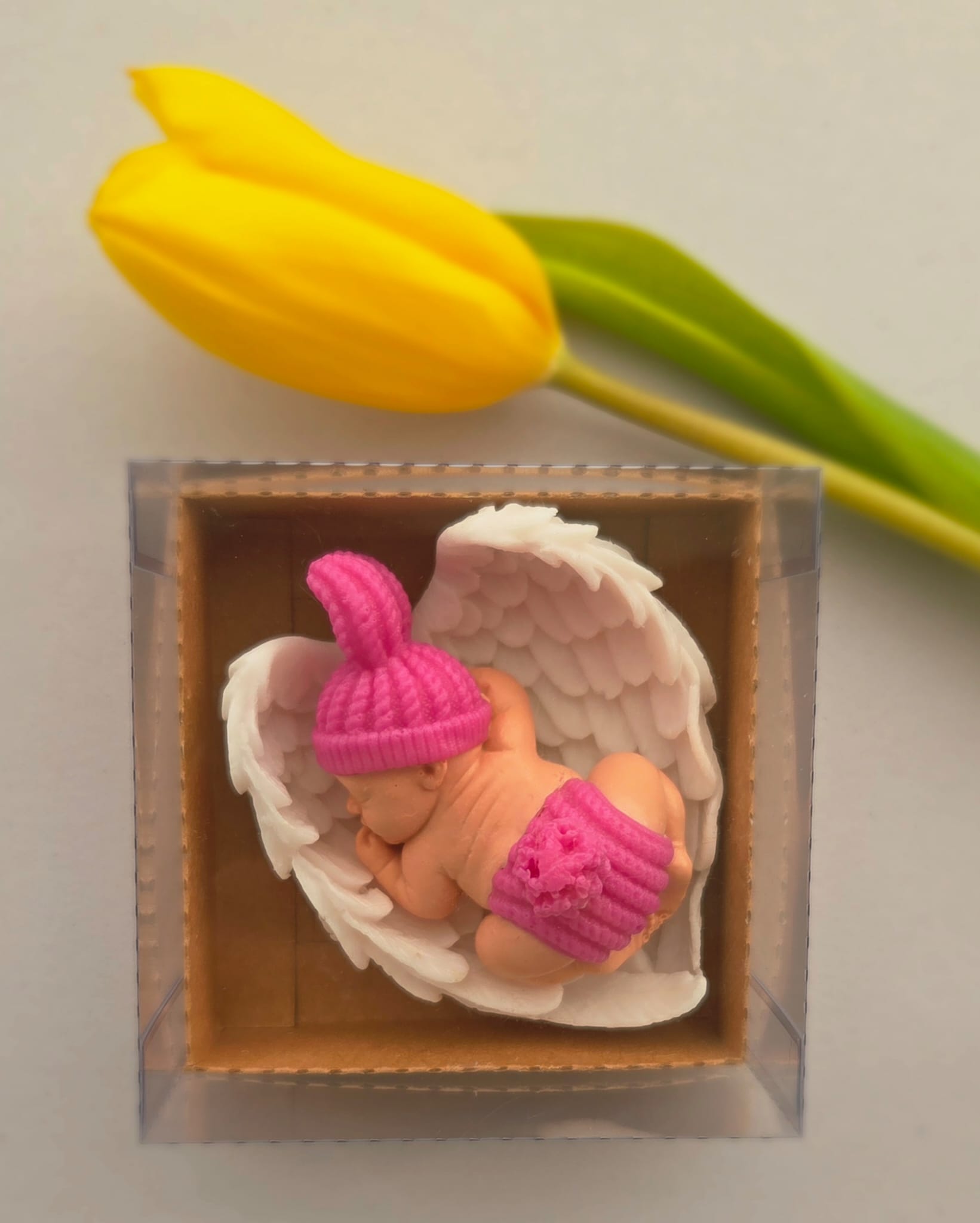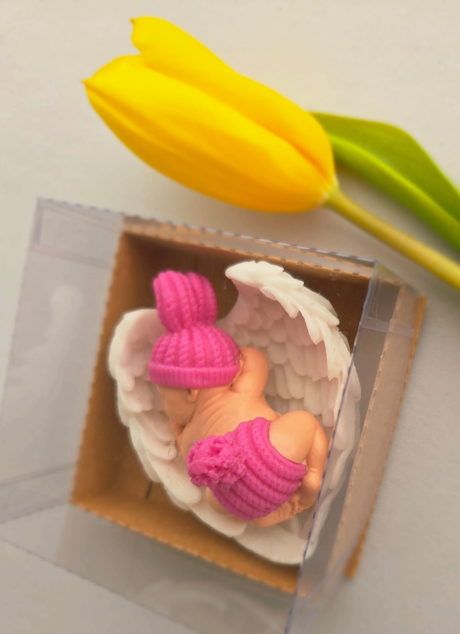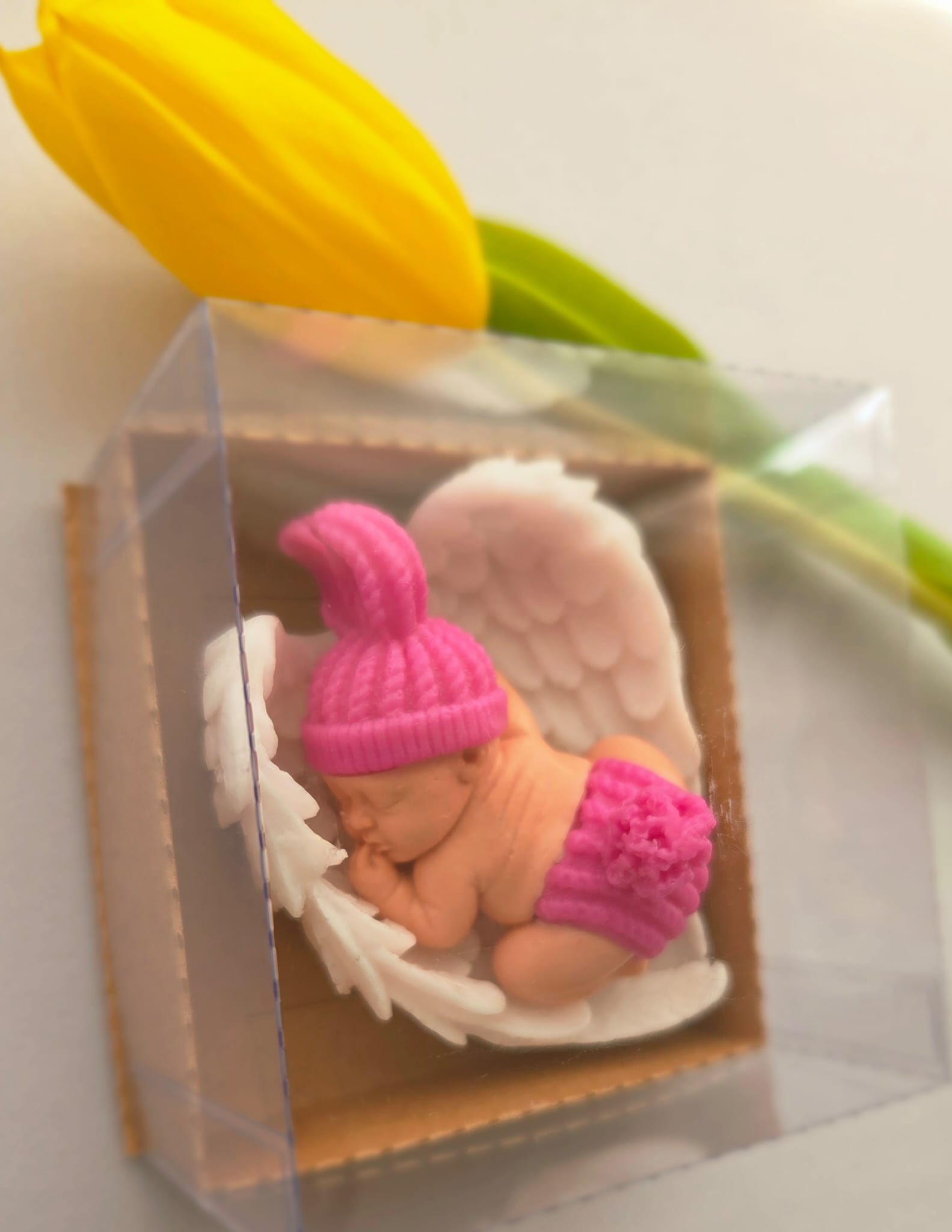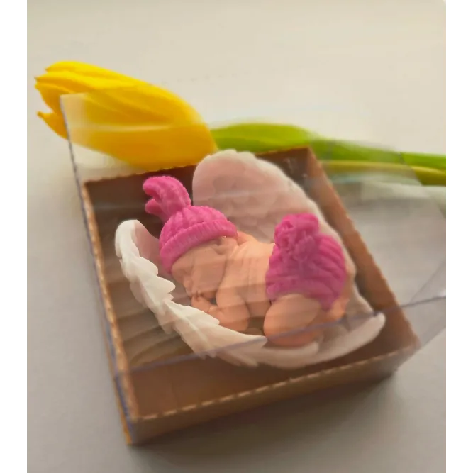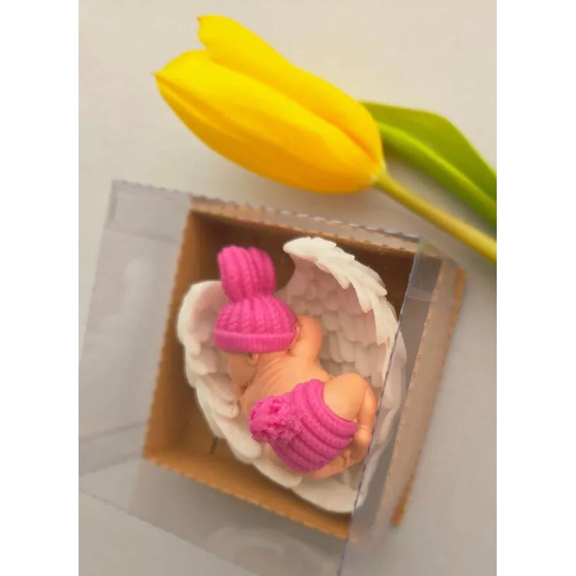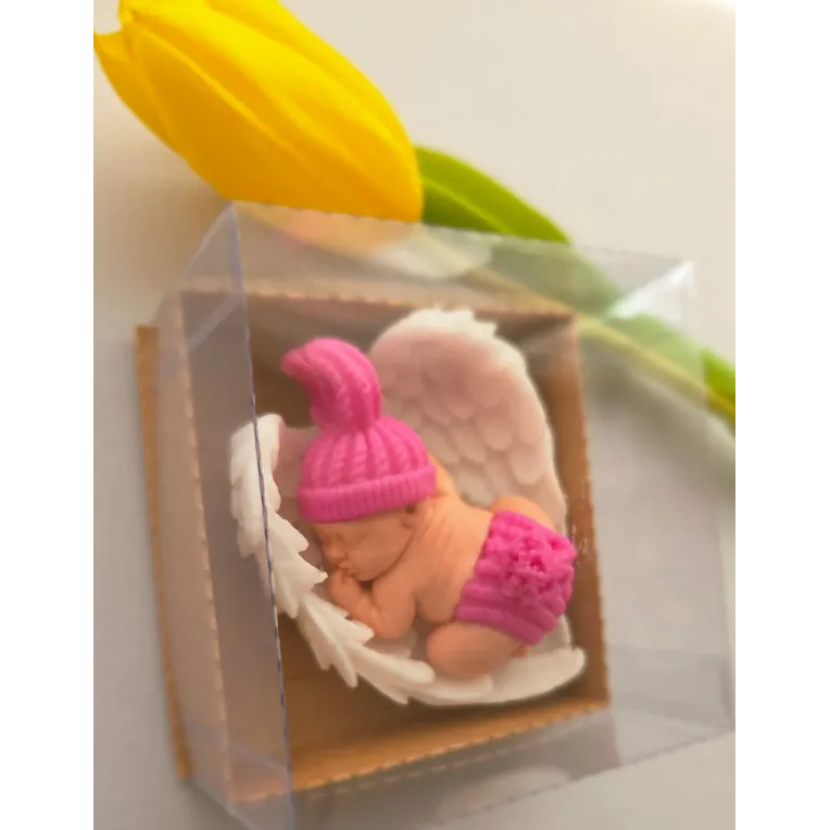 Adăugați un strop de drăgălășenie și eleganță evenimentului special al micuțului dumneavoastră cu această marturie de botez unică! Confecționată manual din sapun natural de înaltă calitate, această figurină adorabilă reprezintă un bebelus pe aripioare albe, simbolizând puritatea și bucuria noii vieți.