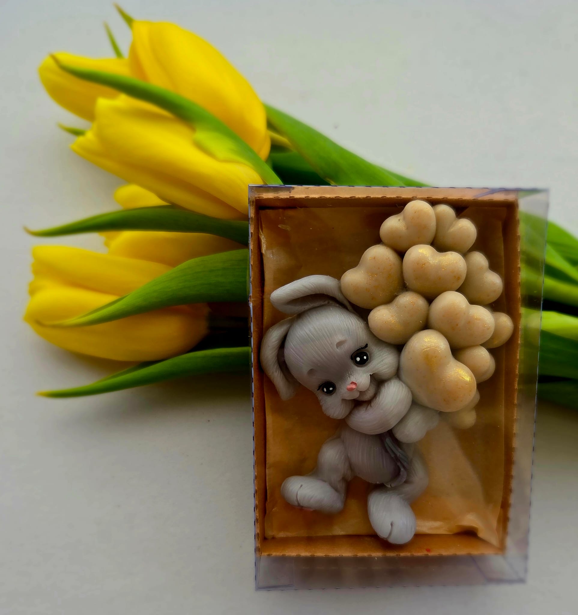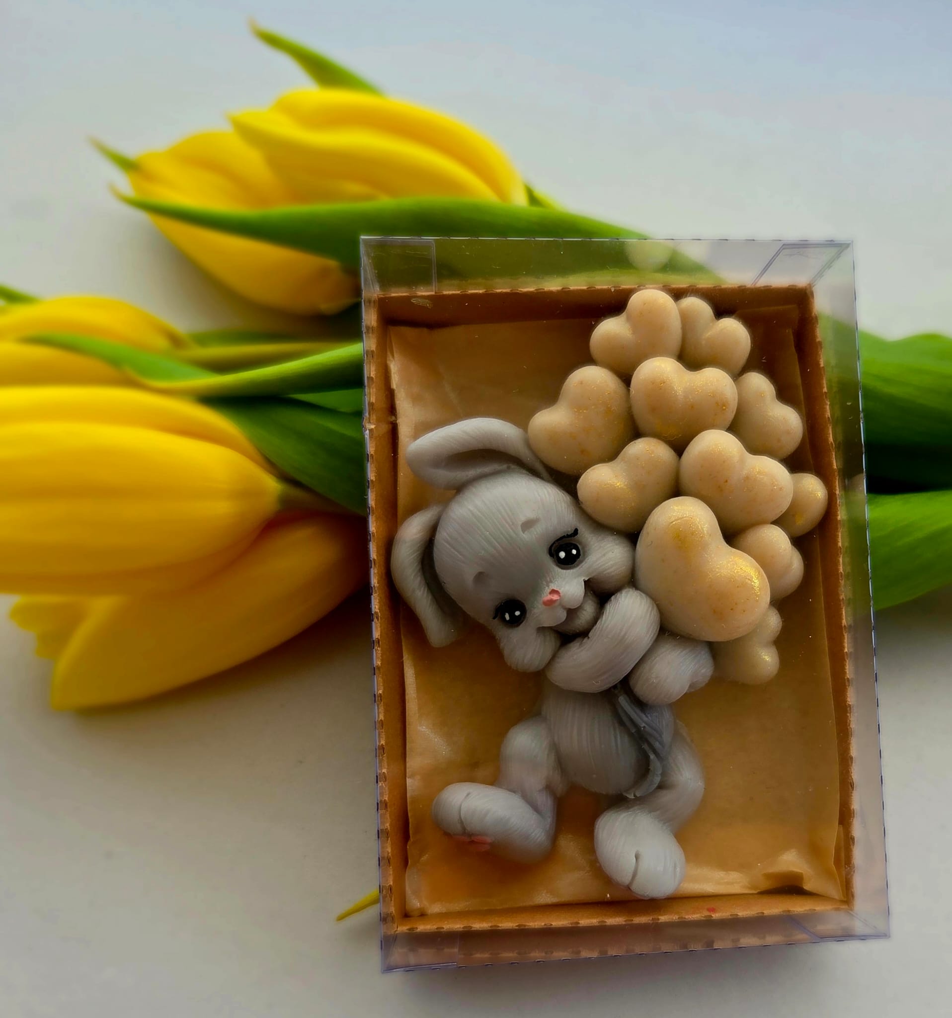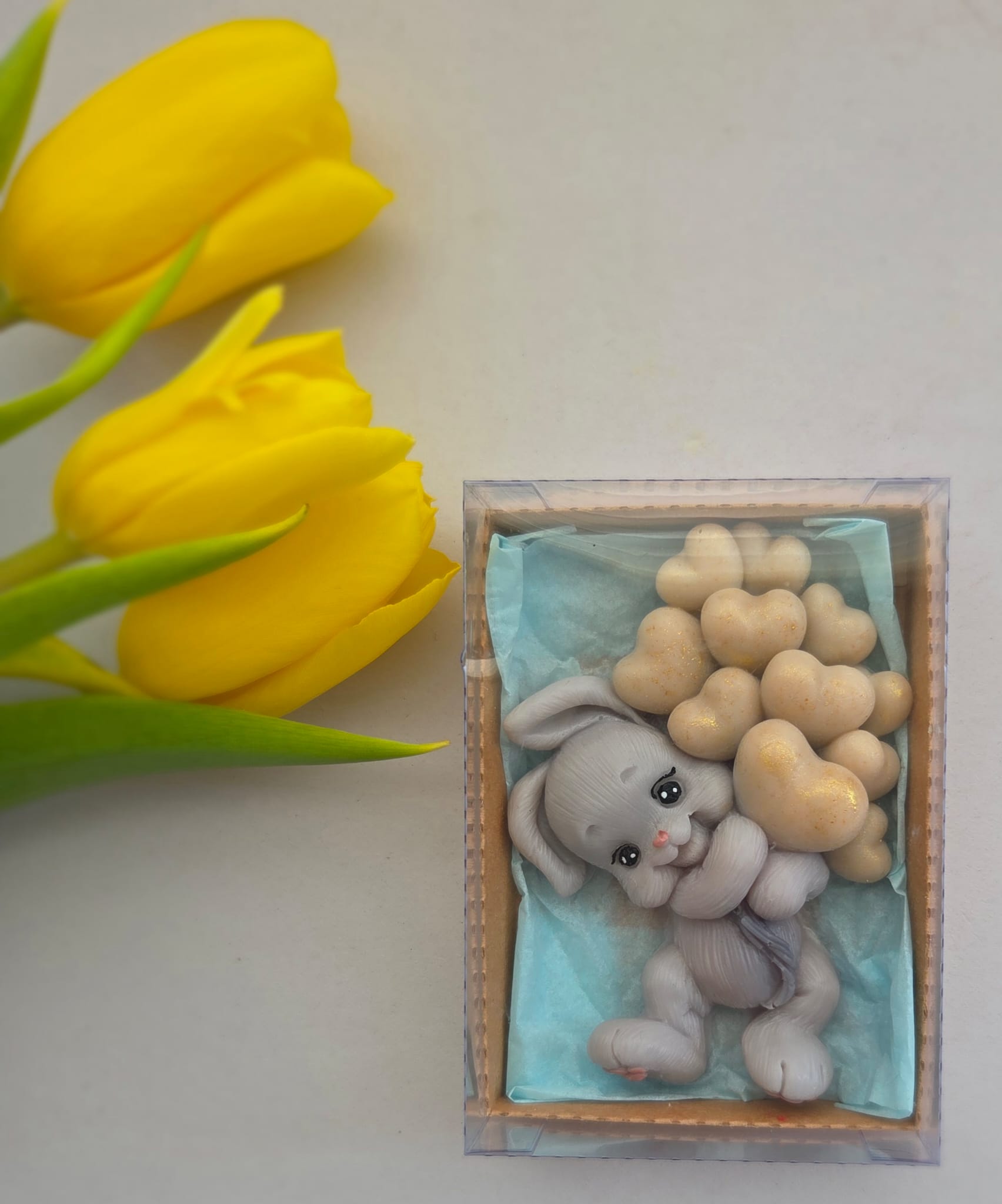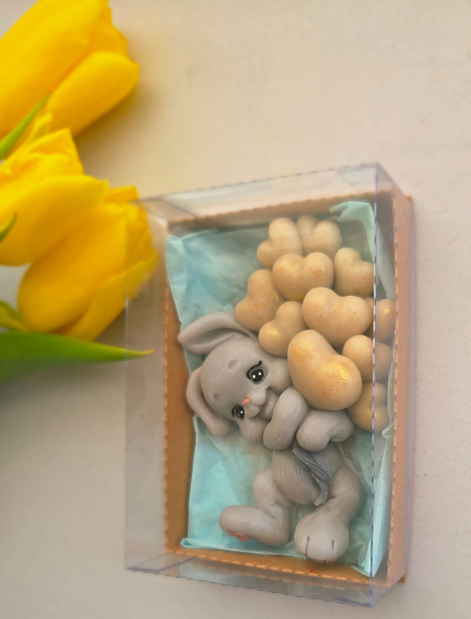 Adăugați un strop de drăgălășenie și eleganță evenimentului special al micuțului dumneavoastră cu această marturie de botez unică! Confecționată manual din sapun natural de înaltă calitate, această figurină adorabilă reprezintă un iepuraș simpatic care ține în brațe un buchet de baloane, simbolizând puritatea și bucuria noii vieți.