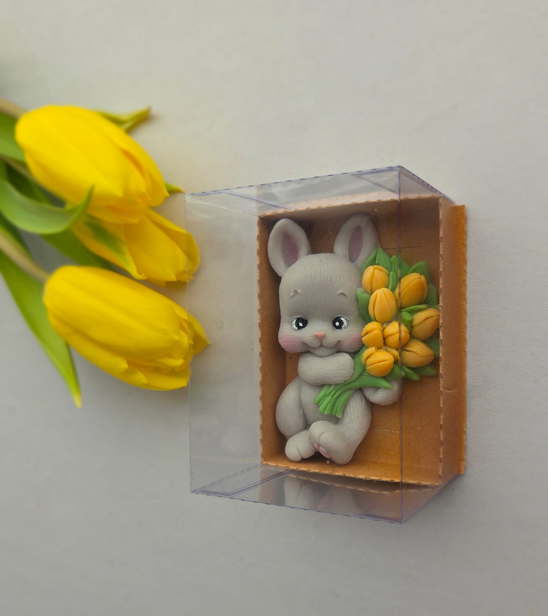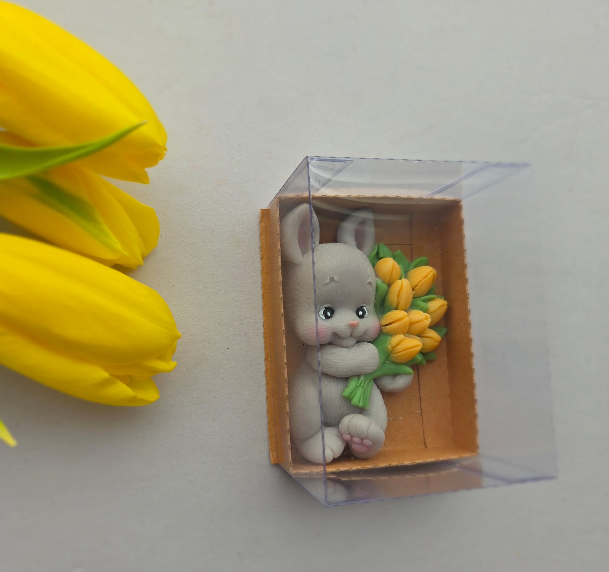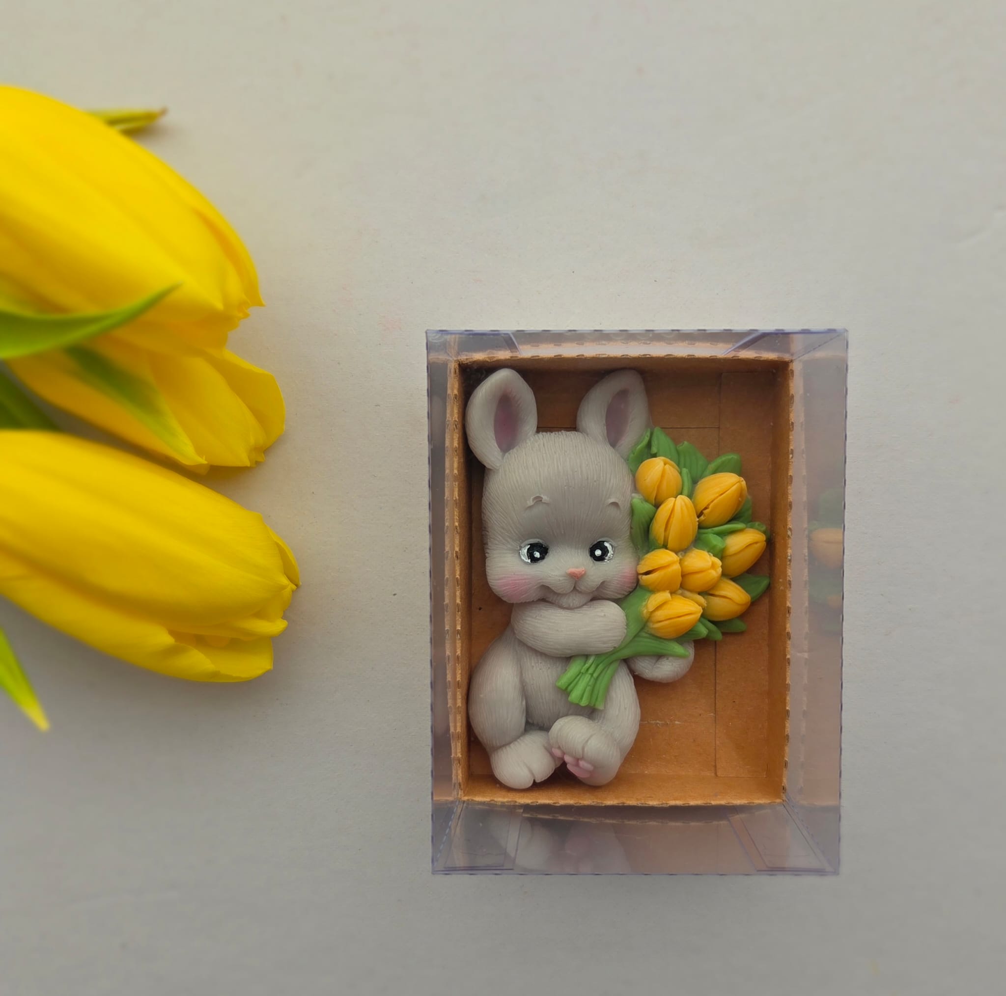 Adăugați un strop de drăgălășenie și eleganță evenimentului special al micuțului dumneavoastră cu această marturie de botez unică! Confecționată manual din sapun natural de înaltă calitate, această figurină adorabilă reprezintă un iepuraș simpatic care ține în brațe un buchet de flori vibrante, simbolizând puritatea și bucuria noii vieți.
