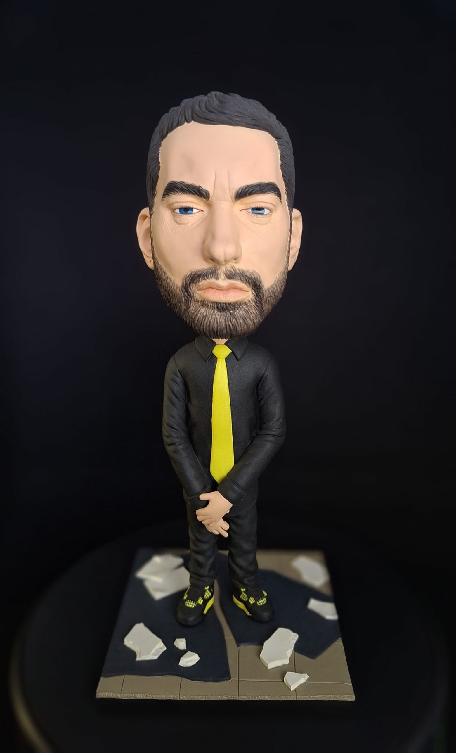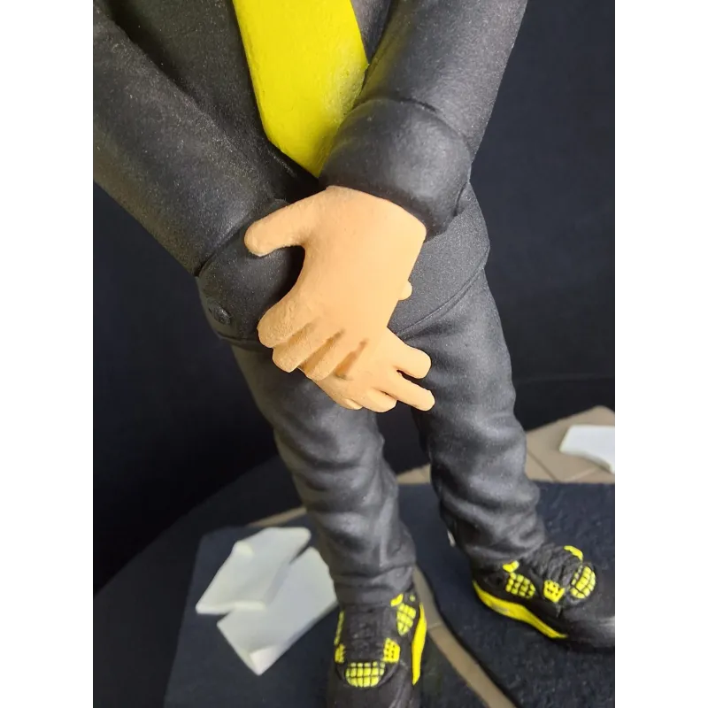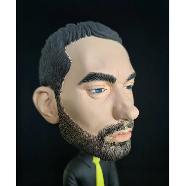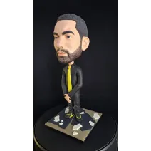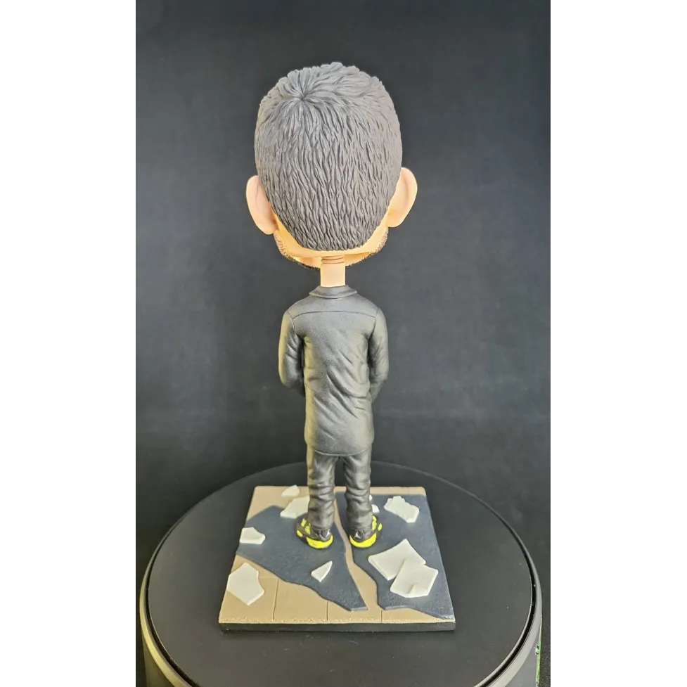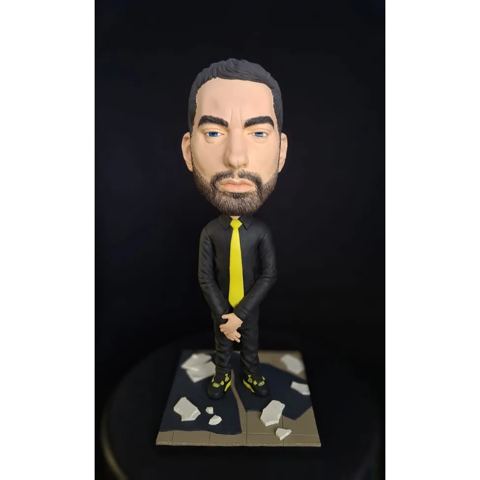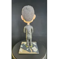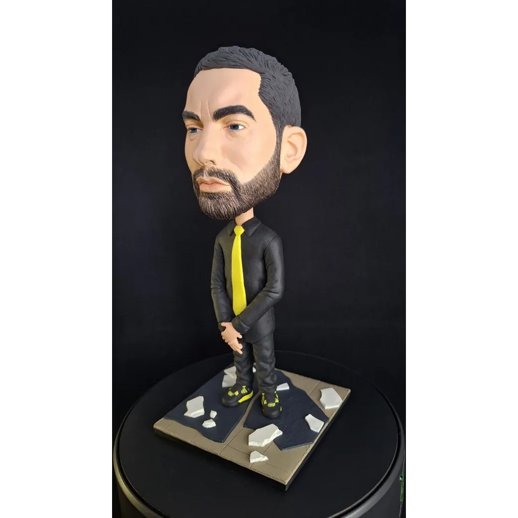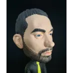 Figurină realizată manual, inspirată de estetica unui artist urban emblematic, reinterpretat într-un stil caricatural cu accent pe expresivitate și detalii. Proporțiile exagerate ale capului, privirea intensă și postura aparent calmă creează un contrast puternic între forță și control interior.