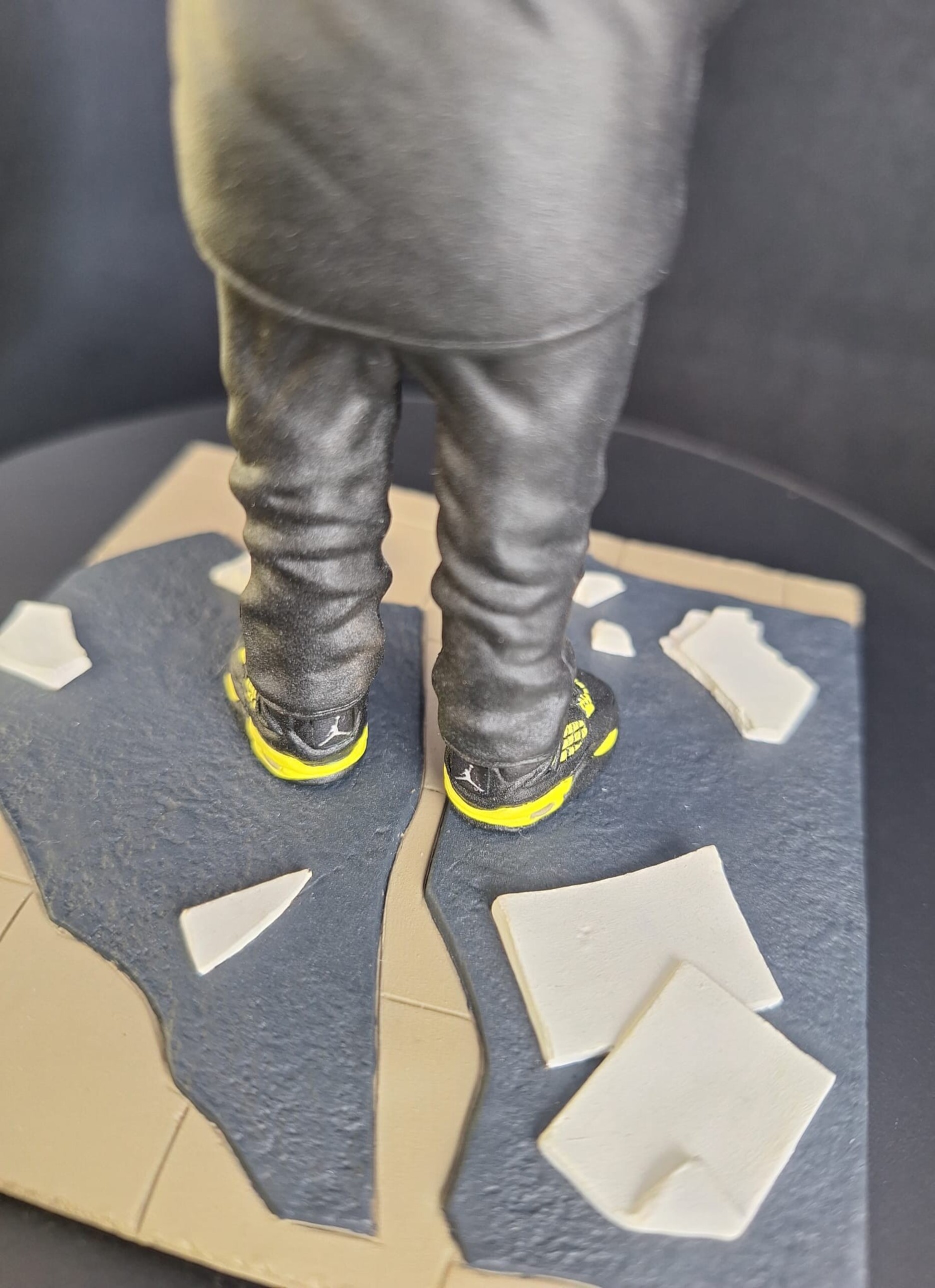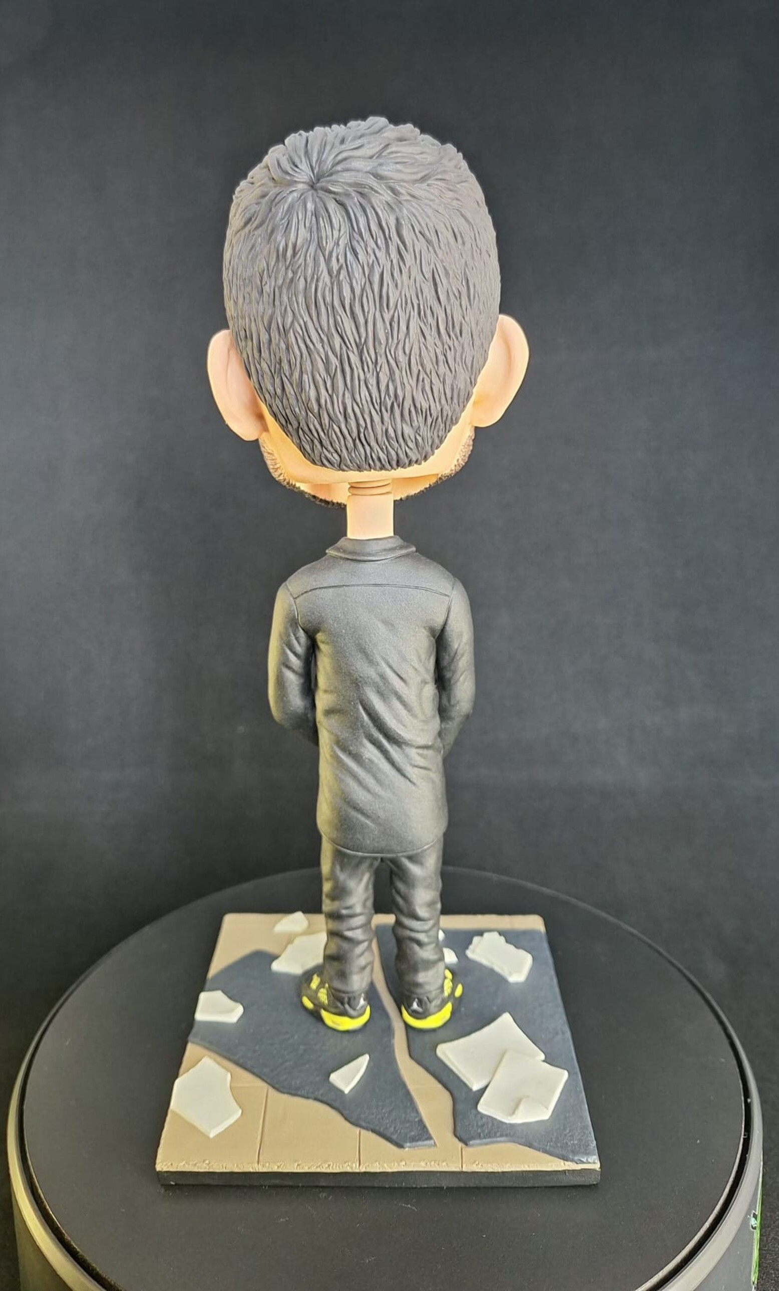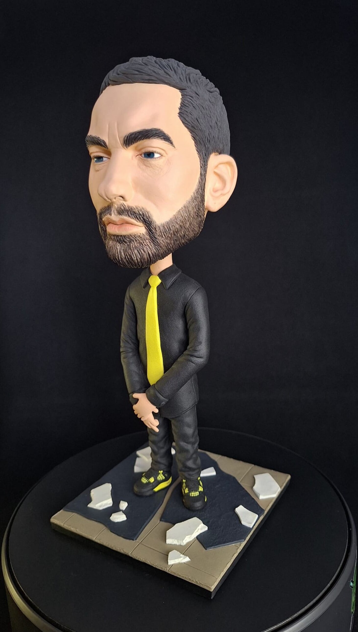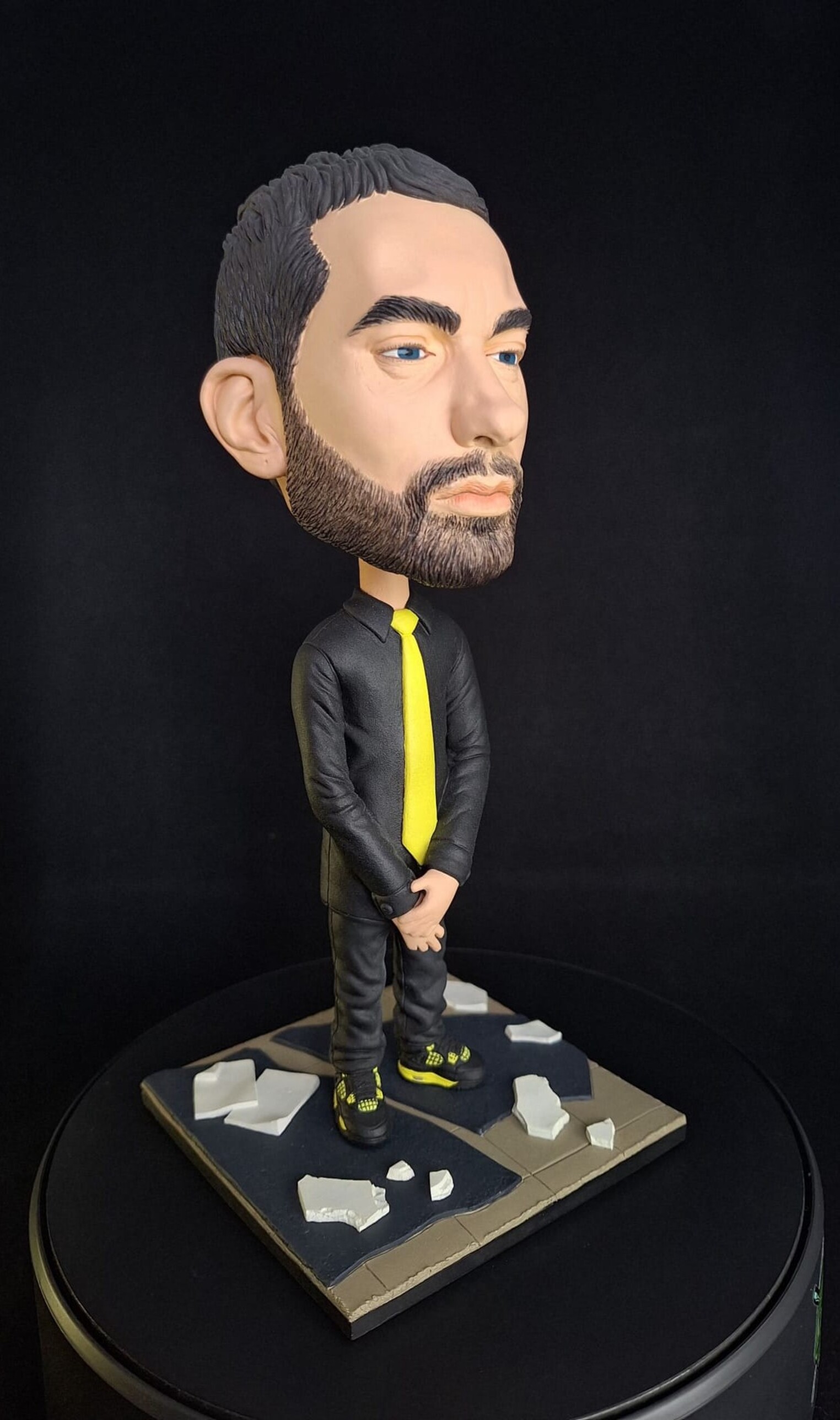 Figurină realizată manual, inspirată de estetica unui artist urban emblematic, reinterpretat într-un stil caricatural cu accent pe expresivitate și detalii. Proporțiile exagerate ale capului, privirea intensă și postura aparent calmă creează un contrast puternic între forță și control interior.