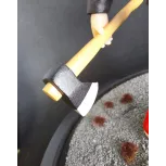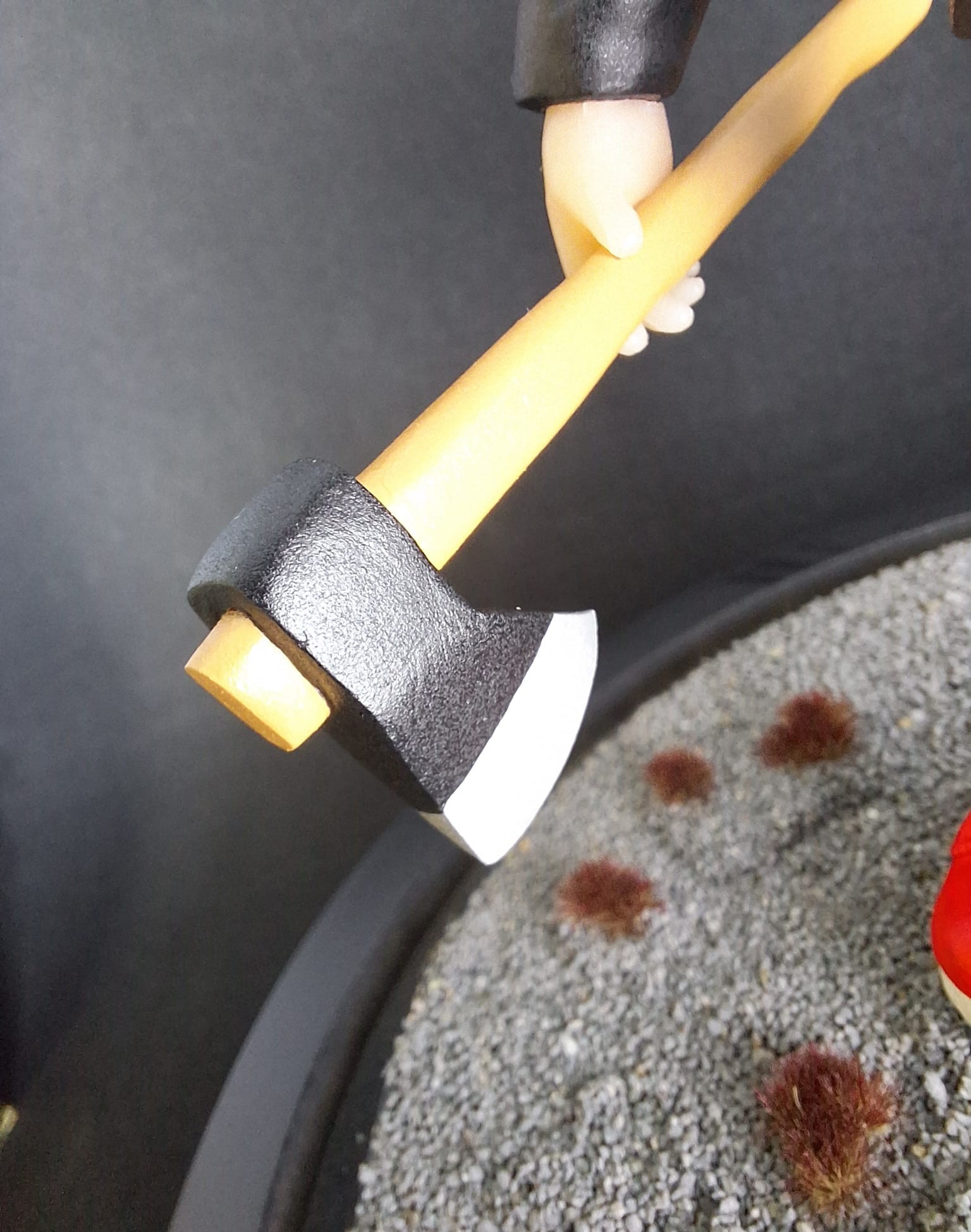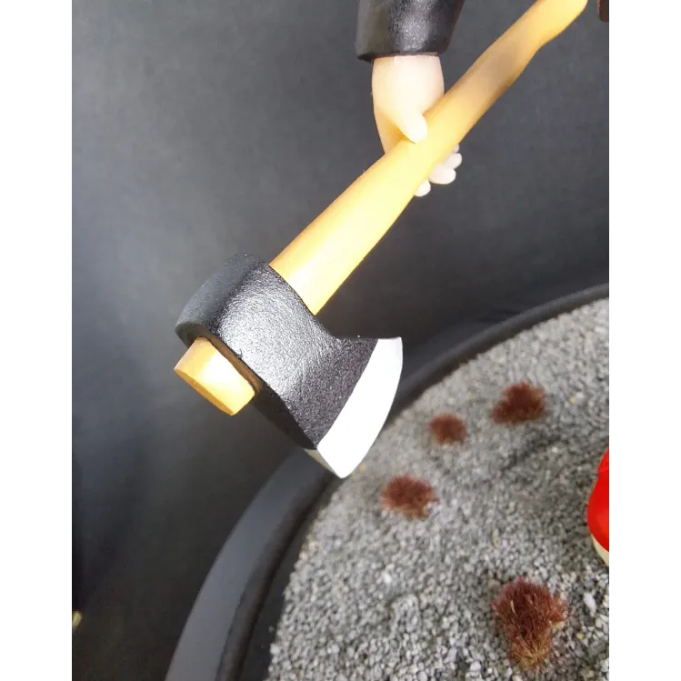 Personajul este redat într-o postură statică, dar tensionată, cu accesoriu sculptural (topor), ce contribuie la narațiunea vizuală a piesei.