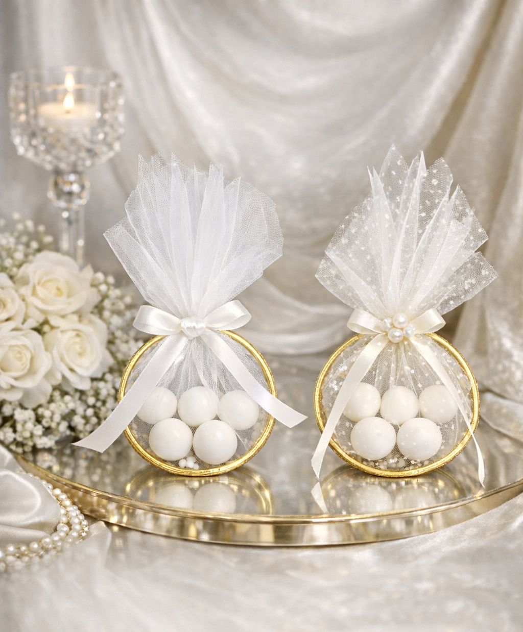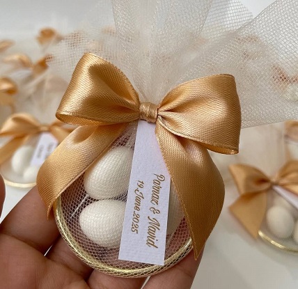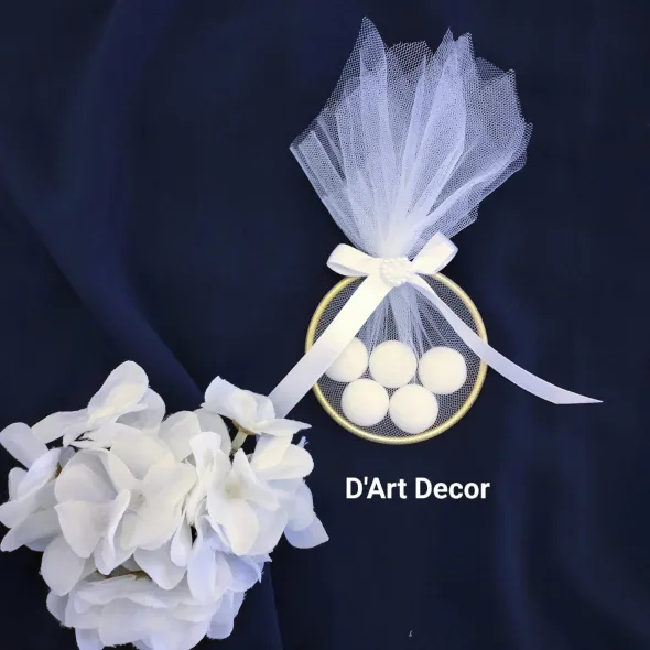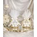 Mărturie de nuntă elegantă, cu inel auriu, umplută cu bomboane albe, ambalate delicat în tulle fin.Designul rafinat se potrivește perfect atât nunților clasice, cât și celor moderne.Un mod elegant și plin de rafinament de a le mulțumi invitaților pentru prezență.