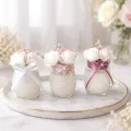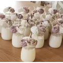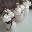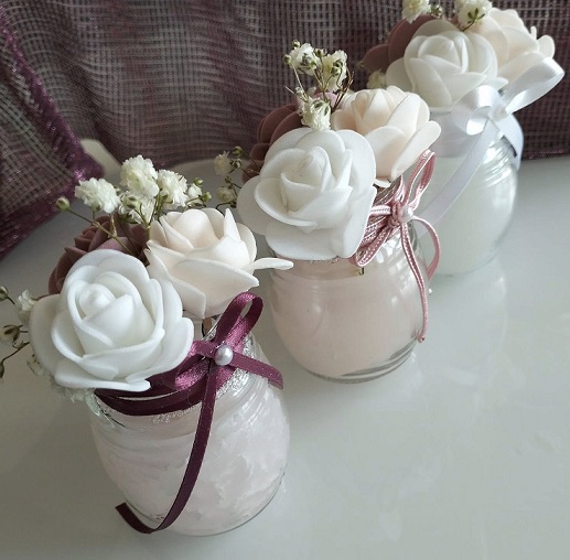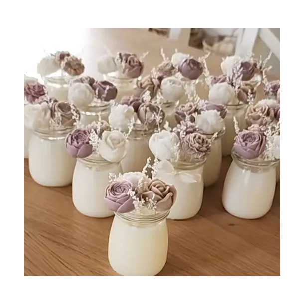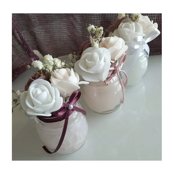 Turnată direct într-un recipient din sticlă, această lumânare este decorată cu flori delicate și panglici fine, devenind un adevărat element decorativ.