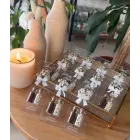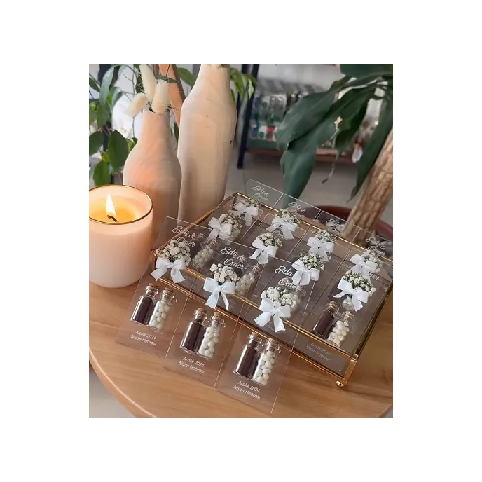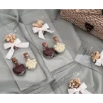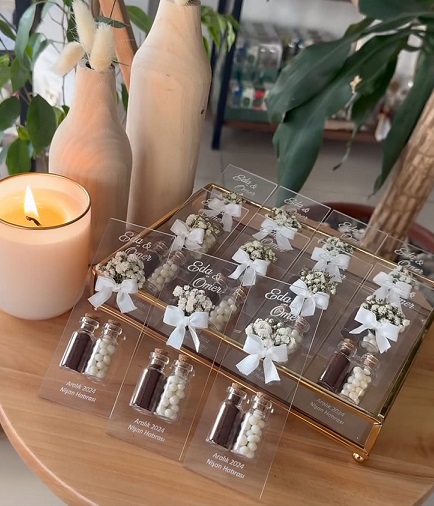 Borcanele elegante din sticlă, umplute cu cafea turcească aromată și delicate bucățele de ciocolată, reprezintă alegerea perfectă pentru a marca orice eveniment cu stil. Fiecare detaliu este atent gândit – de la panglica albă sofisticată până la accentele florale care adaugă un plus de eleganță și farmec.
