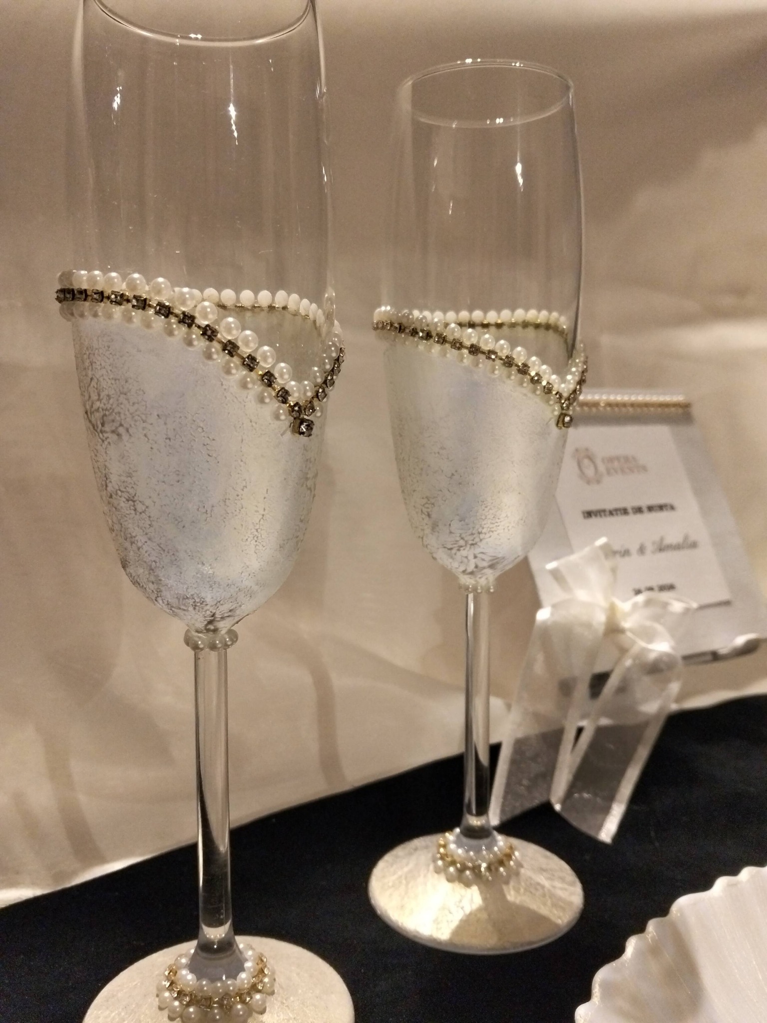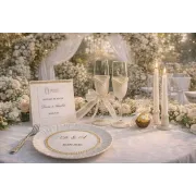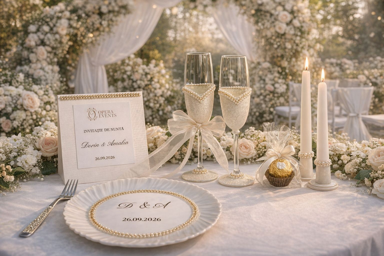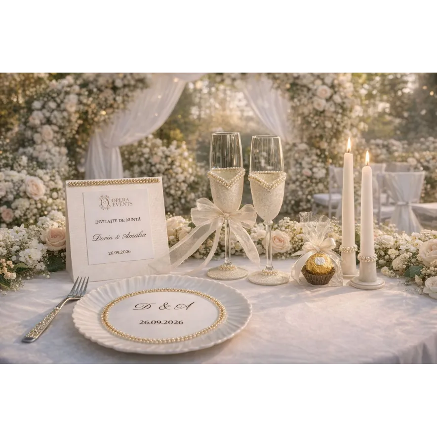 Elementele atent lucrate – decorațiunile cu perle, nuanțele delicate de alb și accentele aurii rafinate – oferă un aspect exclusivist mesei de nuntă.Toate piesele setului sunt realizate într-un stil unitar, creând o atmosferă elegantă și coerentă atât pentru ceremonie, cât și pentru masa festivă.