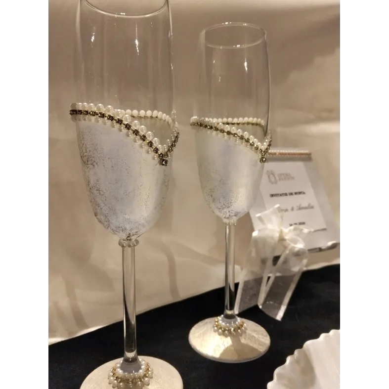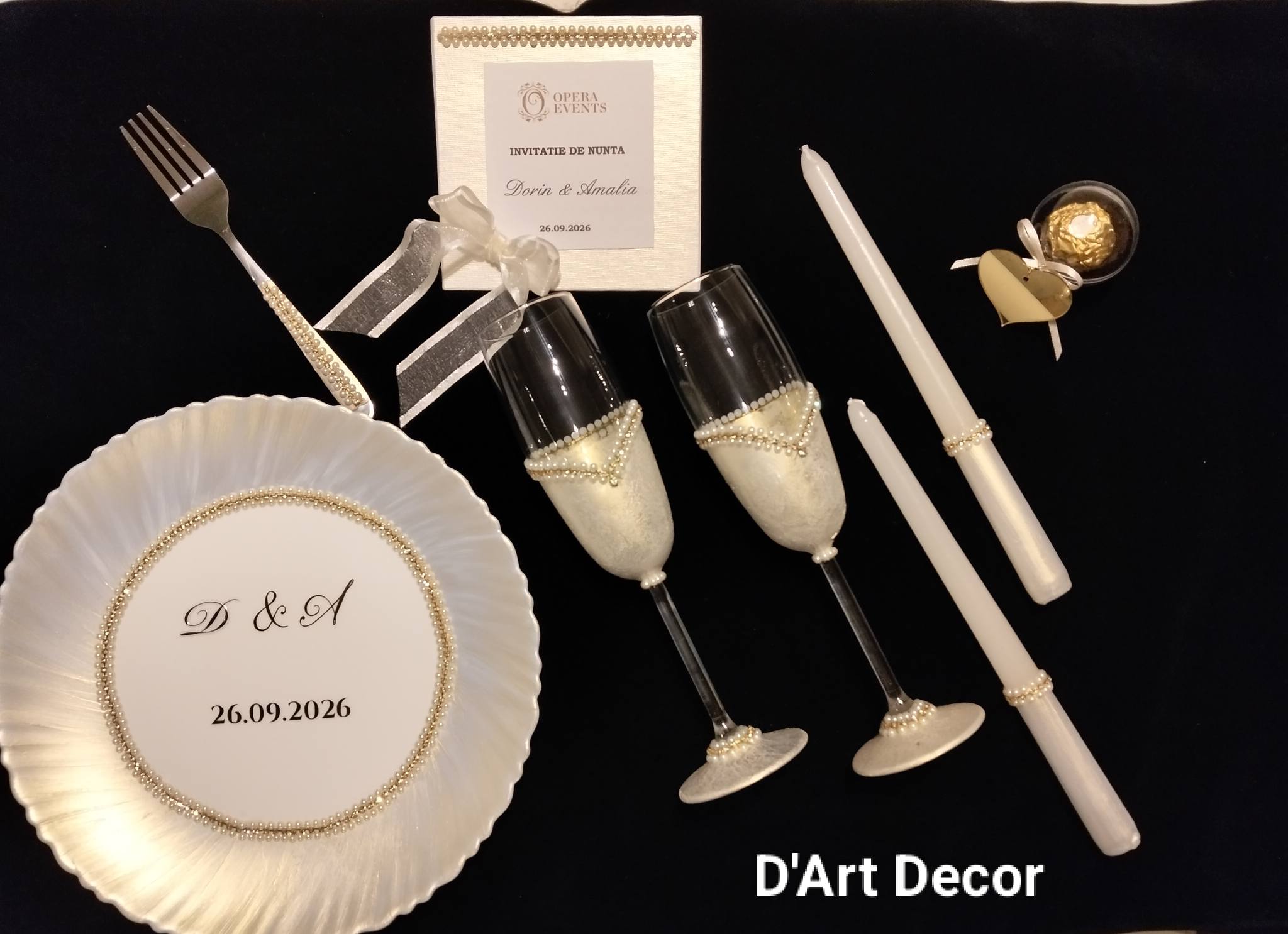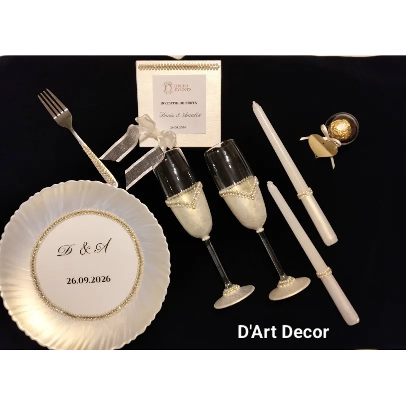 Farfuria personalizată, paharele de șampanie decorate, lumânările și invitația elegantă contribuie la transformarea zilei nunții într-o amintire de neuitat.Setul Daniela este alegerea ideală pentru cuplurile care apreciază rafinamentul, romantismul și atenția la detalii, dorindu-și ca fiecare element al nunții să reflecte iubirea și eleganța.
