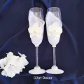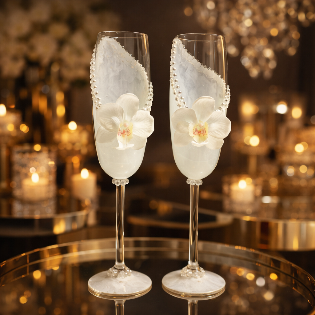 Paharele sunt decorate cu un design alb-lăptos special, completat de perle fine și accente strălucitoare. Elementul central este floarea de orhidee realizată manual, care oferă un aspect exclusiv și romantic.