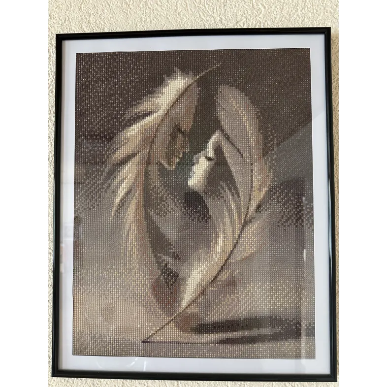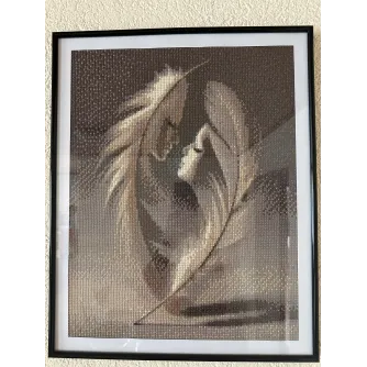 Acest tablou deosebit,realizat manual in tehnica diamond painting,prezinta o compozitie artistica cu dubla interpretare,doua pene elegante in care se contureaza subtil chipul unui bartbat si al unei femei.Desingnul transmite iubire,armonie si conexiune profunda,intr-o forma delicata si rafinata.Paleta de culori in tonuri calde de bej si maro ofera un aspect calm si elegant,usor de integrat in orce tip de decor. Efectul stralucitor al pietricelelor adauga un plus de rafinament si unicitate lucrarii.Tabloul are dimensiunea de 40/50.