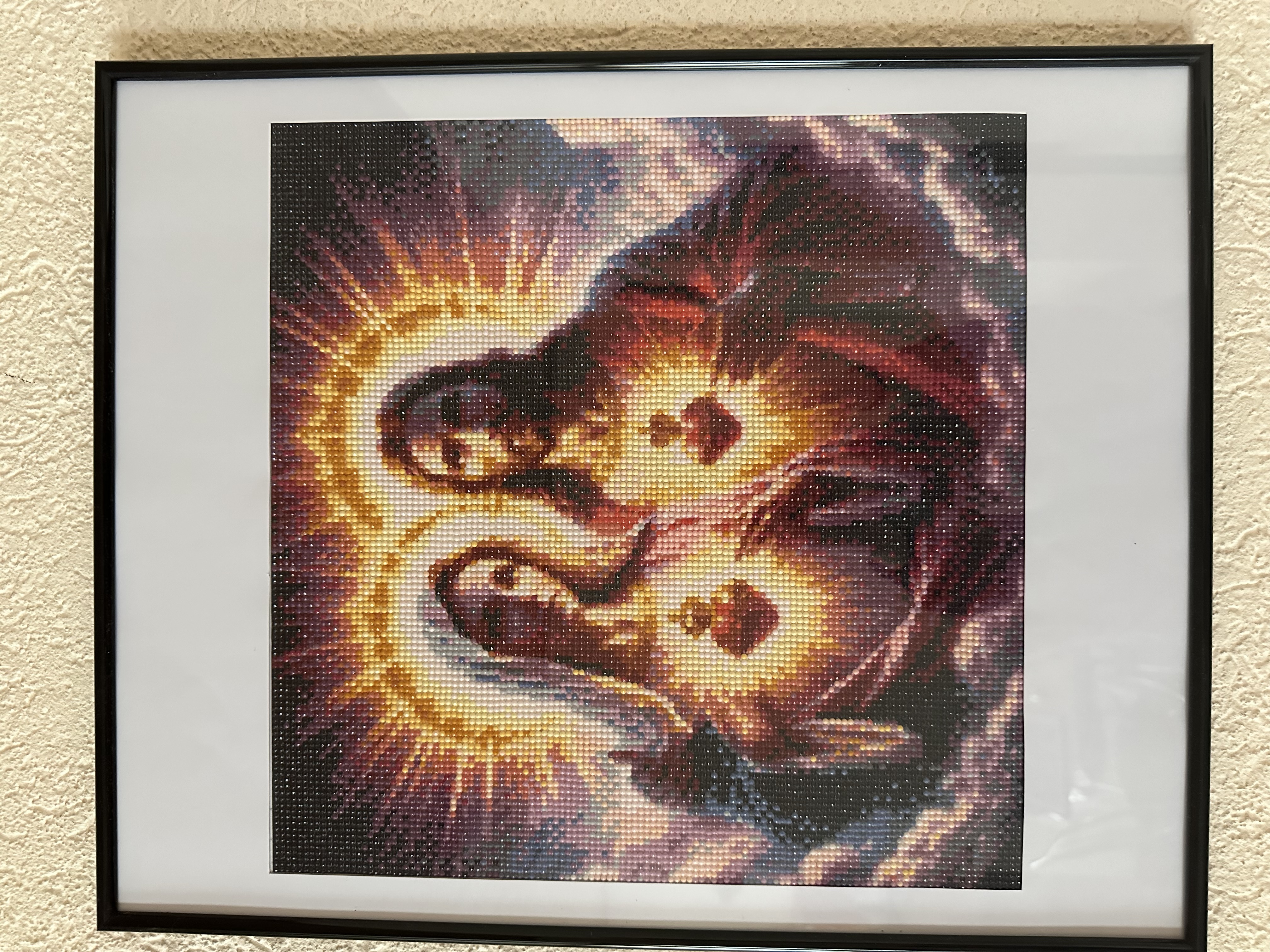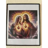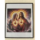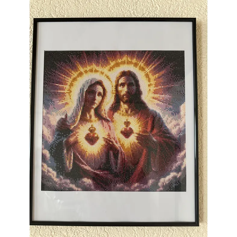 Acest tablou impresionant, realizat manual in tehnica diamond painting,reda o reprezentare simbolica a lui Isus Hristos a Fecioarei Maria,evidentiati prin inimile sacre stralucitoare.Compozitia este pusa in valoare de lumina aurie radianta si de detaliile fine,care ofera profunzime expresivitate lucrarii.Efect vizual deosebit,creat de pietricelele stralucitoare,transforma tabloul intr-un punct de atractie in orice incapere.Este ideal pentru a aduce un plus de spiritualitate,liniste si eleganta in locuinta.Este un tablou de 40/40.