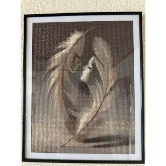 Acest tablou deosebit,realizat manual in tehnica diamond painting,prezinta o compozitie artistica cu dubla interpretare,doua pene elegante in care se contureaza subtil chipul unui bartbat si al unei femei.Desingnul transmite iubire,armonie si conexiune profunda,intr-o forma delicata si rafinata.Paleta de culori in tonuri calde de bej si maro ofera un aspect calm si elegant,usor de integrat in orce tip de decor. Efectul  stralucitor al pietricelelor adauga un plus de rafinament si unicitate lucrarii.Tabloul are dimensiunea de 40/50.