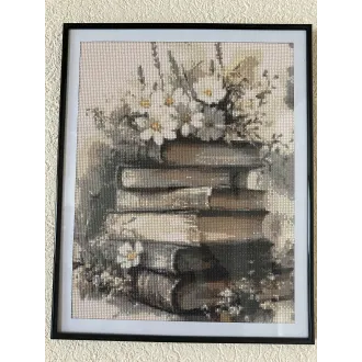 Acest tablou elegant,realizat in stil mozaic(diamond painting),surprinde o compozitie rafinata cu carti vechi suprapuse,decorat cu flori delicate.Paleta de culori neutre,in tonuri calde de bej,crem si maro,ofera un aspect vintage si linistitor,potrivit pentru orice spatiu.Desingnul transmite calm,nostalgie si pasiune pentru lectura,fiind ideal pentru living,dormitor,birou sau chiar spatii de tip biblioteca.Tabloul este de marime 40/50.