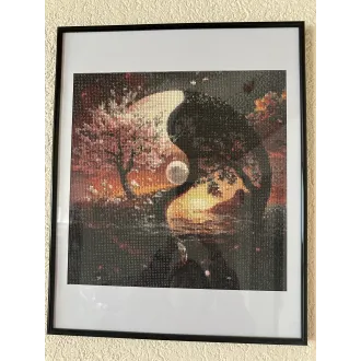 Tablou realizat manual in tehnica diamond painting,reprezentand simbolul Yin-Yang intr-o compozitie artistica cu copac inflorit si luna.Designul evidentiaza echilibrul dintre luna si intuneric,oferind o nota de armonie si rafinament.Culorile intense si efectul stralucitor al pietricelelor creeaza un inpact elegant,potrivit pentru spatiu modern.Tabloul are demensiunea de 40/50.