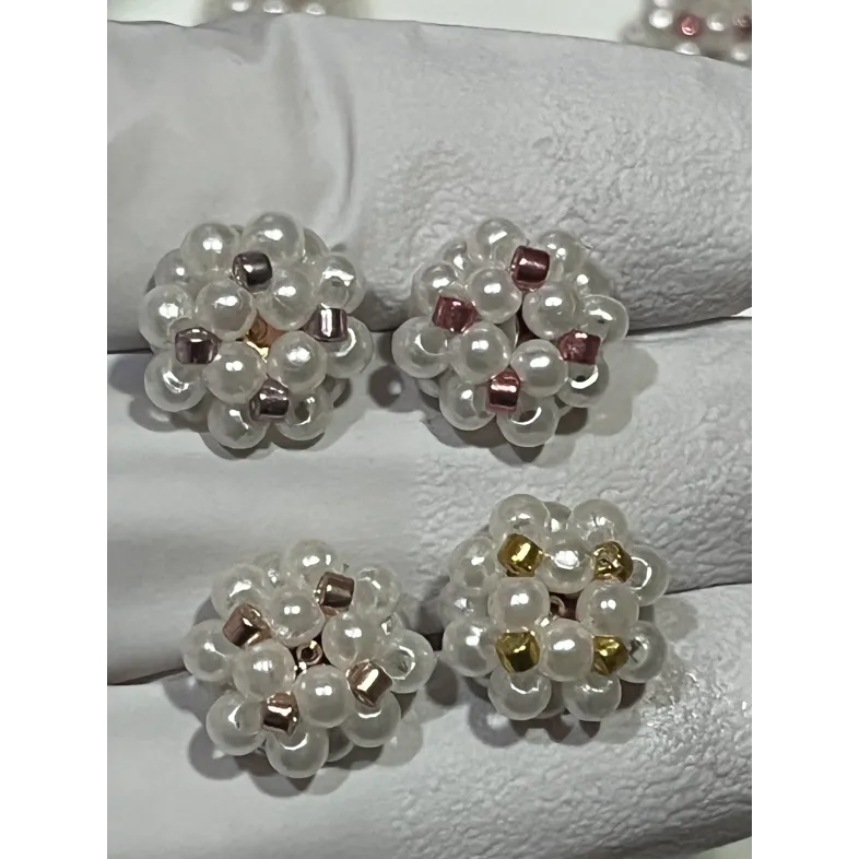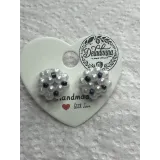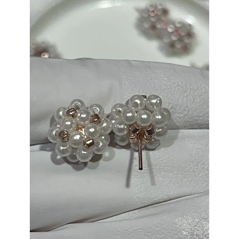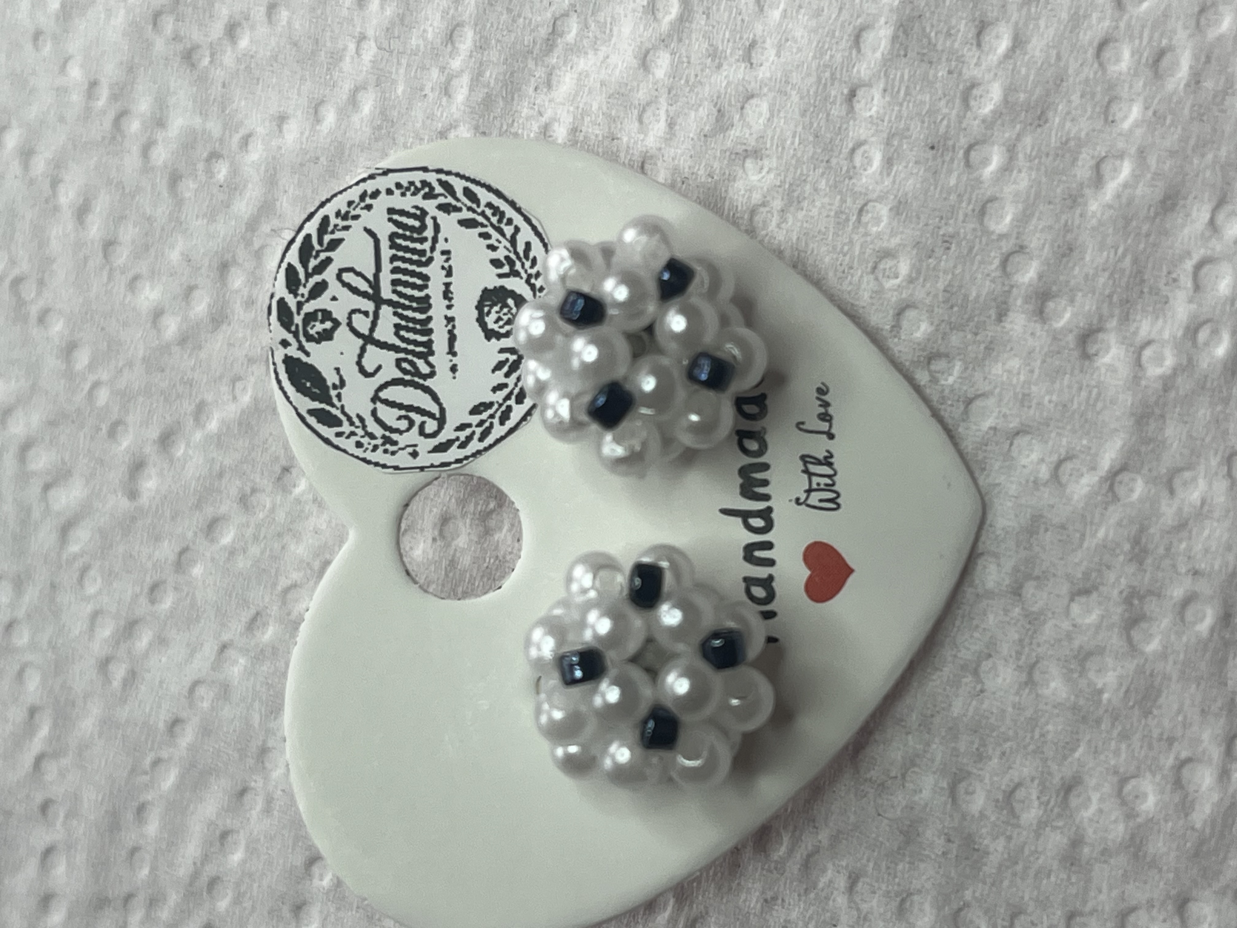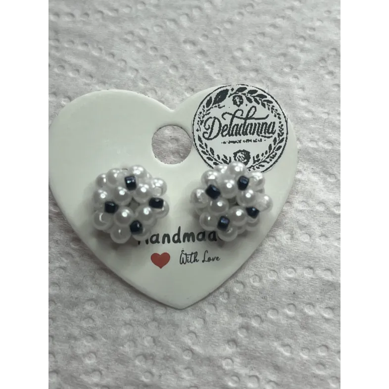 Cercei realizați manual, cu perle albe lucioase și accente negre discrete, pentru un contrast rafinat.