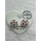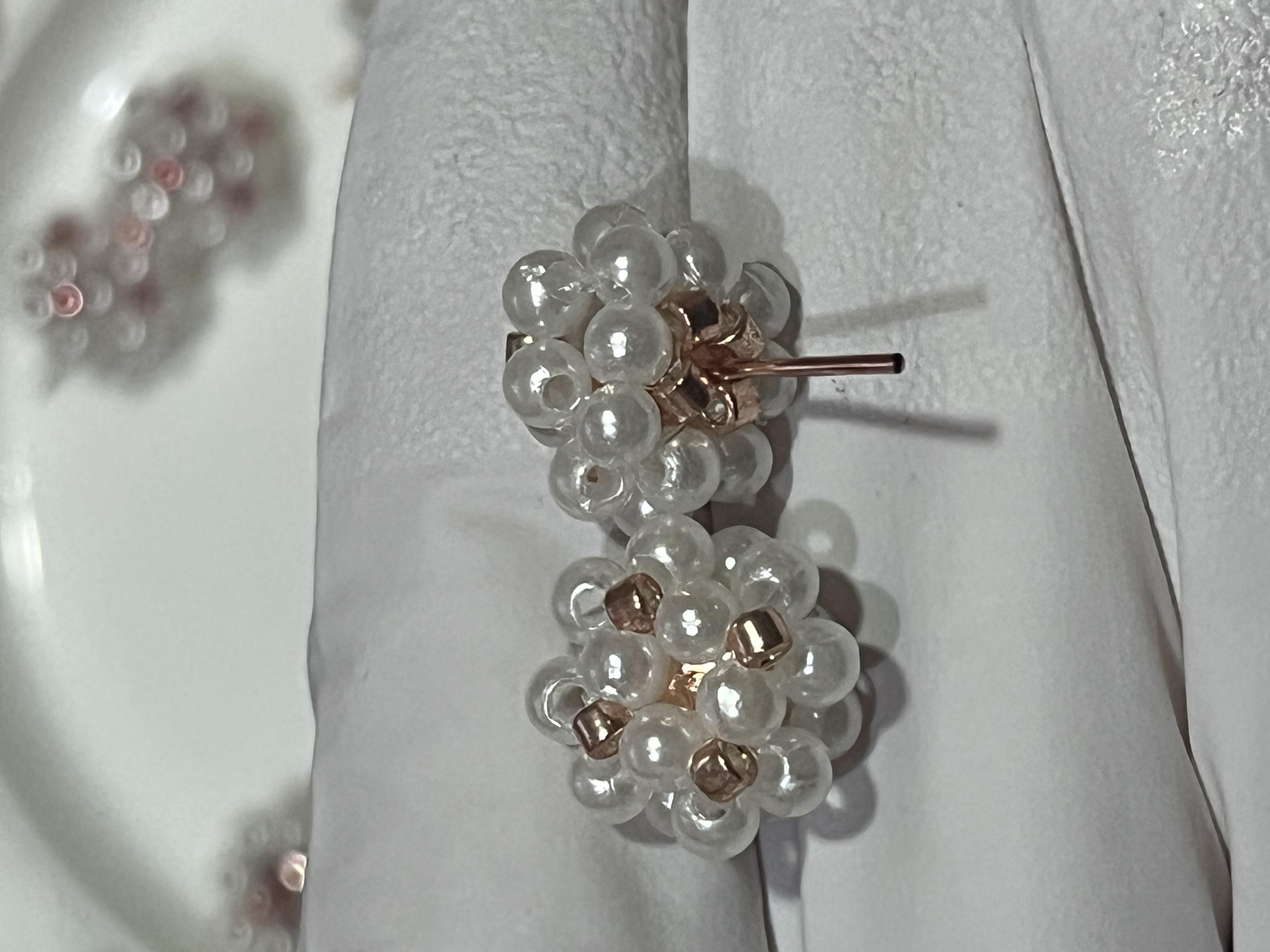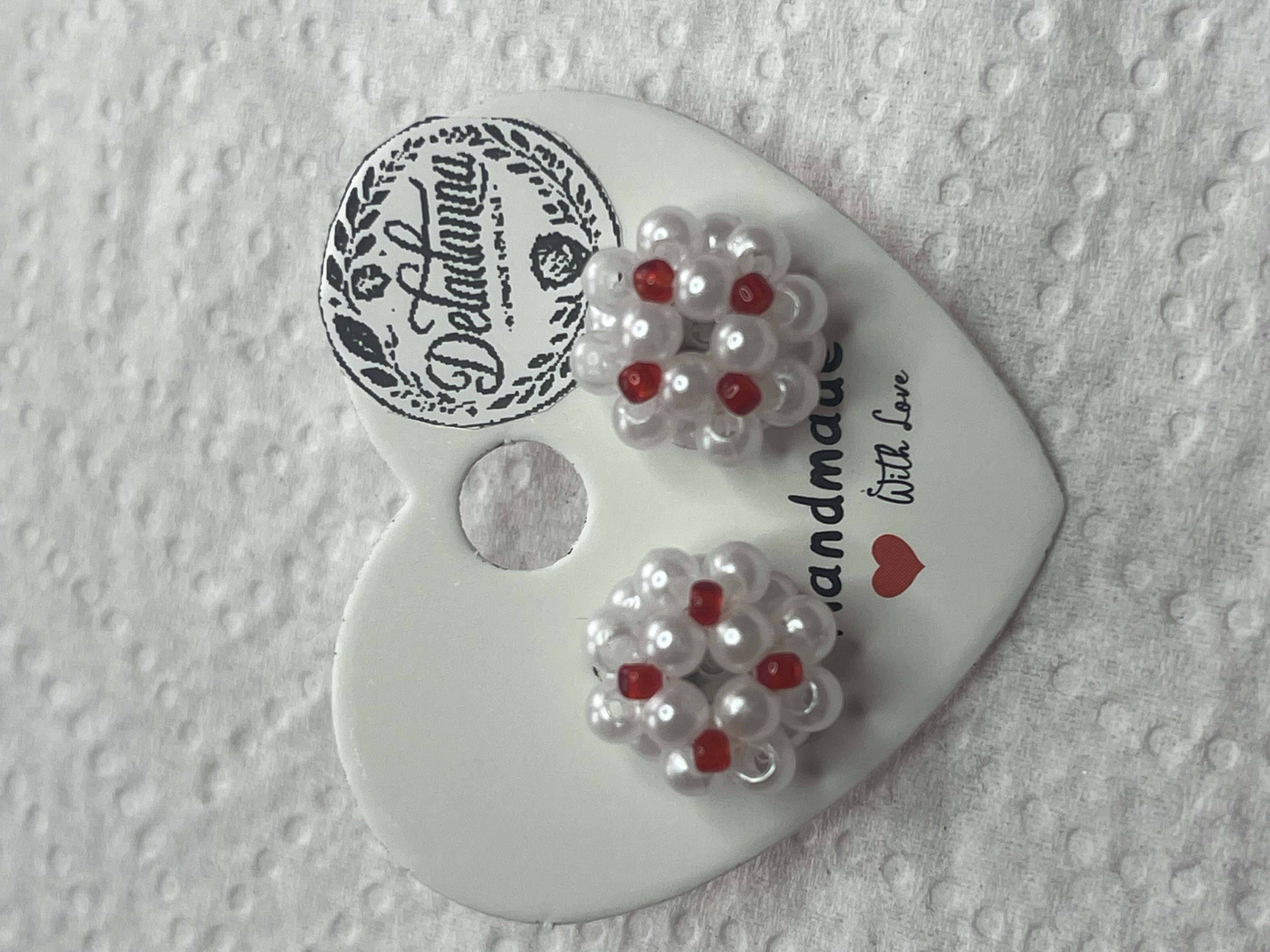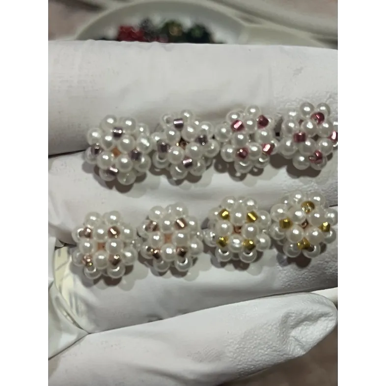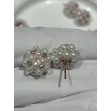 Cercei realizați manual, cu perle albe lucioase și accente negre discrete, pentru un contrast rafinat.