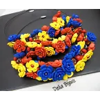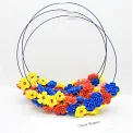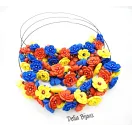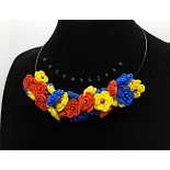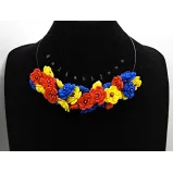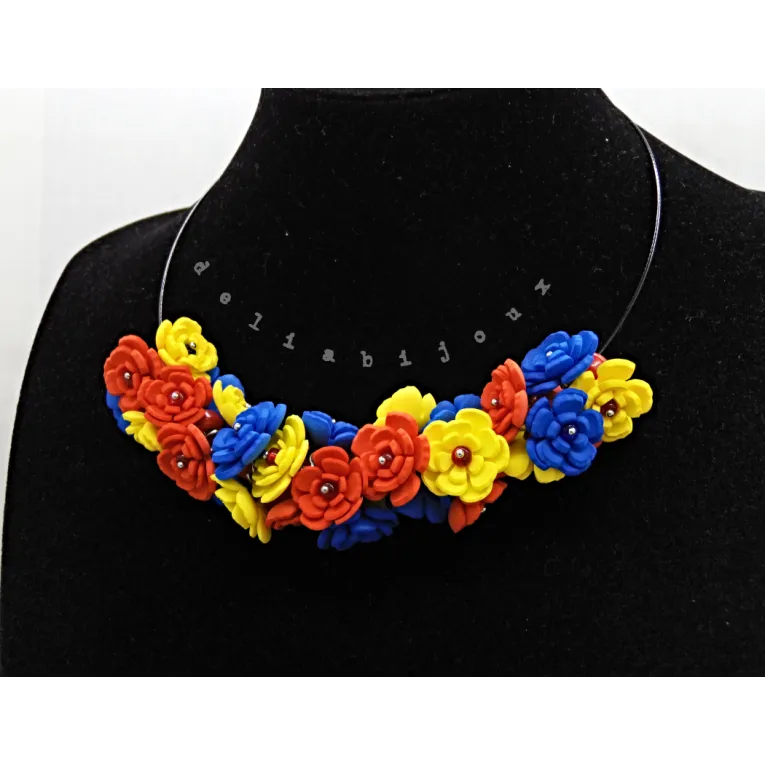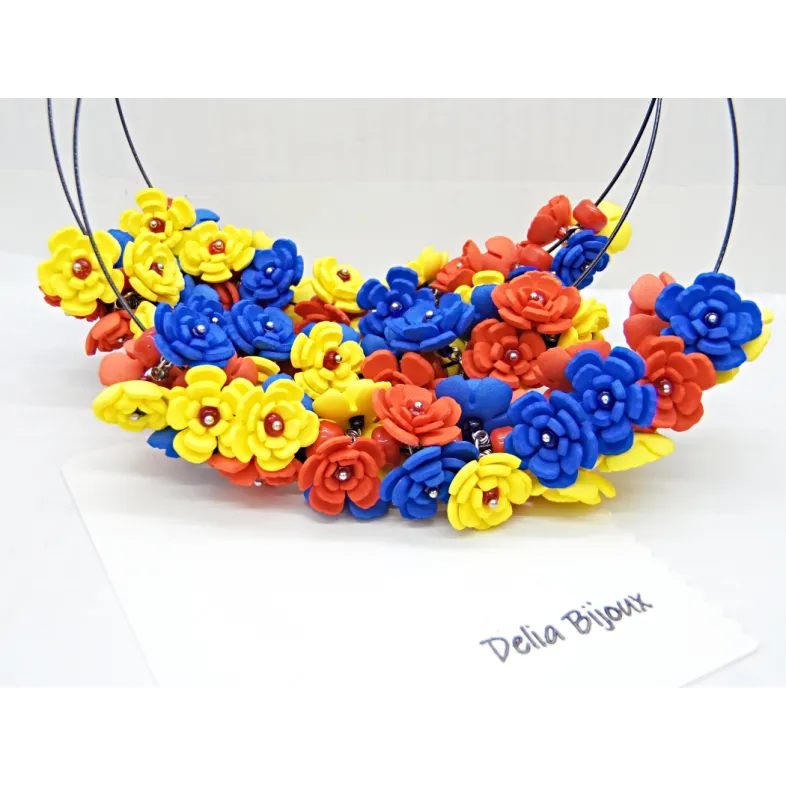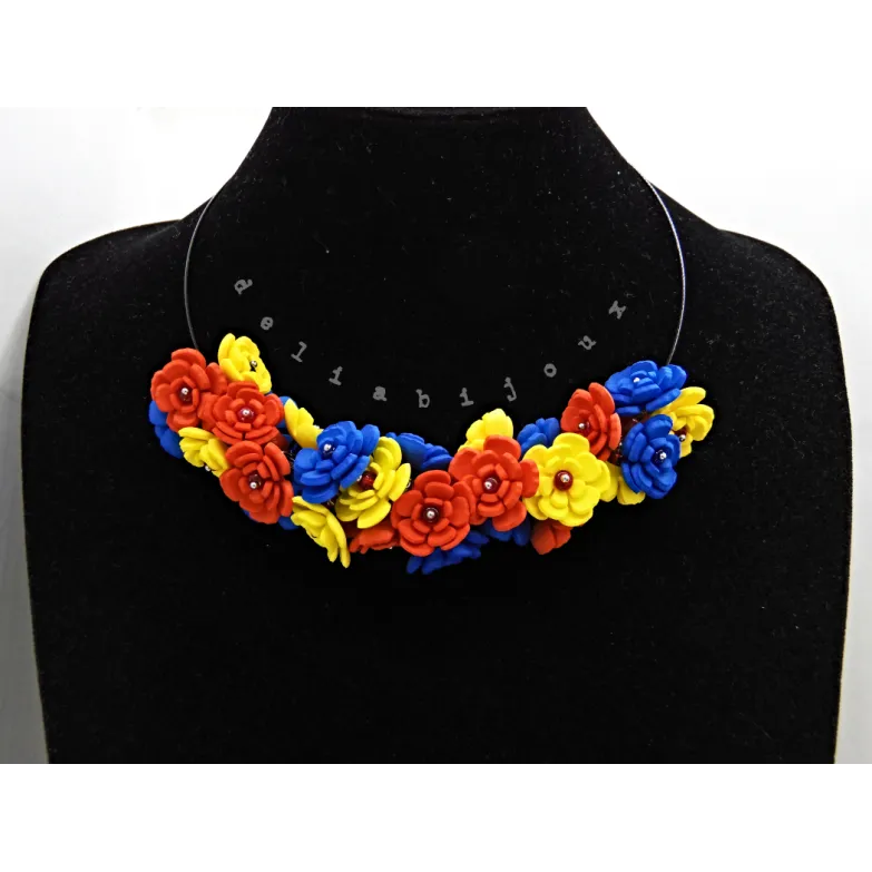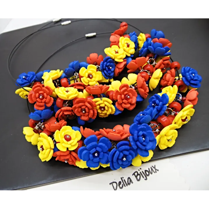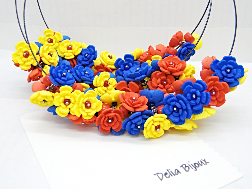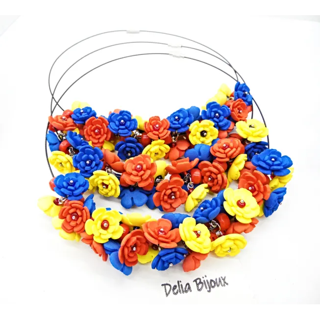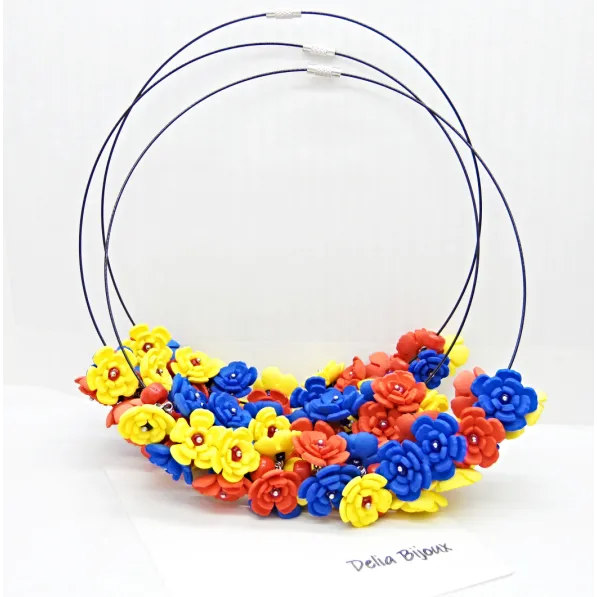 Colier handmade cu flori în culorile tricolorului românesc (albastru, galben, roșu), realizat manual din foamiran, un material ușor, flexibil și plăcut la purtare. Designul floral este delicat și feminin, ideal pentru femeile care adoră să poarte accesorii unice și feminine.Colierul floral te trimite cu gandul la natură și la frumusețea sa, aducând un plus de primăvară și prospețime oricărei ținute. Este perfect pentru a adauga un element distinctiv outfit-ului tau, o nota de romantism si prospetime stilului tau vestimentar, fiind, totodata, o alegere perfectă.Acest colier tricolor handmade românesc este potrivit pentru ținute casual, evenimente speciale, sărbători naționale, festivaluri sau ca cadou handmade pentru iubitoarele de flori. Ușor, confortabil și ușor de asortat, colierul adaugă o notă florală și patriotică oricărui outfit.Colier statement tricolor, realizat din foamiran taiat, modelata si modelat manual (diametrul florilor aprox 1.5 cm - 2 cm, florile nu sunt identice), margele de nisip (3 mm), rondele de sticla ( 8 mm x 6mm), baza colier siliconata rigida (isi pastreaza forma; diametru: 14.5 cm; grosime : 1mm) cu inchizatoare cu filet si elemente metalice.Lungimea desfasurata a colierului - 46 cmLungimea elementului central - 15 cm