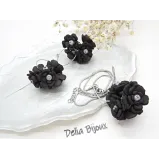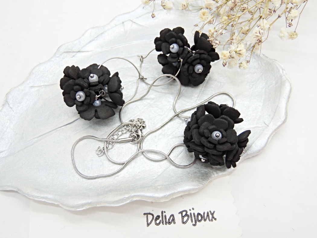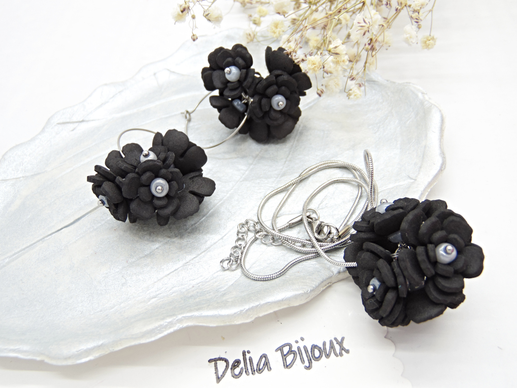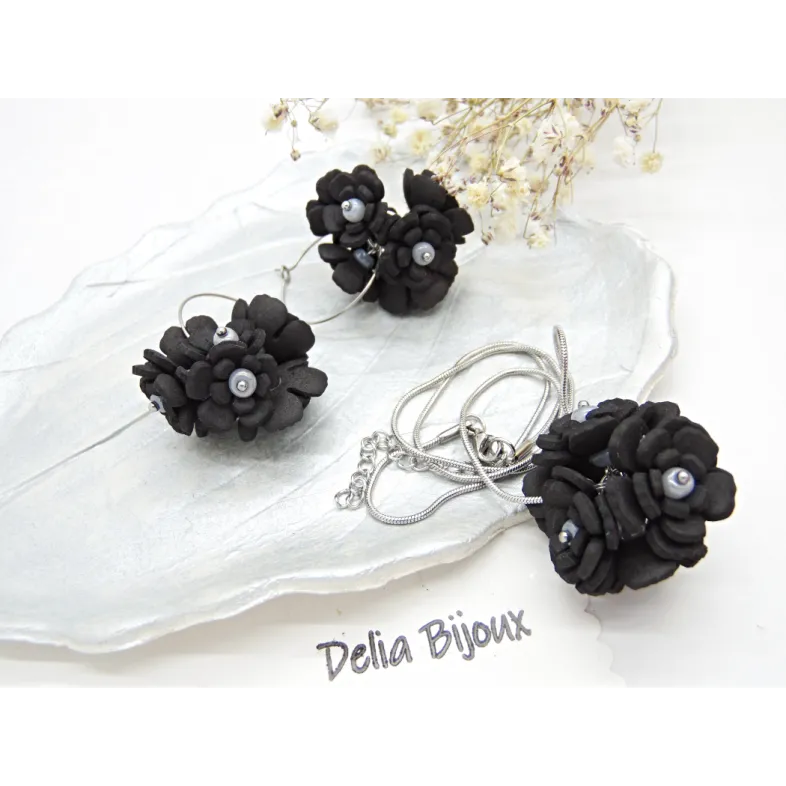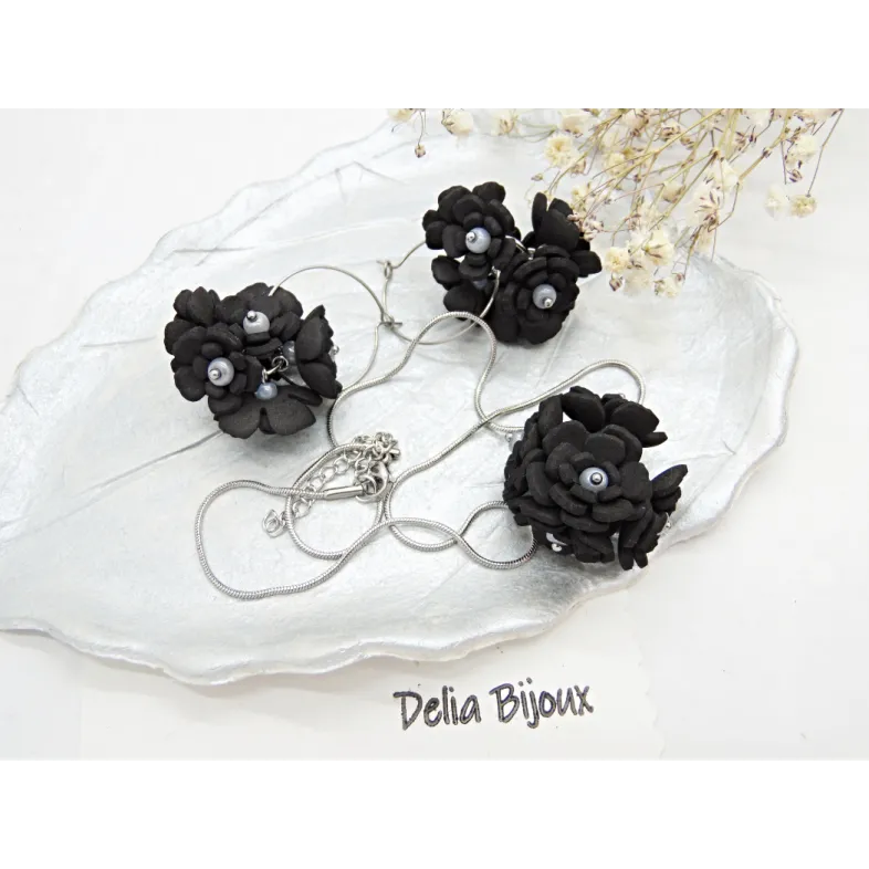 Acest set delicat și sofisticat este realizat manual din foamiran negru, fiecare floare fiind modelată cu grijă pentru a crea buchete elegante și expresive. Cerceii și colierul sunt accesorii statement, ideale pentru a adăuga un aer rafinat și original oricărei ținute.Fiecare floare din set este înfrumusețată în centrul său cu mărgele de nisip gri, adăugând un subtil contrast și un strop de strălucire. Colierul este completat cu un medalion delicat, iar cerceii sunt proiectați pentru a se potrivi perfect, formând un set armonios.Bijuteriile sunt montate pe lanț inoxidabil, rezistent și confortabil pentru purtare zilnică sau ocazii speciale. Acest set handmade este un cadou ideal pentru pasionații de accesorii unice și de efect.Colier statement, realizat din foamiran taiat si modelat manual (diametrul florilor aprox 1.5 cm - 2 cm, florile nu sunt identice), margele de nisip (3 mm), lant de otel inoxidabil (42 cm + 5 cm prelungire) si elemente metalice. Inchidere tip lobster din otel inoxidabil.Cerceii au tortite din otel inoxidabil. Lungimea cerceilor cu tortita - 4.5 cm