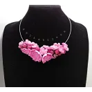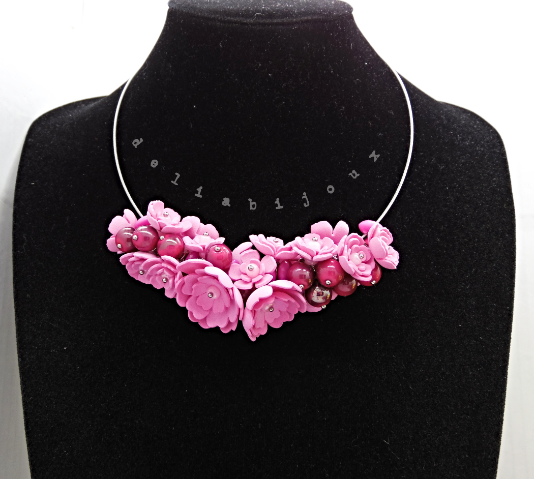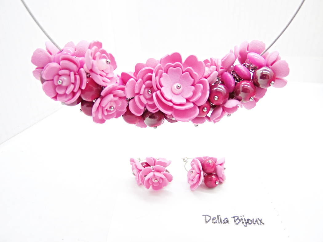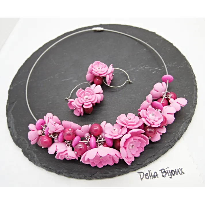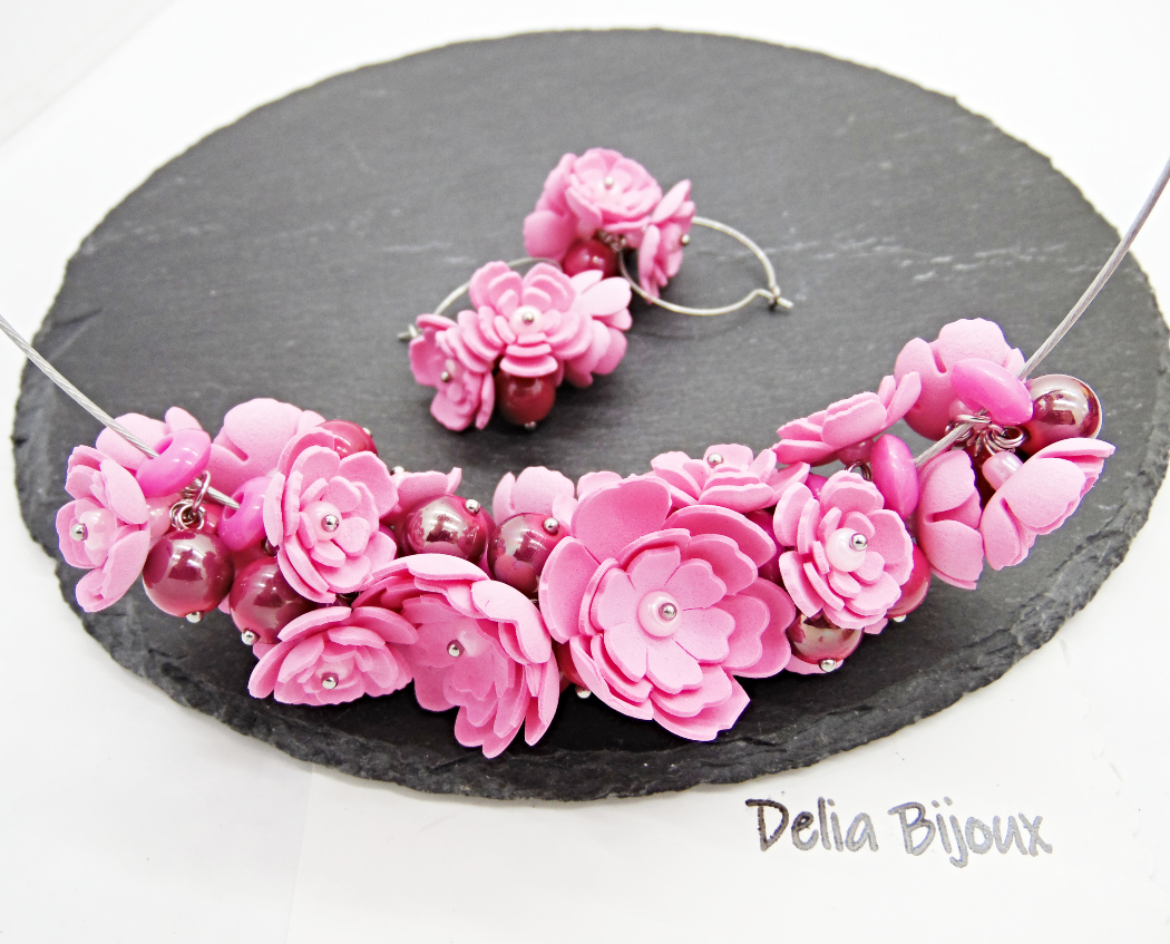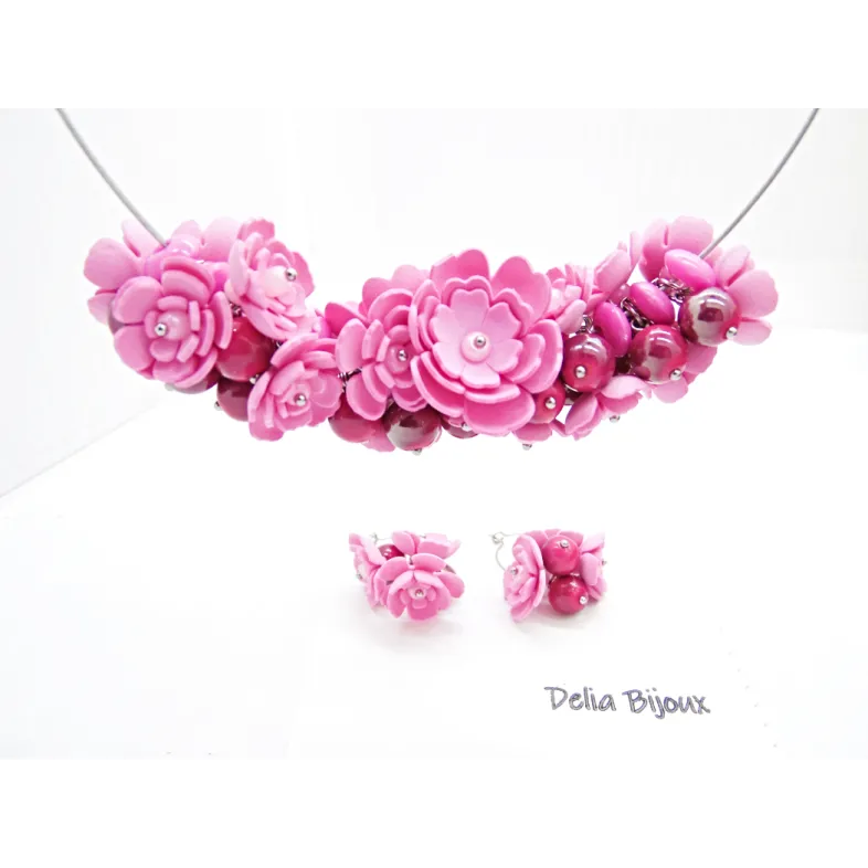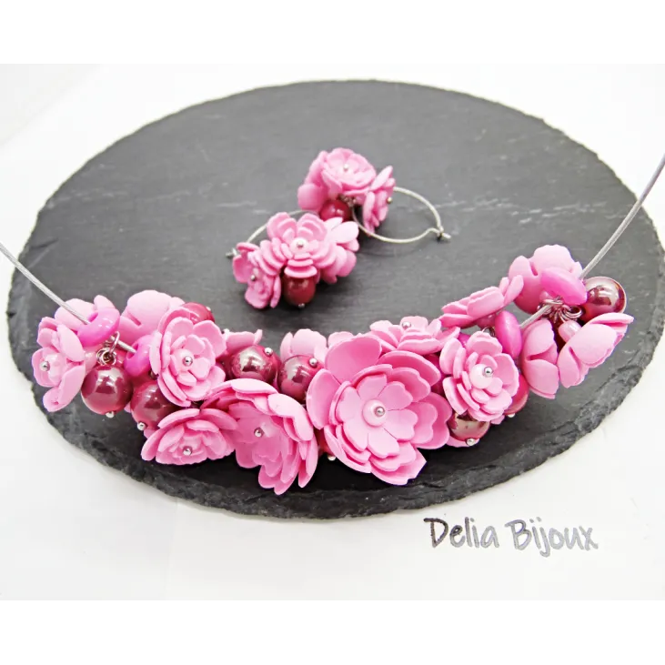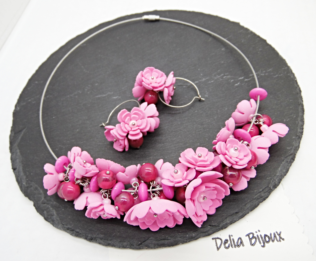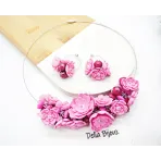 Set de bijuterii feminine, realizat manual, compus din colier statement și cercei asortați, decorat cu flori roz din foamiran (material ușor, confortabil) și mărgele decorative. Designul floral oferă un aer romantic și vesel, ideal pentru a adăuga culoare și o stare de bine oricărei ținute.