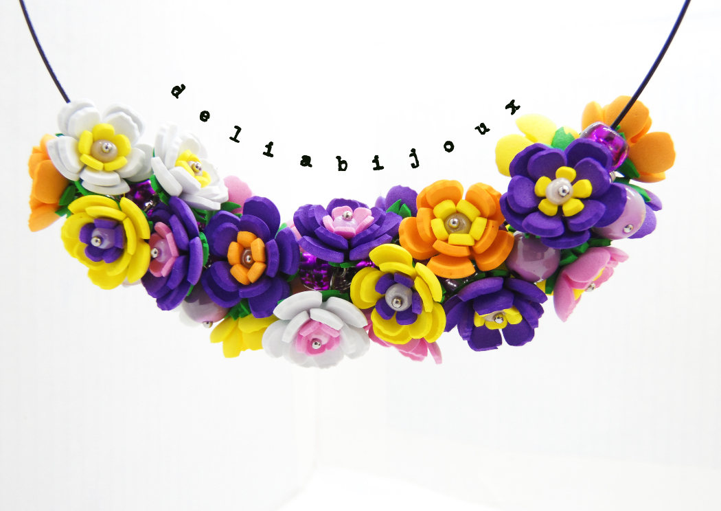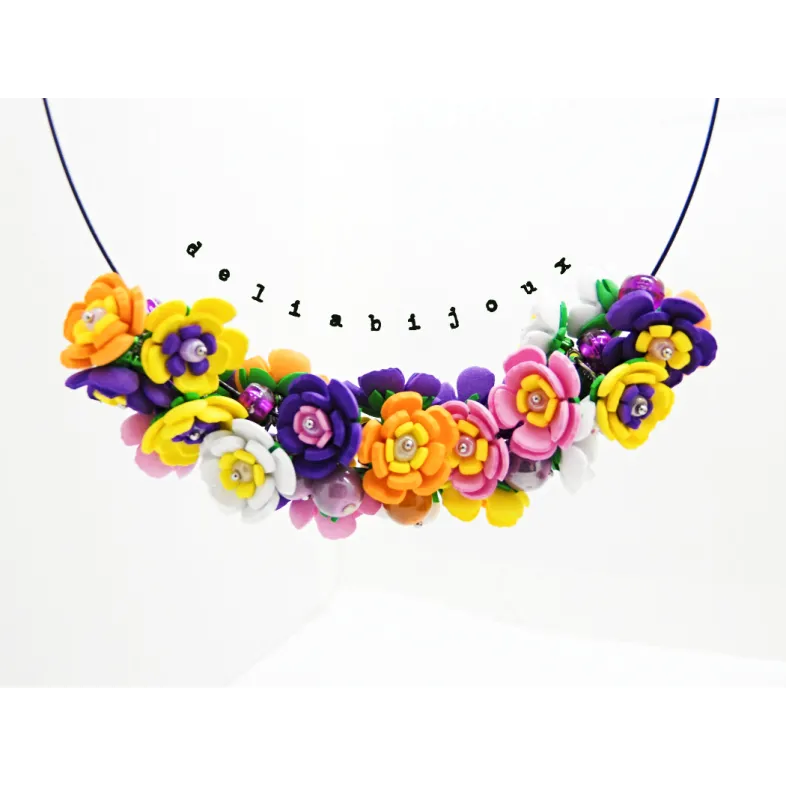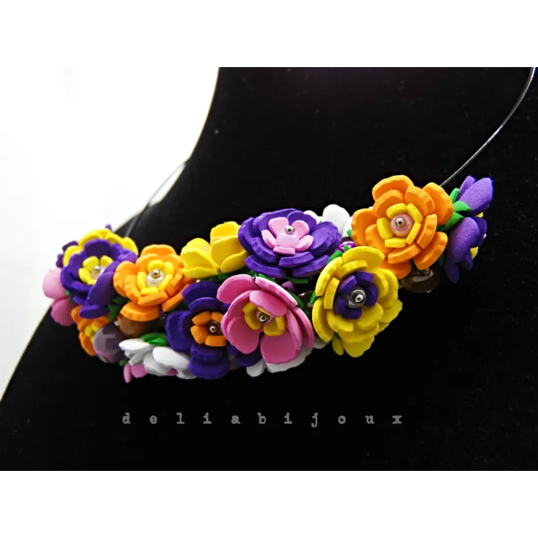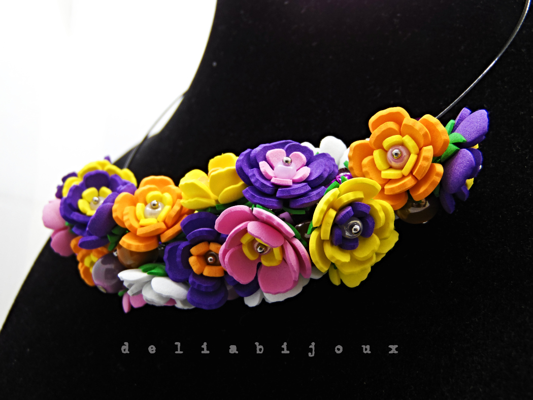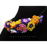 Colier statement floral, unicat, la baza gatului, realizat din hartie gumata (foamiran) taiata manual si modelata (dimensiunile florilor variaza de la 1.5 cm la 2 cm), margele de nisip (3 mm), margele perlate de plastic (10 mm),margele plastic ( 10 x 6mm), baza colier siliconata rigida (isi pastreaza forma; diametru: 14.5 cm; grosime : 1mm) cu inchizatoare cu filet si elemente metalice.Lungimea desfasurata a colierului - 46 cm