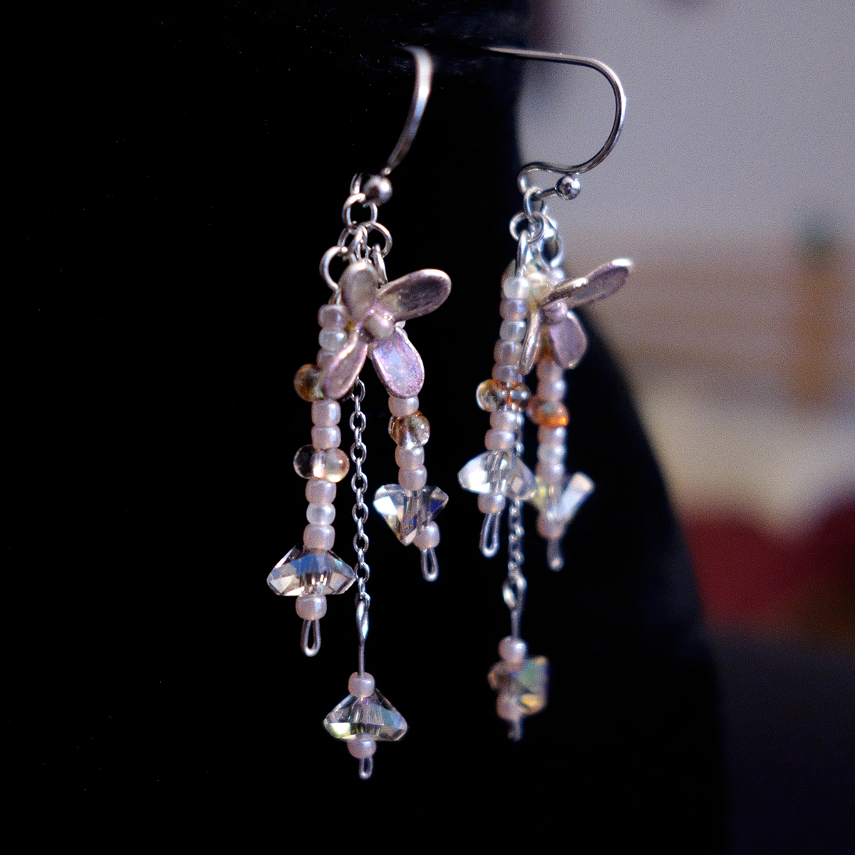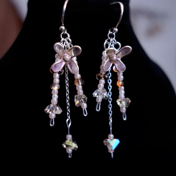 Materiale: rășină poliuretanică, tortițe oțel inoxidabil, sârmă cupru argintată, mărgele sticlă, componente oțel inoxidabil