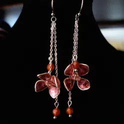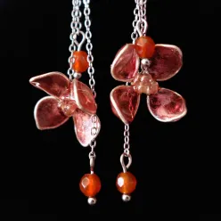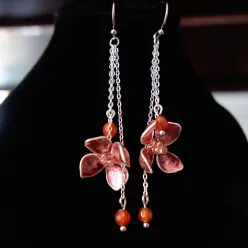 Cercei realizați complet manual, din rășină poliuretanică, sârmă din cupru argintată, mărgele din agat roșu și tortițe din oțel inoxidabil. Lungime (cu tortițe): 6cm