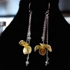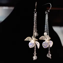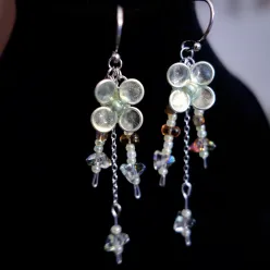 Cercei realizați complet manual, din rășină poliuretanică, sârmă din cupru argintată, mărgele din piatra lunii și tortițe din oțel inoxidabil. Lungime (cu tortițe): 6cm