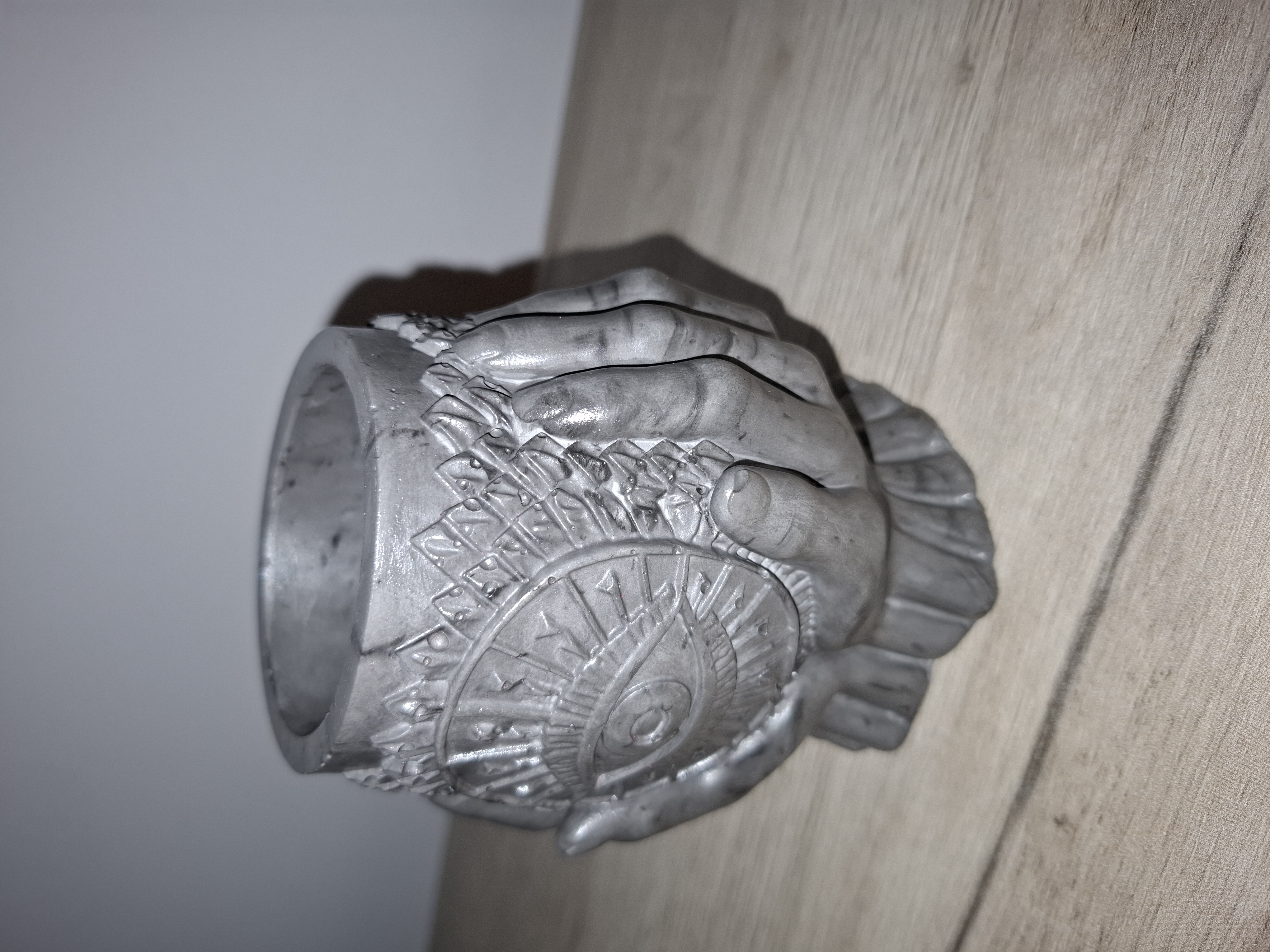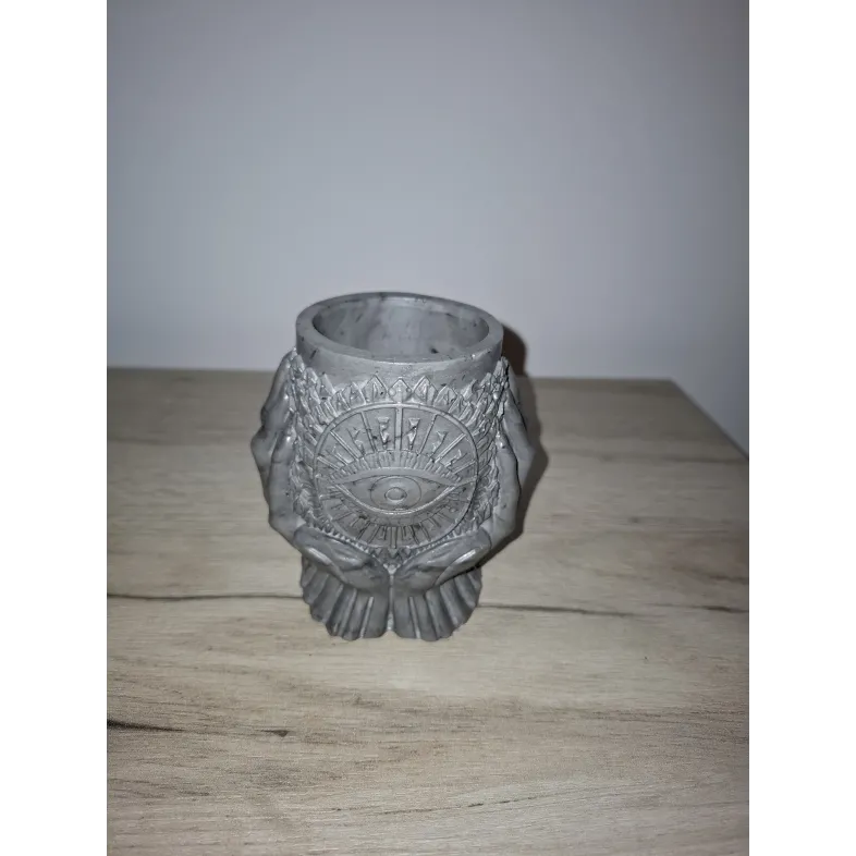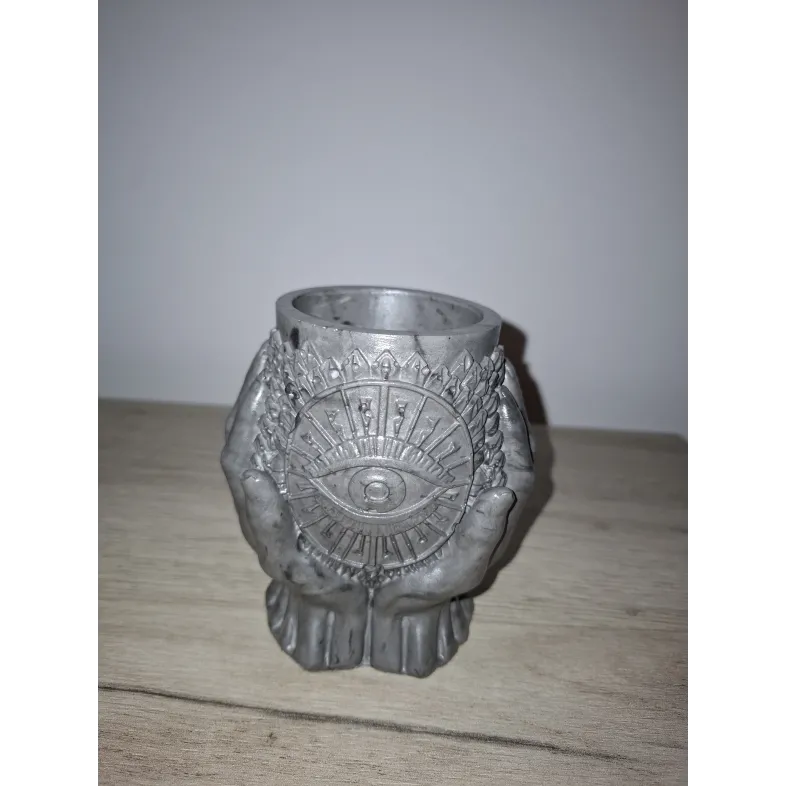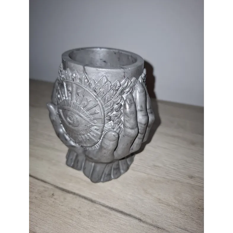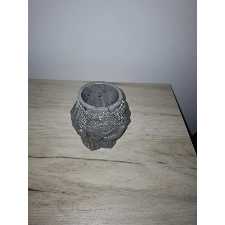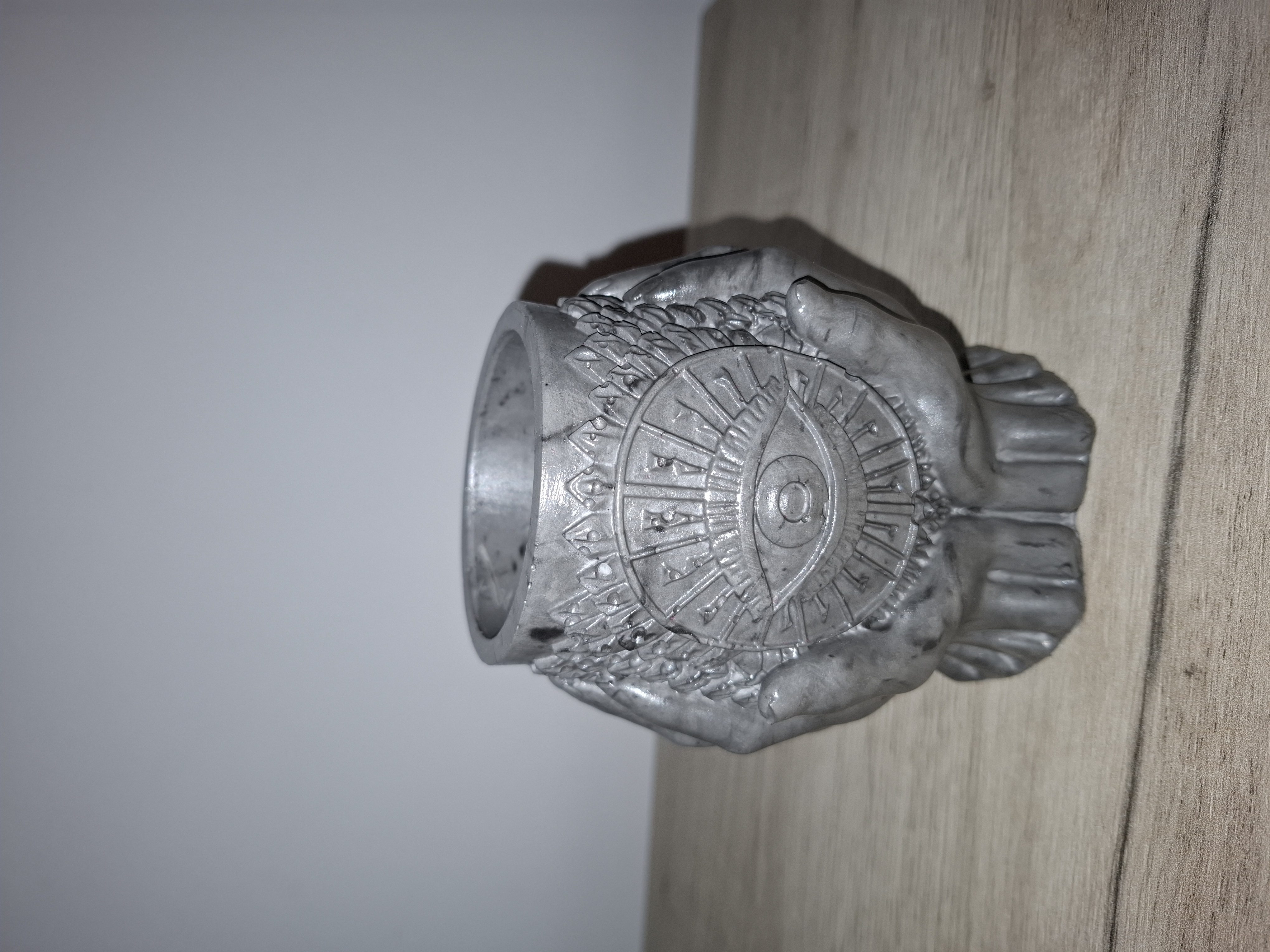 Decoratiune din ipsos de culoare gri. Ornamentul contine doua maini in care tin un ochi.