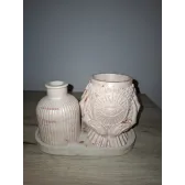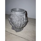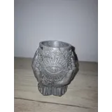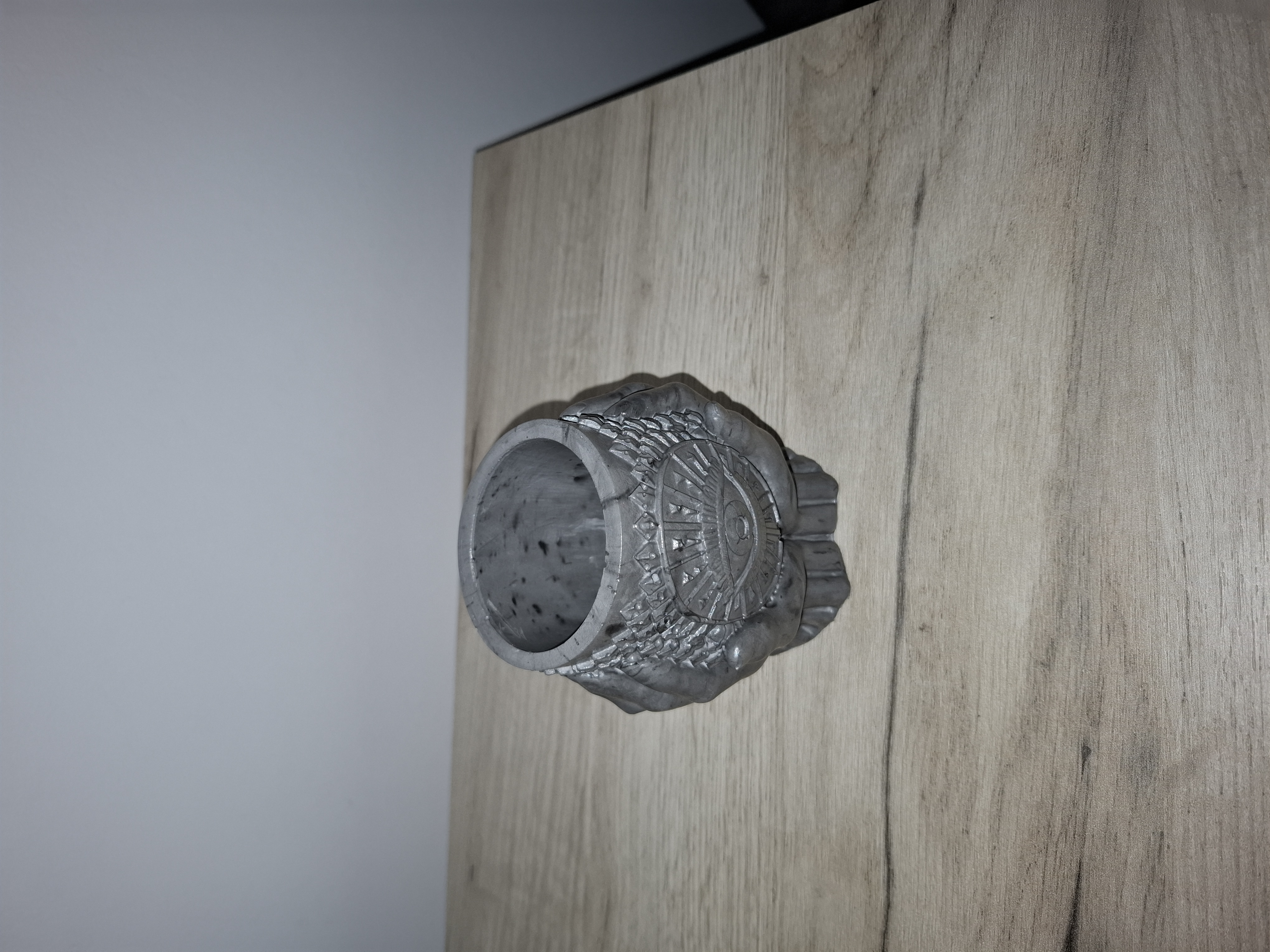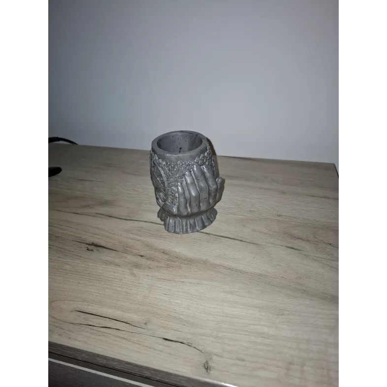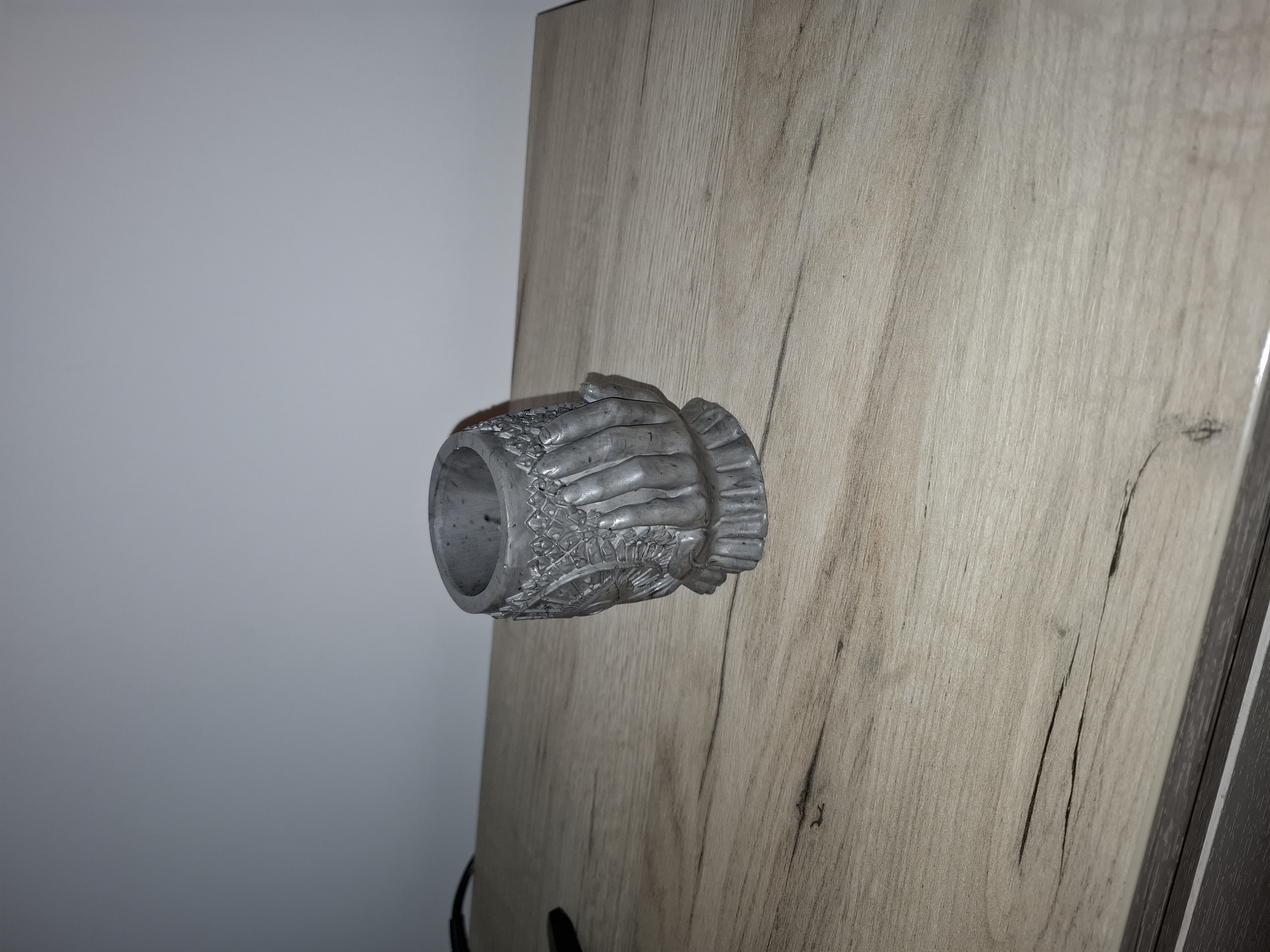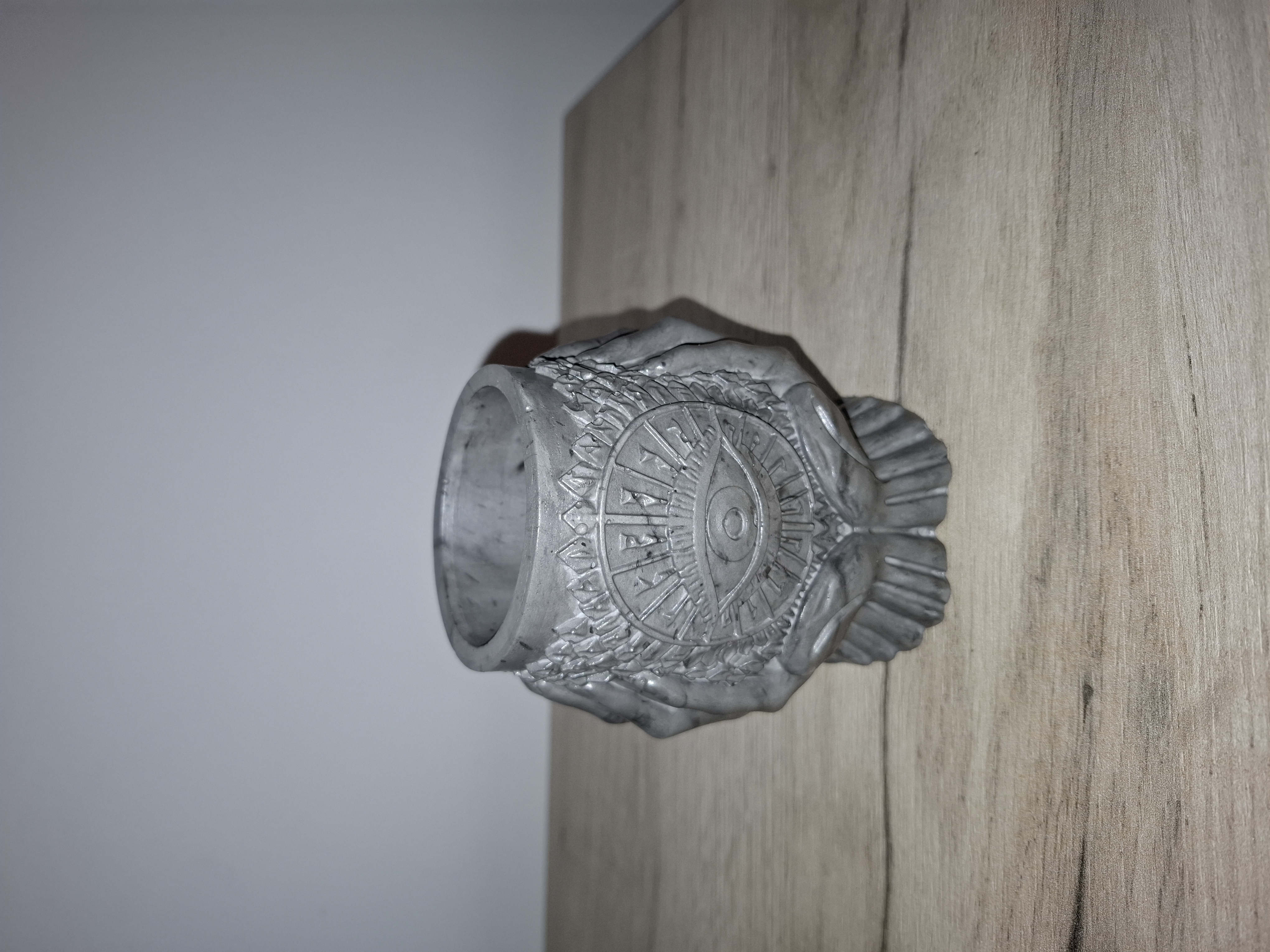 Decoratiune din ipsos de culoare gri. Ornamentul contine doua maini in care tin un ochi.