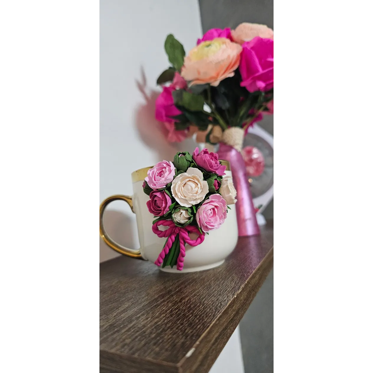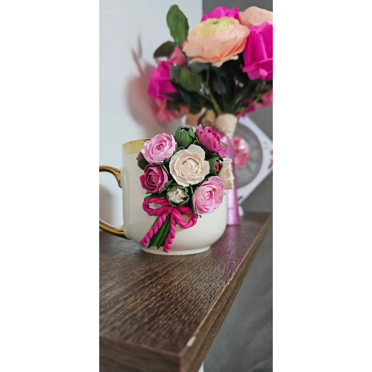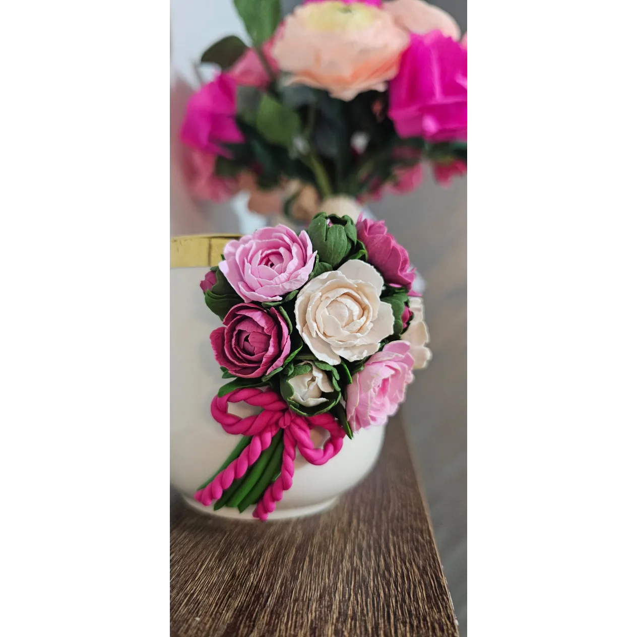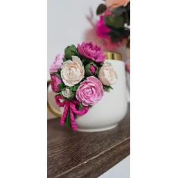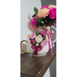 Aceasta cană este decorată manual cu un aranjament floral realizat din lut polimeric, fiecare floare fiind modelată cu atenție la detalii pentru un aspect delicat și elegant.