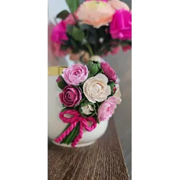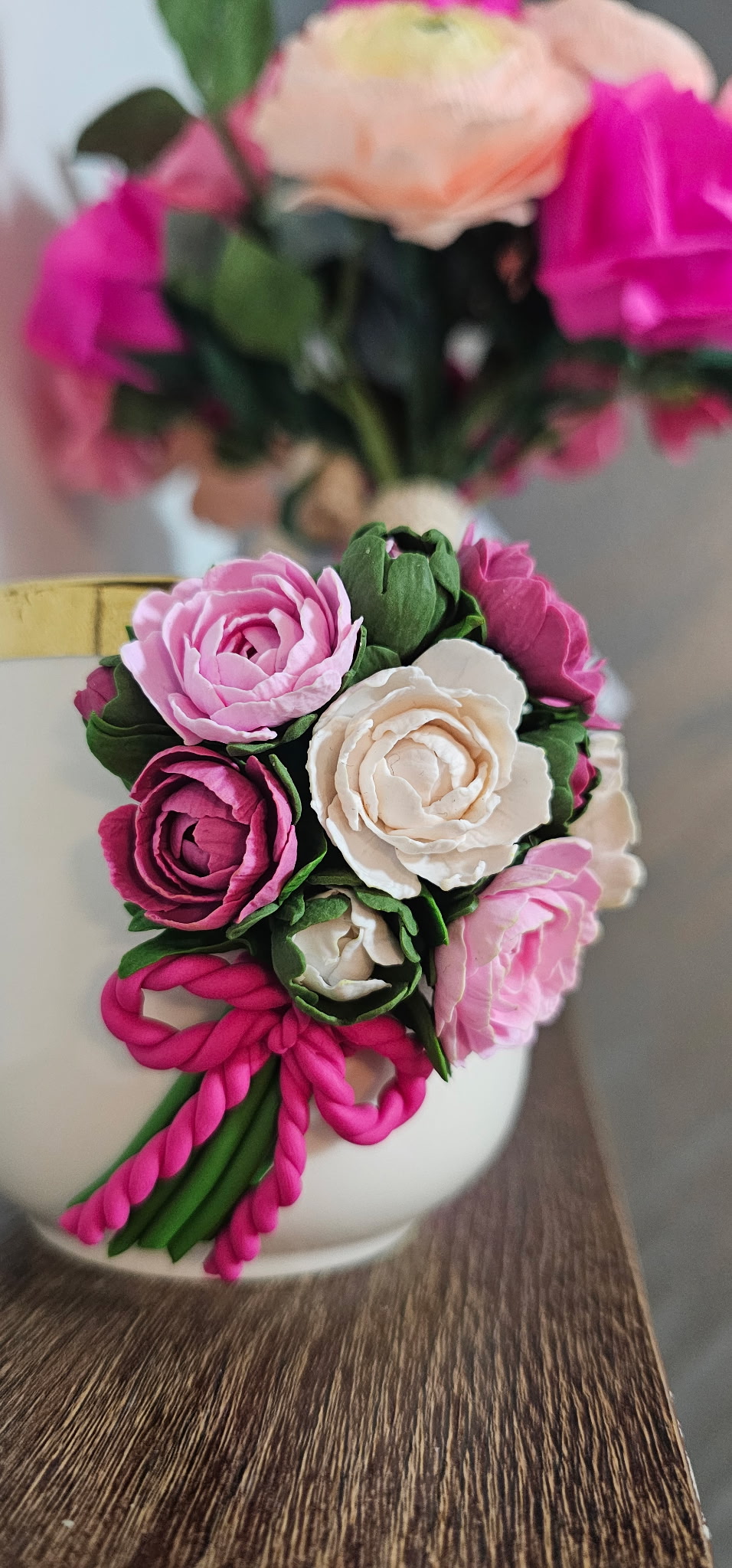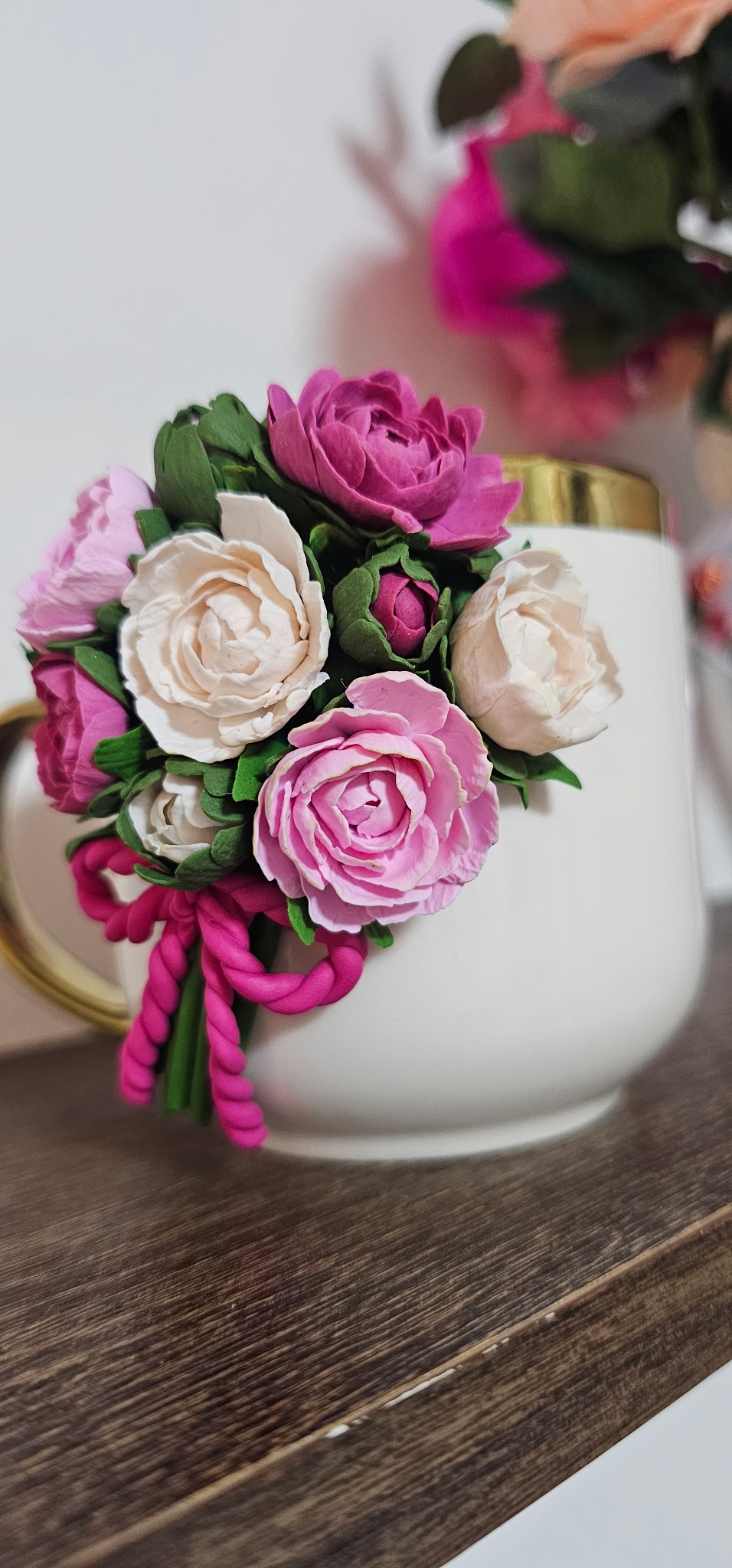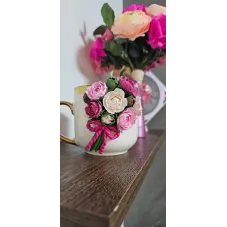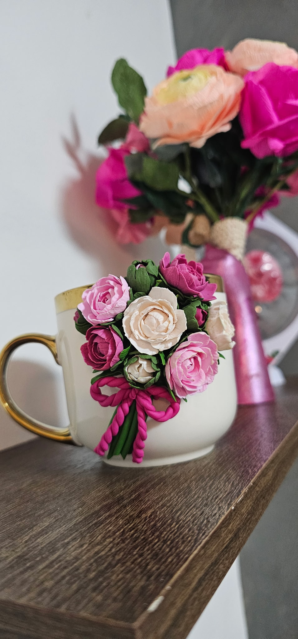 Aceasta cană este decorată manual cu un aranjament floral realizat din lut polimeric, fiecare floare fiind modelată cu atenție la detalii pentru un aspect delicat și elegant.