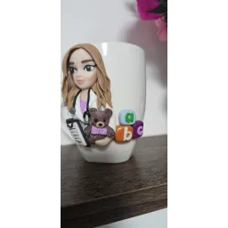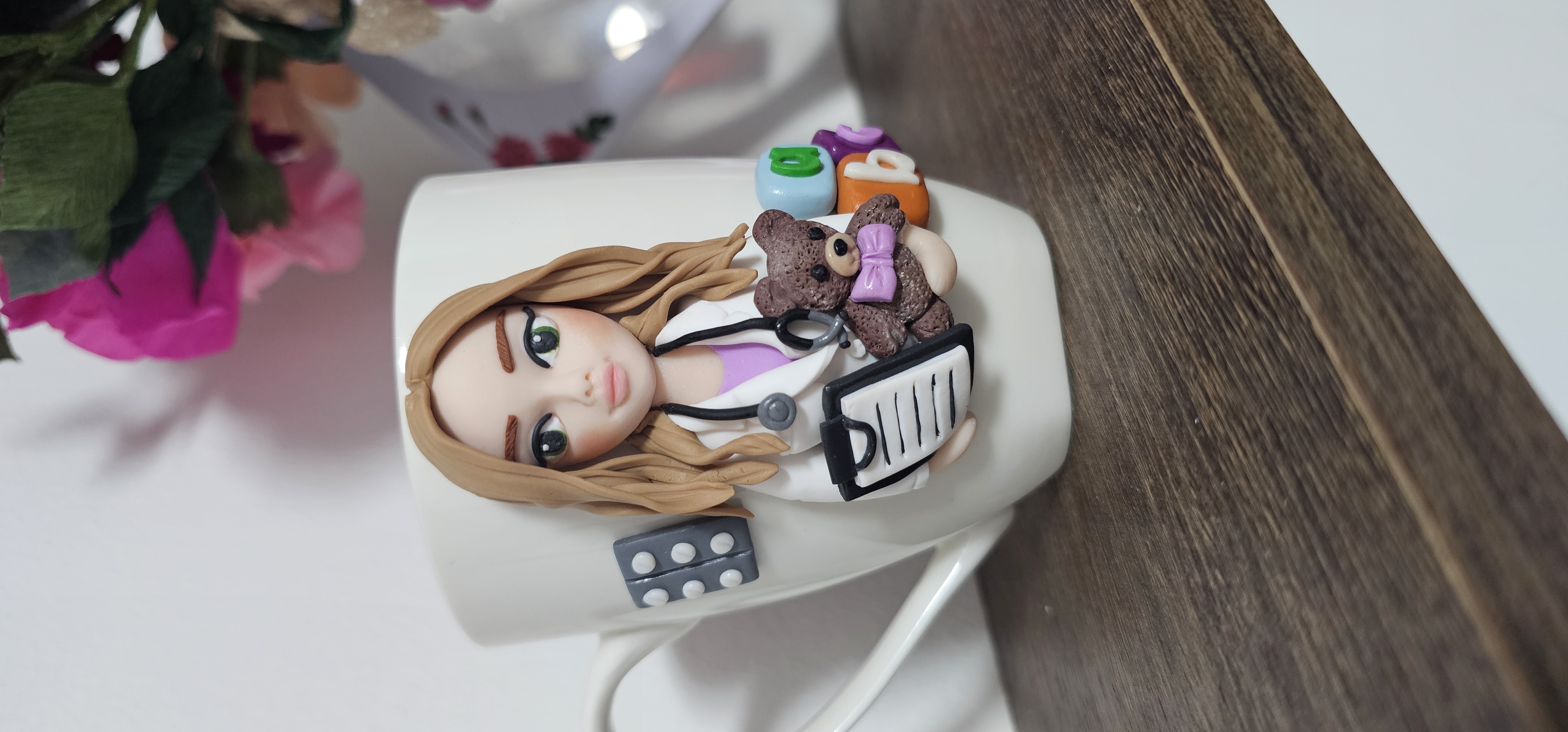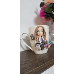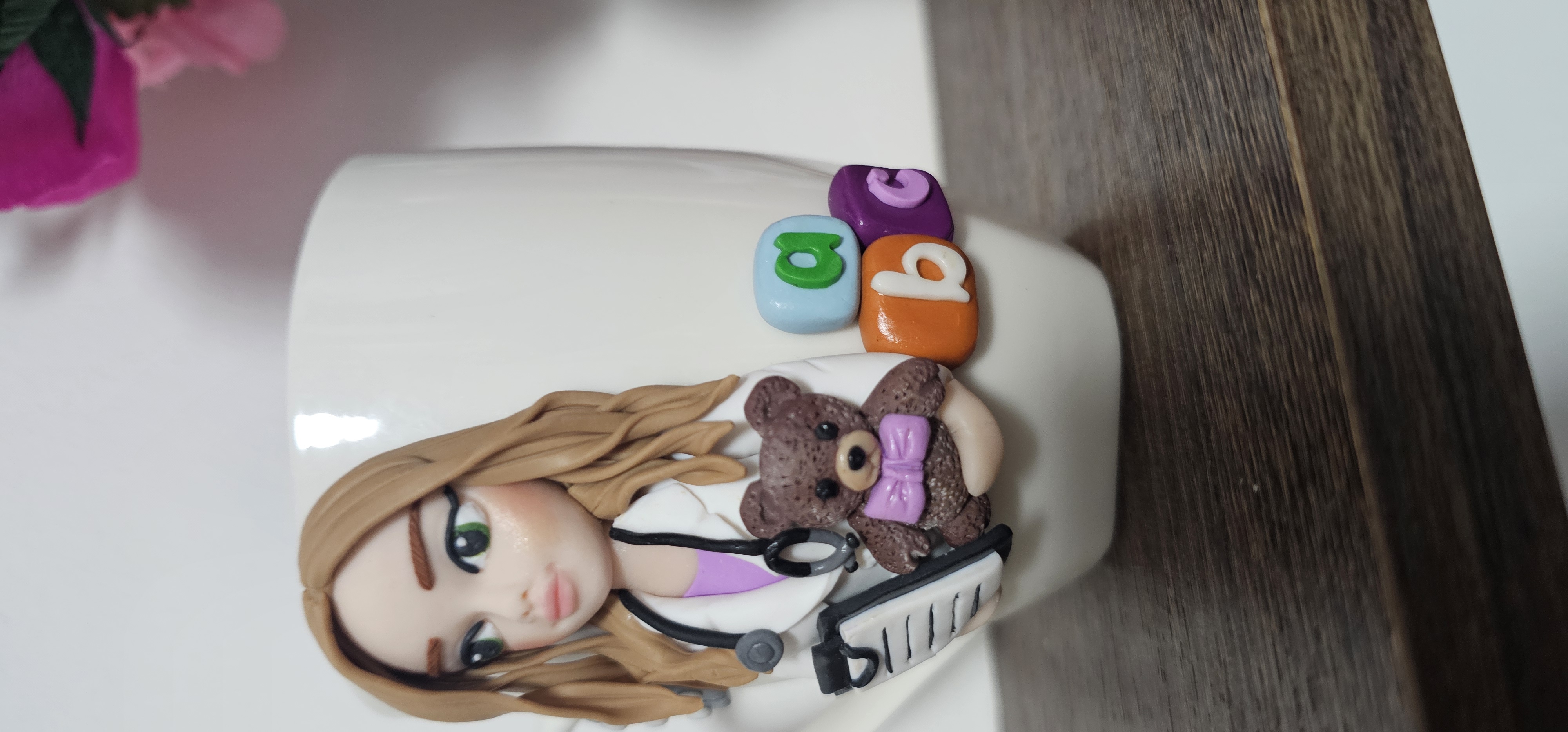 Aceasta cană este decorată manual cu o figurina unică, creată special după fotografia ta.Fiecare personaj este realizat in stil artistic stilizat,cu accent pe trăsături distinctive precum coafura, culoarea ochilor,vestimentația și detalii reprezentative pentru meserii sau hobby-uri.