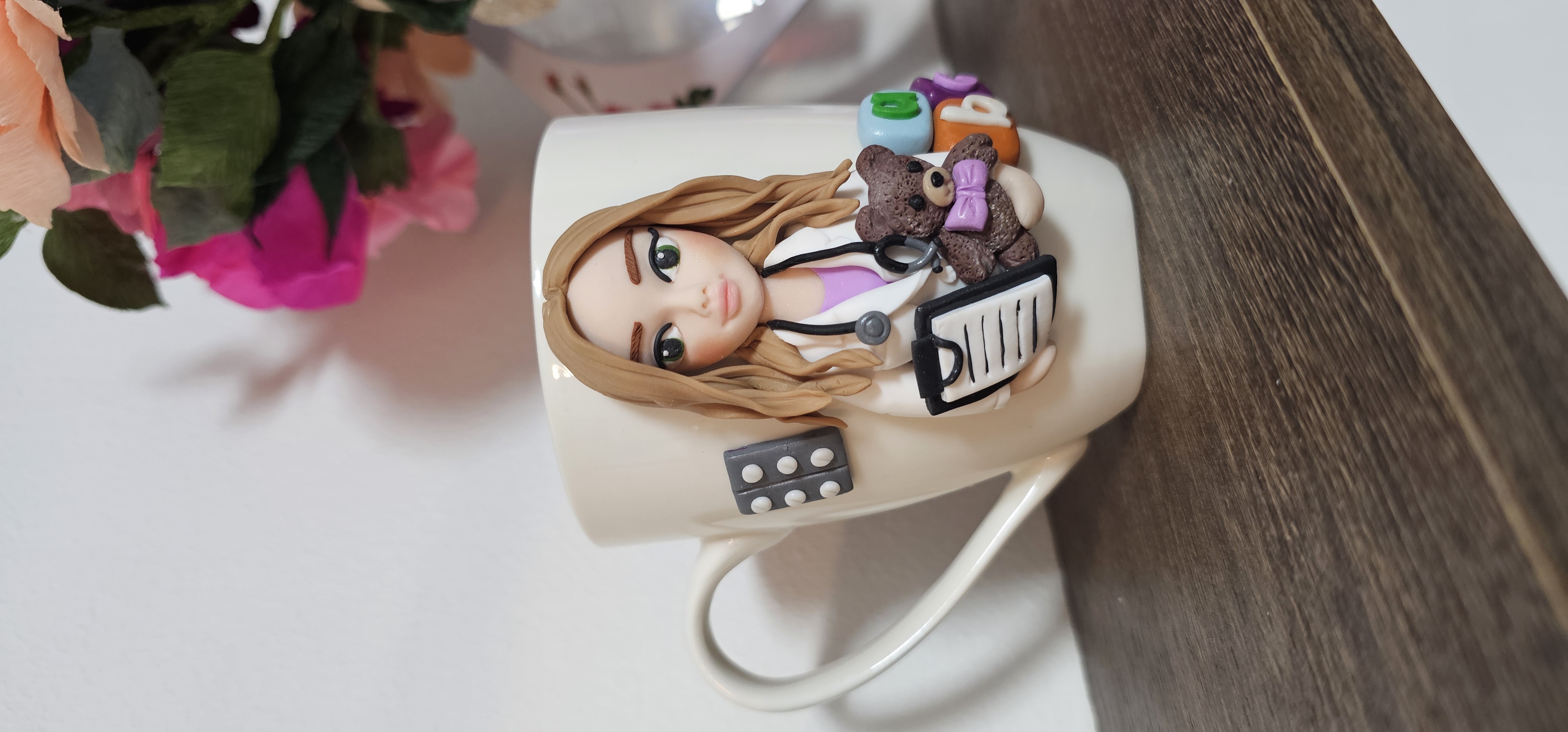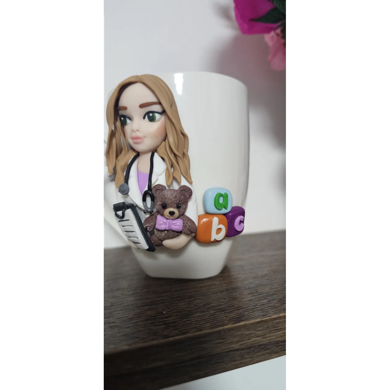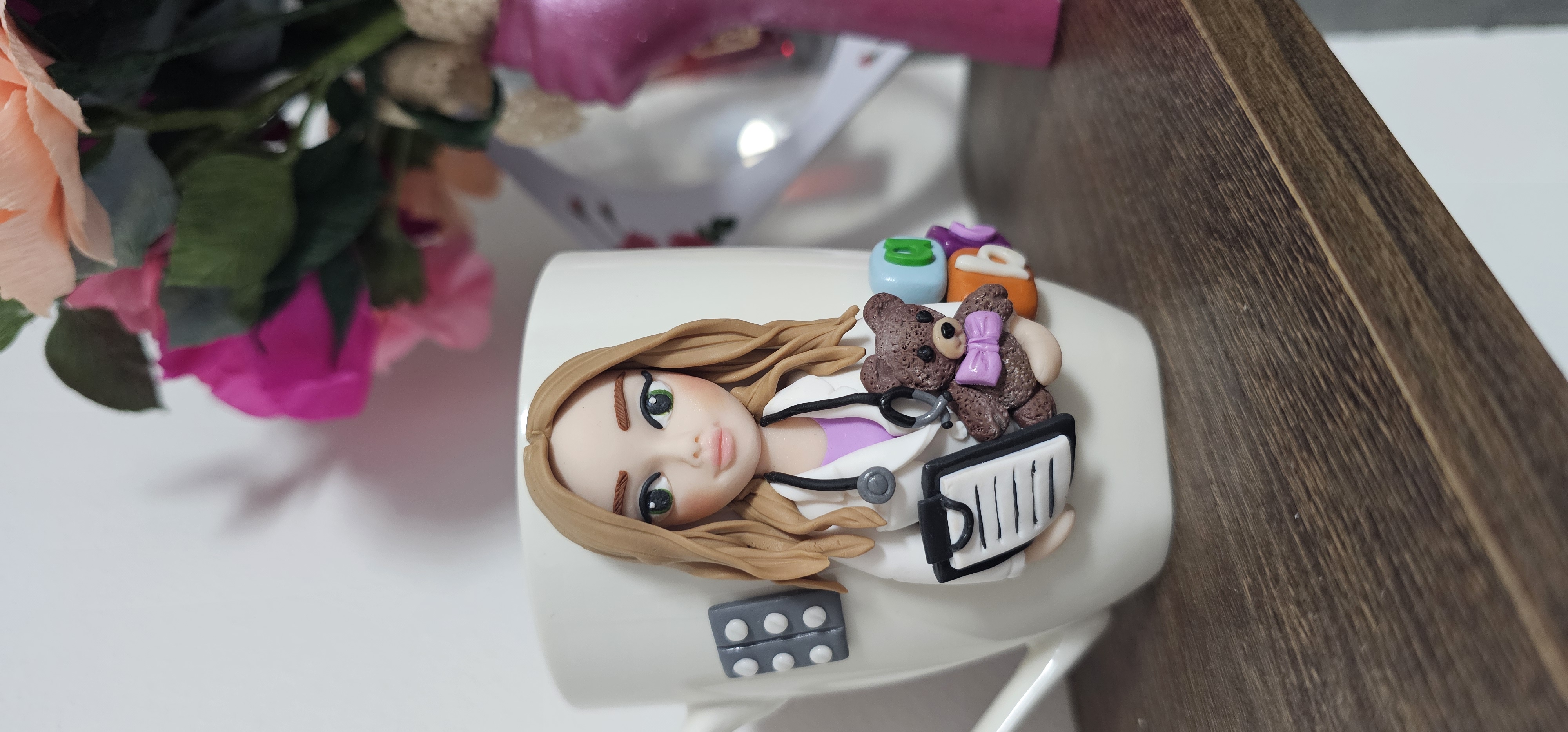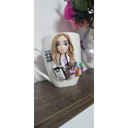 Cana personalizata cu figurina stilizata după fotografie - medic/asistenta - cadou unic realizat la comanda