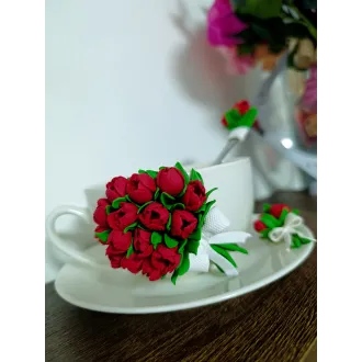 Acest set elegant de cafea este compus din ceașcă, farfurioară și linguriță asortată,toate decorate manual cu lalele realizate din lut polimeric. Conține: ceașcă, farfurioară și linguriță decorată  Material: ceramica + inox + decor din lut polimeric  Personalizare: se poate realiza in orice combinație de culori   Recomandări: Pentru a păstra decorul in stare optimă,se recomandă spălarea manuală și evitarea mașinii de spălat vase sau a cuptorului cu microunde.  Fiecare set este realizat la comandă,ceea ce îl face unic -pot exista mici diferențe față de fotografii.  Un cadou deosebit și elegant,perfect pentru aniversari,...
