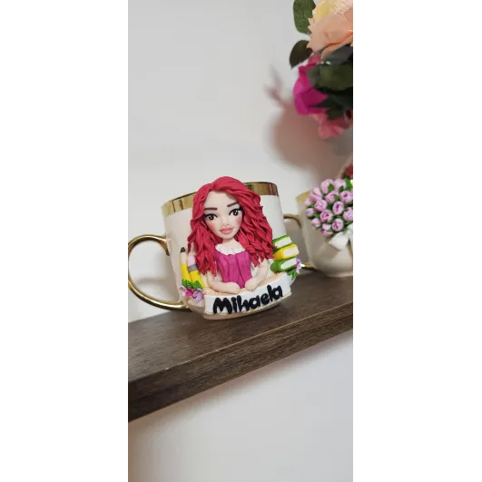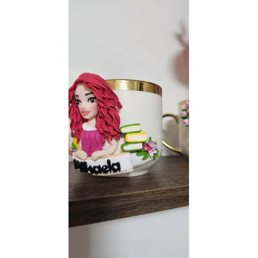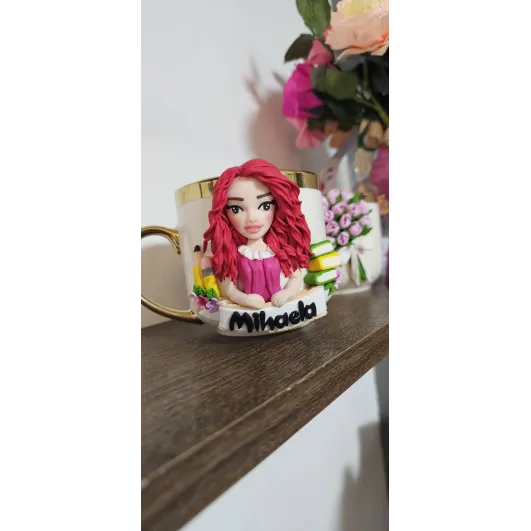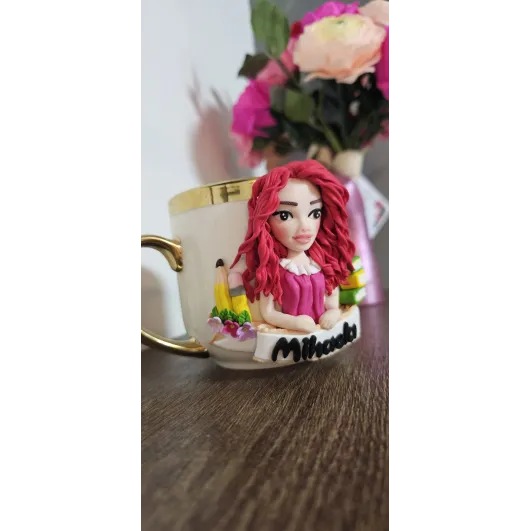 Aceasta cană este decorată manual cu o figurina unică, creată special după fotografia ta.Fiecare personaj este realizat in stil artistic stilizat,cu accent pe trăsături distinctive precum coafura, culoarea ochilor,vestimentația și detalii reprezentative pentru meserii sau hobby-uri.   •Fiecare detaliu este modelat manual din lut polimeric,ceea ce face că fiecare creație să fie complet unică și personalizată. Material: cană ceramică + figurină din lut polimeric  Personalizare: realizată după fotografia clientului Stil: figurină stilizată (nu este o sculptură realistă) Elemente personalizate: trăsături, coafură, haine,accesorii...