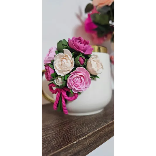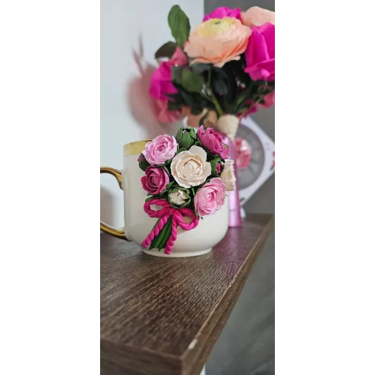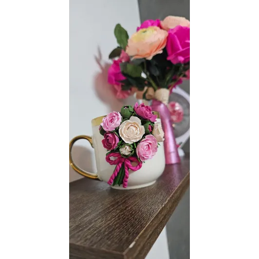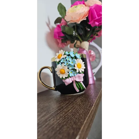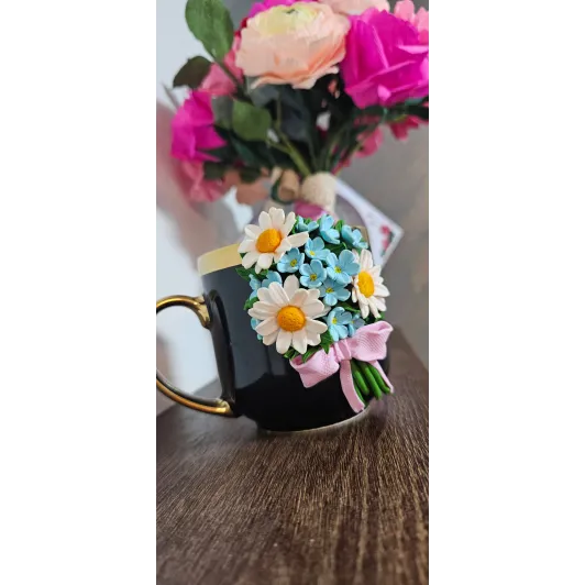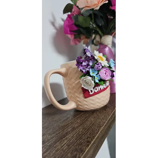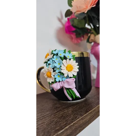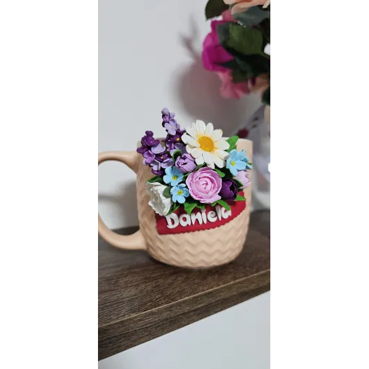 Aceasta cană este decorată manual cu un aranjament floral realizat din lut polimeric, fiecare floare fiind modelată cu atenție la detalii pentru un aspect delicat și elegant. Material : cană ceramică + decor din lut polimeric  Design: aranjament floral realizat manual  Personalizare: se poate adăuga nume sau mesaj scurt  Utilizare: pentru cafea,ceai sau ca obiect decorativ  Recomandări: Pentru a proteja decorul,se recomandă spălarea manuală și evitarea mașinii de spălat vase sau a cuptorului cu microunde. Fiecare produs este realizat la comandă,ceea ce înseamnă că pot exista mici diferențe față de fotografii - acesta fiind...