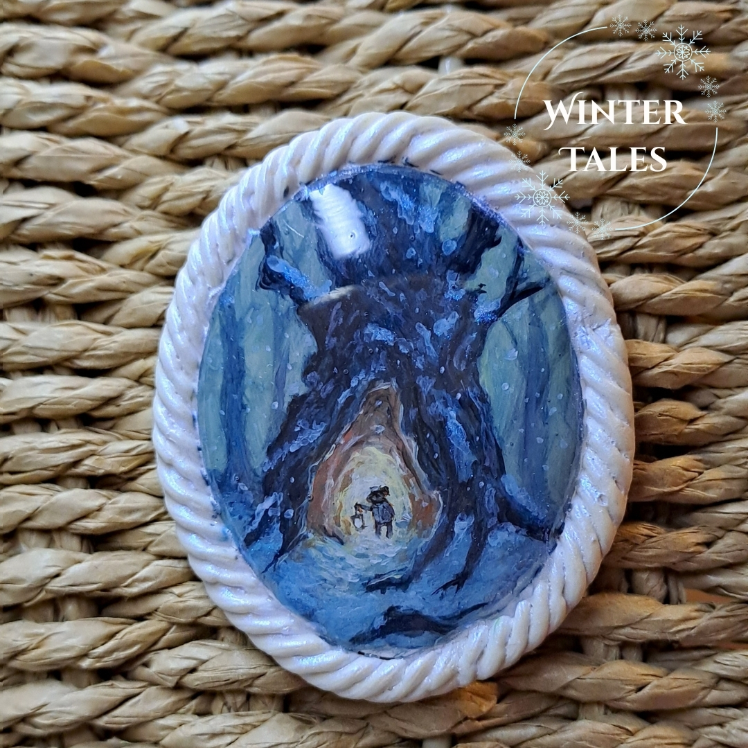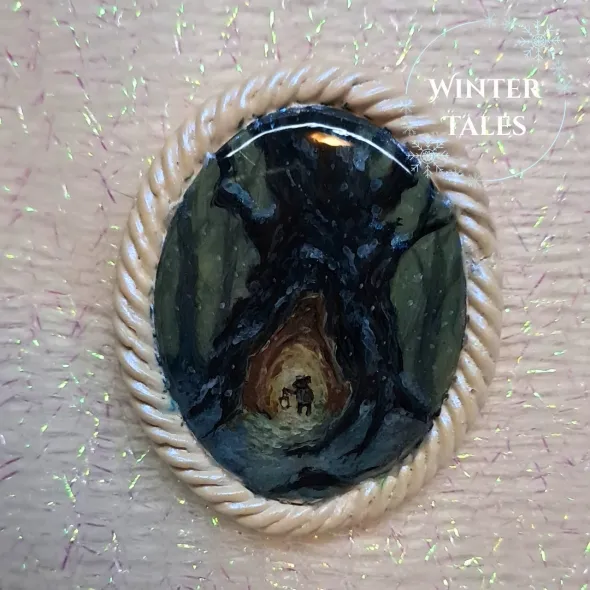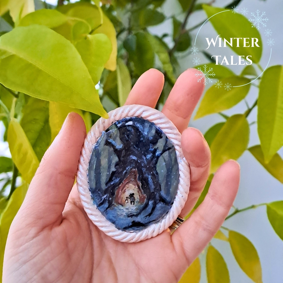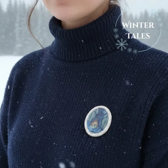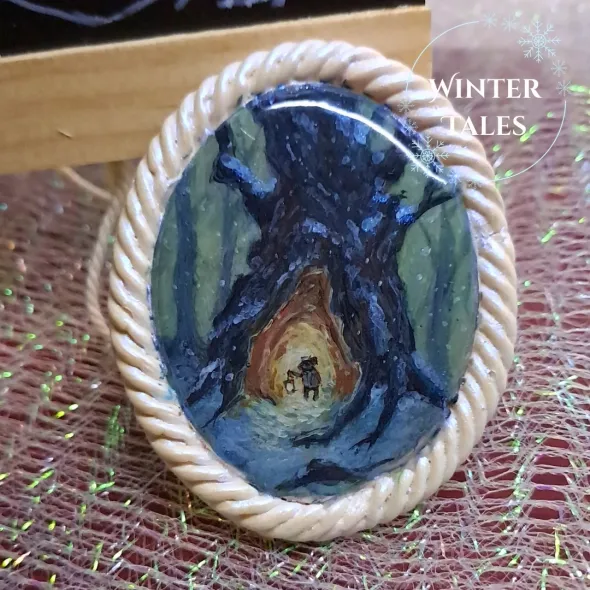 Realizată din lut polimeric, pictată manual. Colecția Winter Tales inspiră acea liniște aparte a iernii, în care fiecare fulg pare să spună o poveste. Fiecare piesă este o mică lume închisă în rășină, pictată manual cu vopsele acrilice și surprinde în nuanțe delicate și detalii fine peisaje, animale și lumi fermecate. Fiecare bijuterie poartă în ea un strop de nostalgie și te va duce cu gândul la poveștile copilăriei.