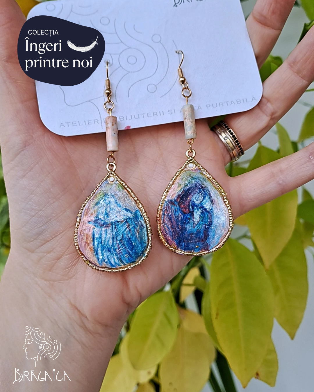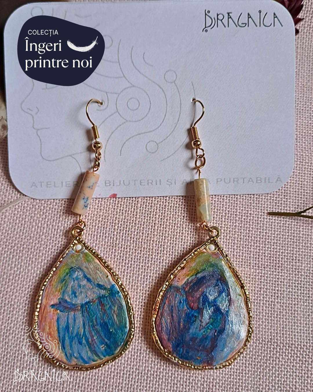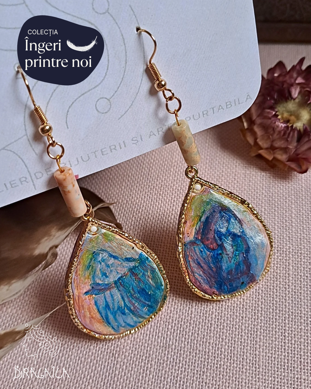 Cercei din lut polimeric, realizați manual, apoi pictati cu vopsele acrilice. Mici picturi miniaturale gata de a fi purtate si adorate. Accesorii din otel inoxidabil și pietre semiprețioase.