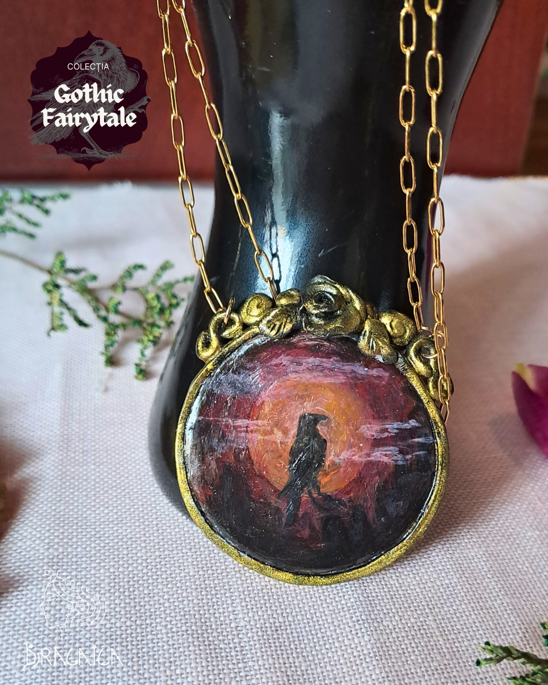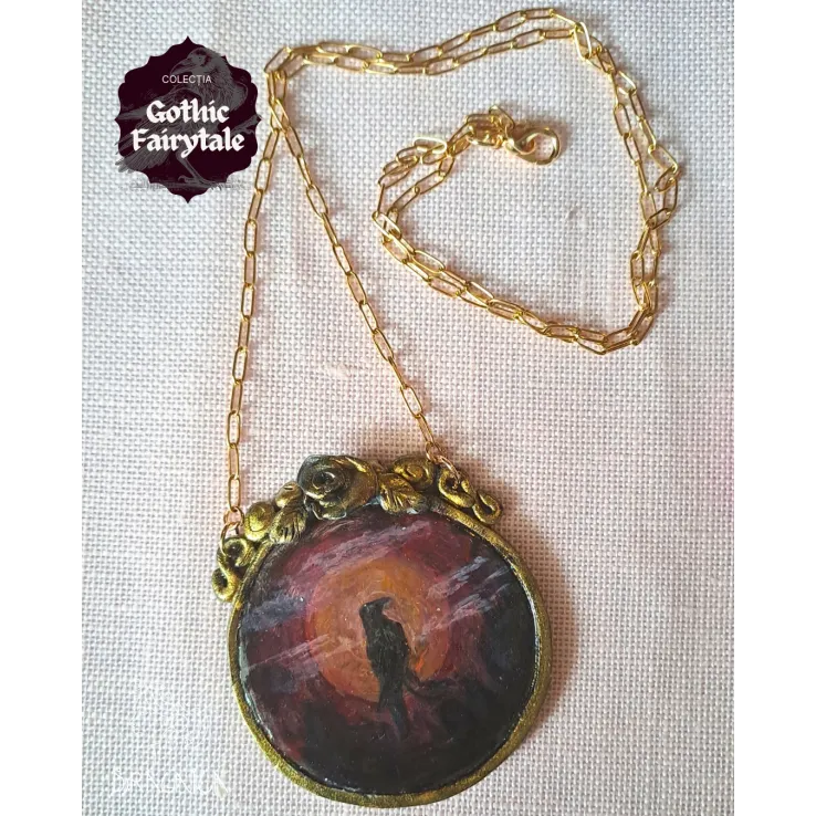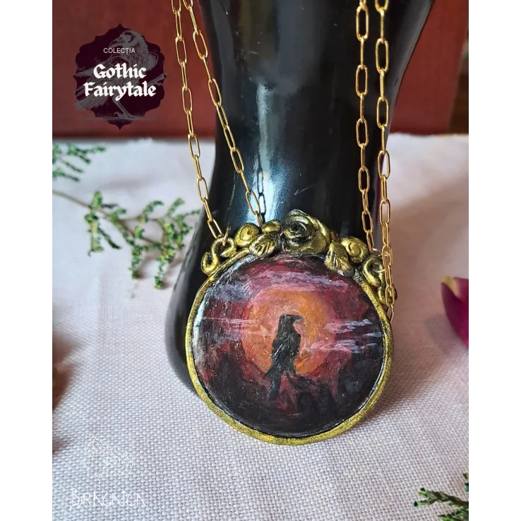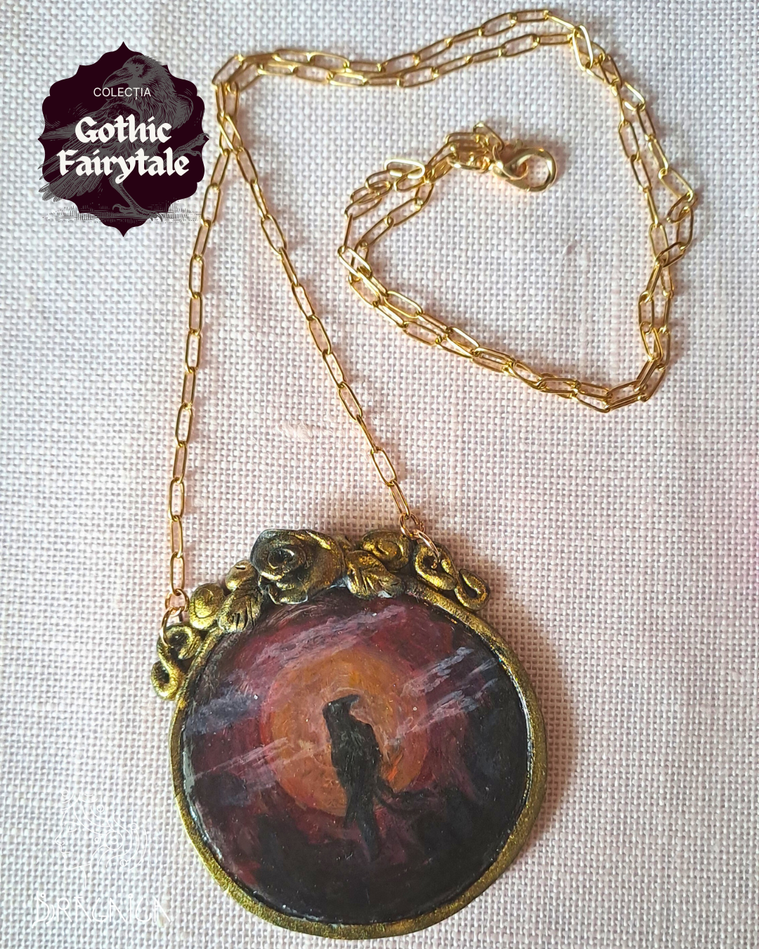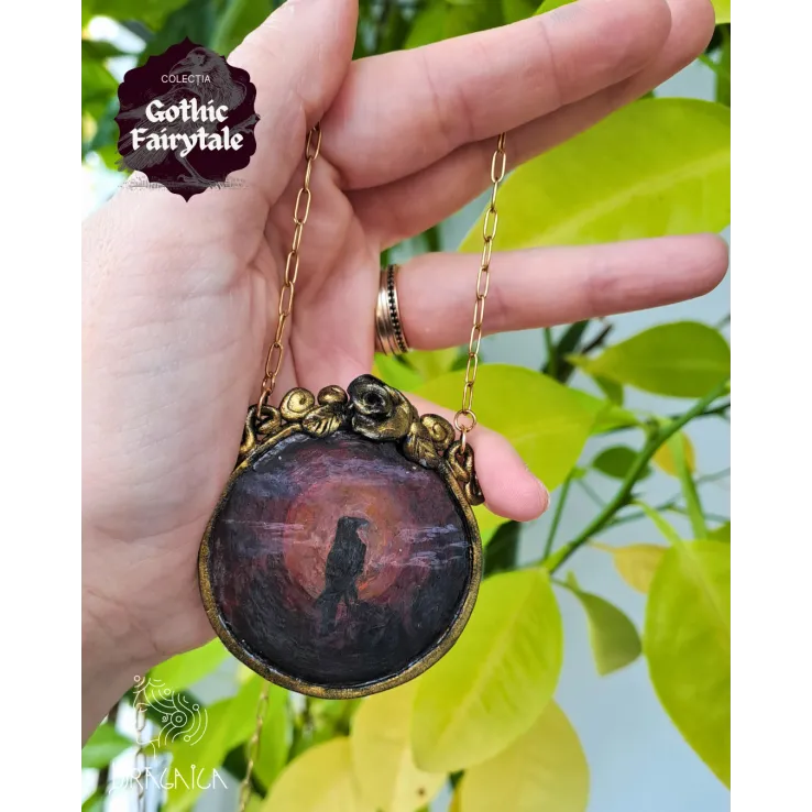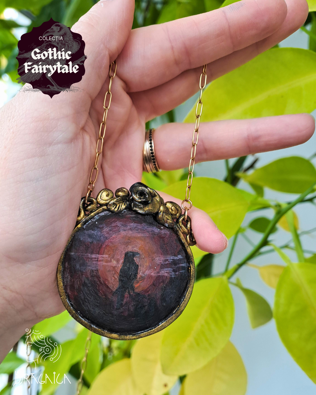 Colier cu pandantiv modelat manual din lut polimeric, apoi pictat manual. cu vopsele acrilice. Lanț din oțel inoxidabil. Colecția Gothic Fairytale vorbește despre ceea ce se află ascuns în umbre, despre mister și taine neștiute. Natura umană și supranaturalul se împletesc pentru a da naștere unor bijuterii unice, cu o estetică aparte, ce amintesc de Dracula lui Bram Stoker sau de universul lui Edgar Allan Poe. Fiecare piesă este OOAK (one of a kind -unicat).
