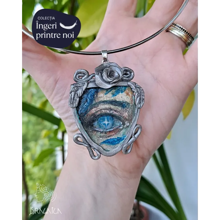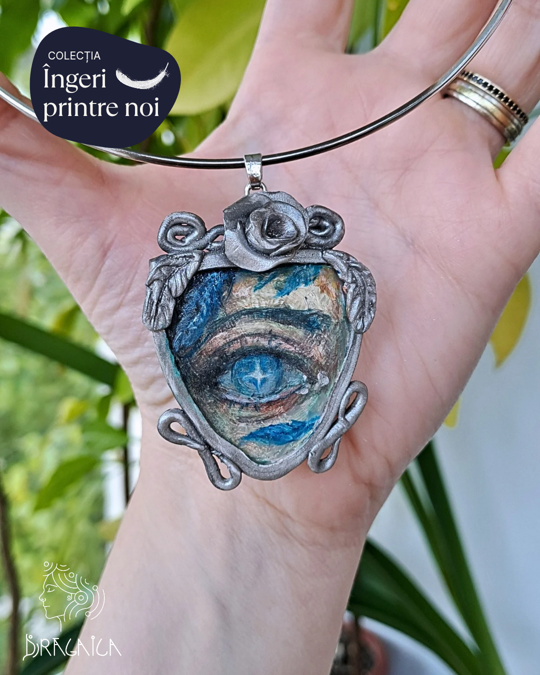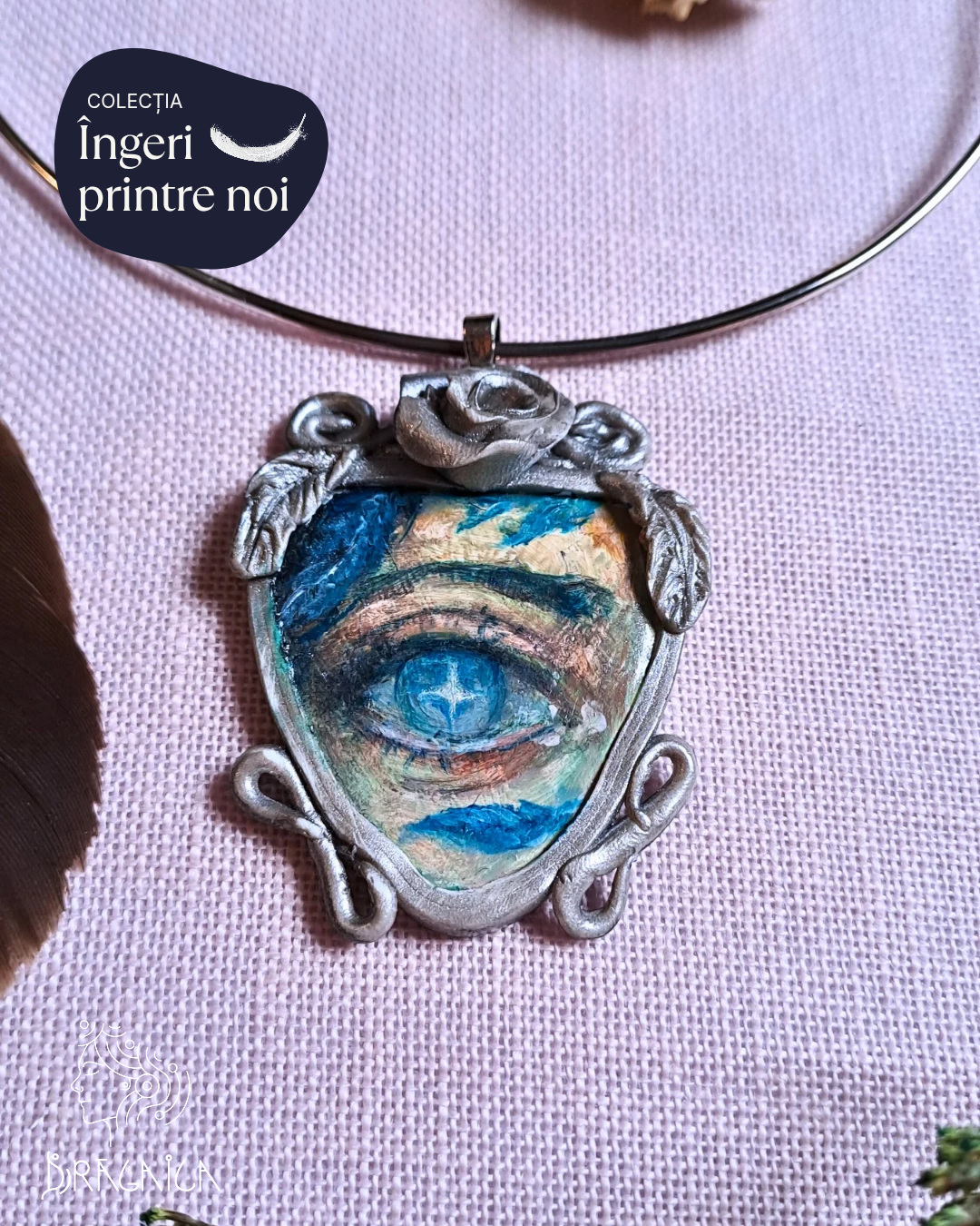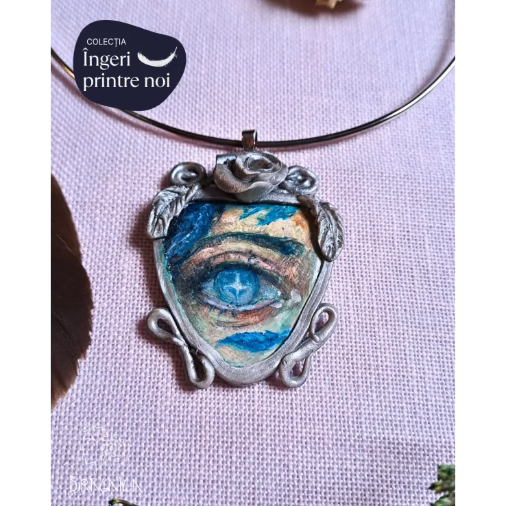 Colier cu pandantiv modelat manual, din lut polimeric, apoi pictat manual cu vopsele acrilice. O pictura miniaturala gata de a fi purtata. Accesorii din otel inoxidabil.