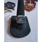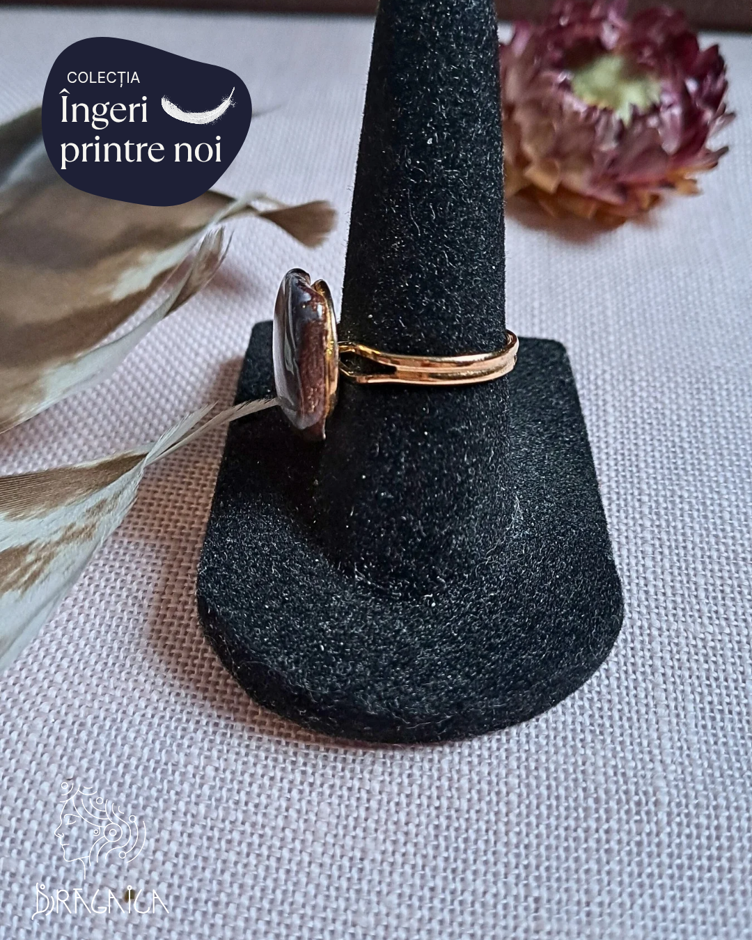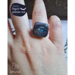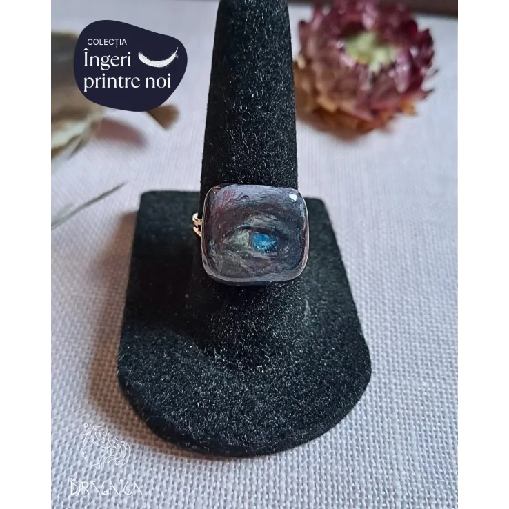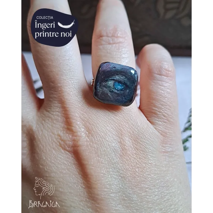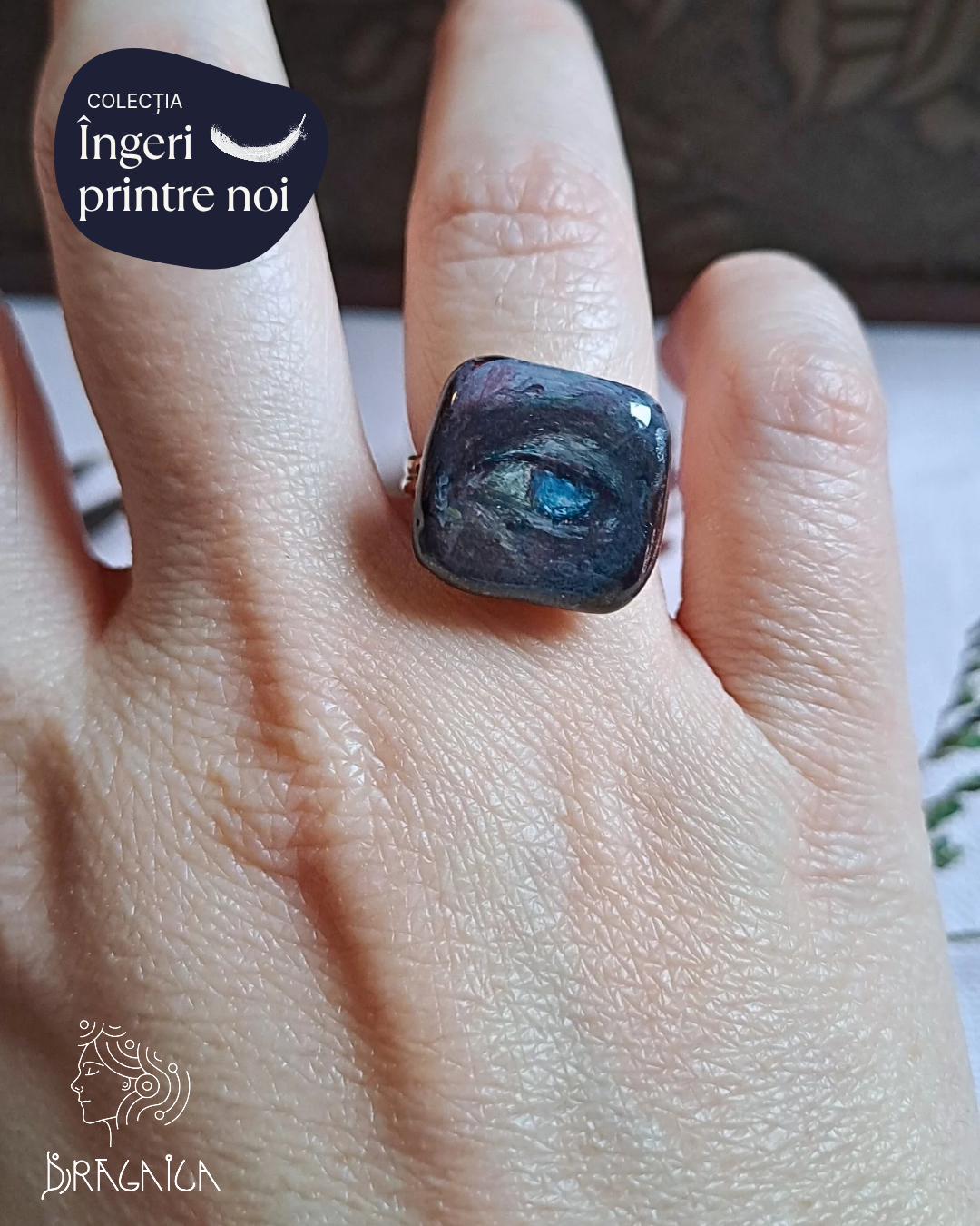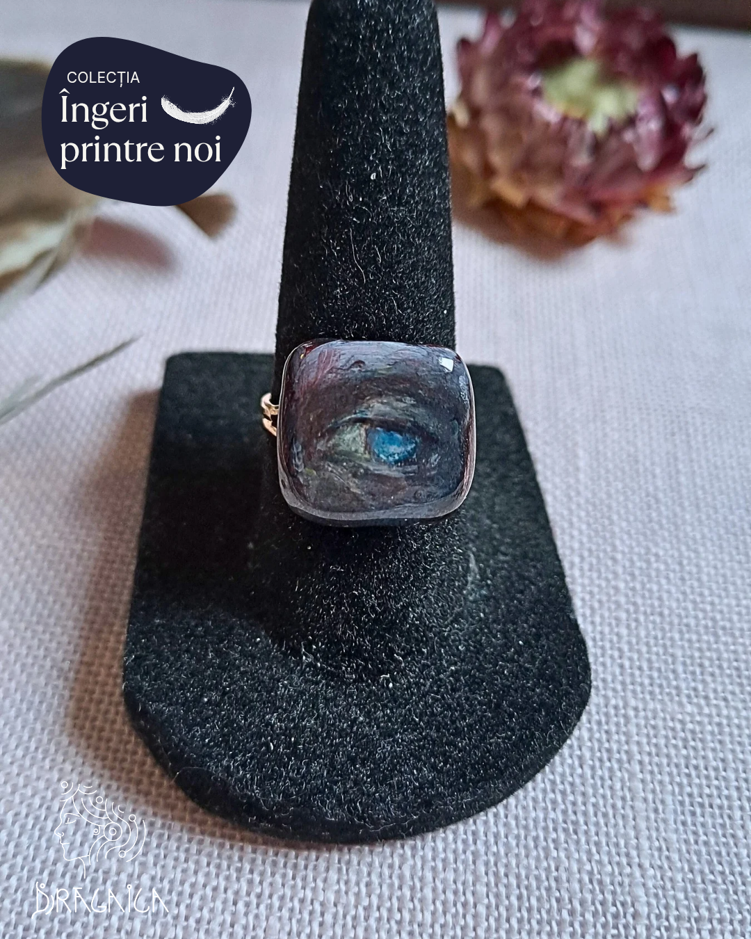 Inel ajustabil cu cabochon realizat din lut polimeric, pictat manual cu vopsele acrilice, apoi încastrat în rășină epoxidică. Unicat.