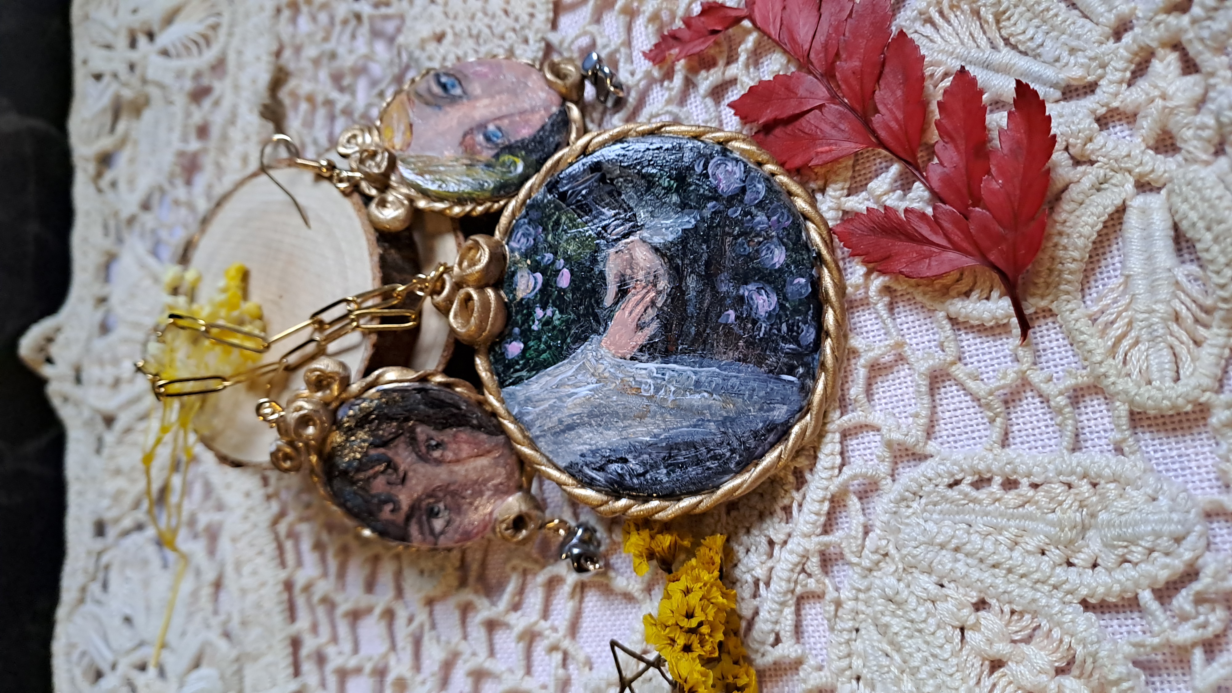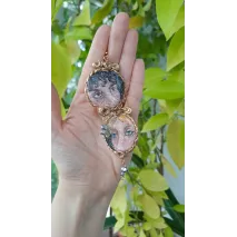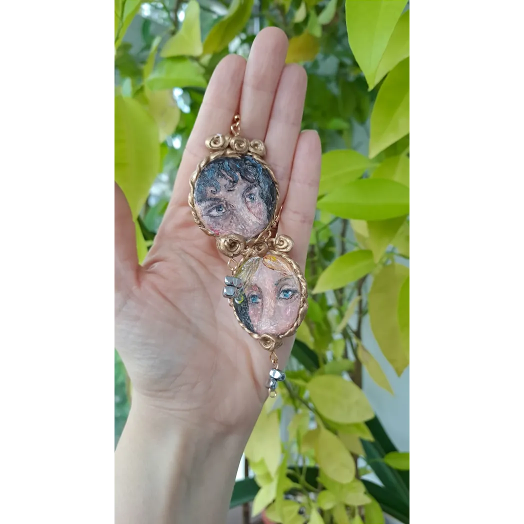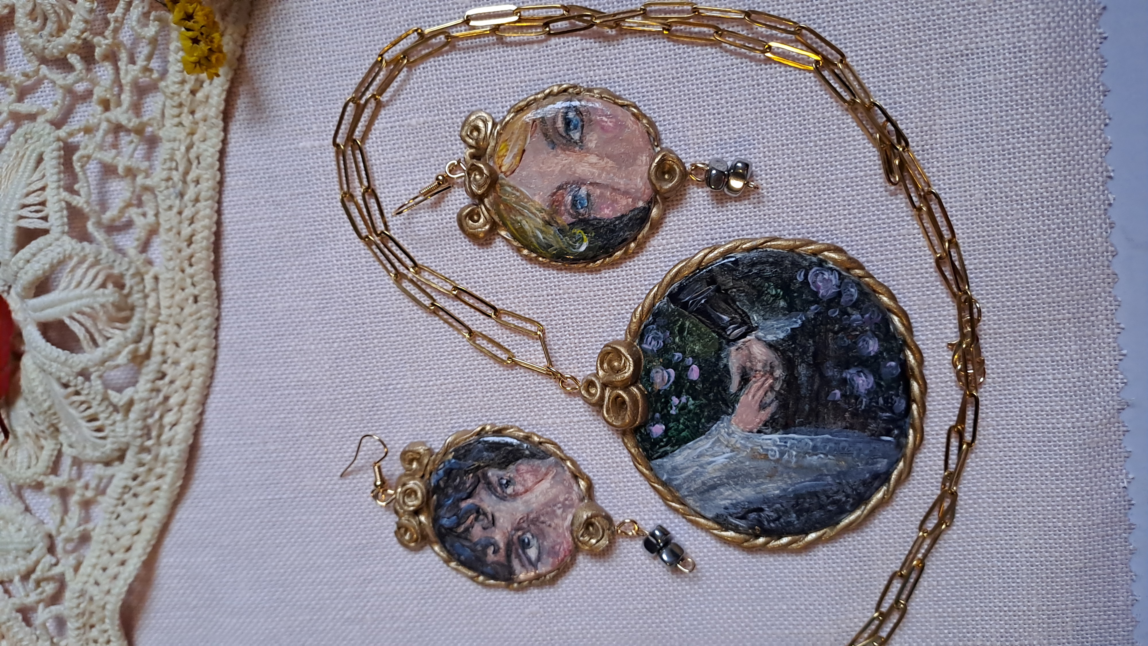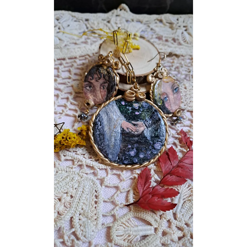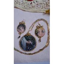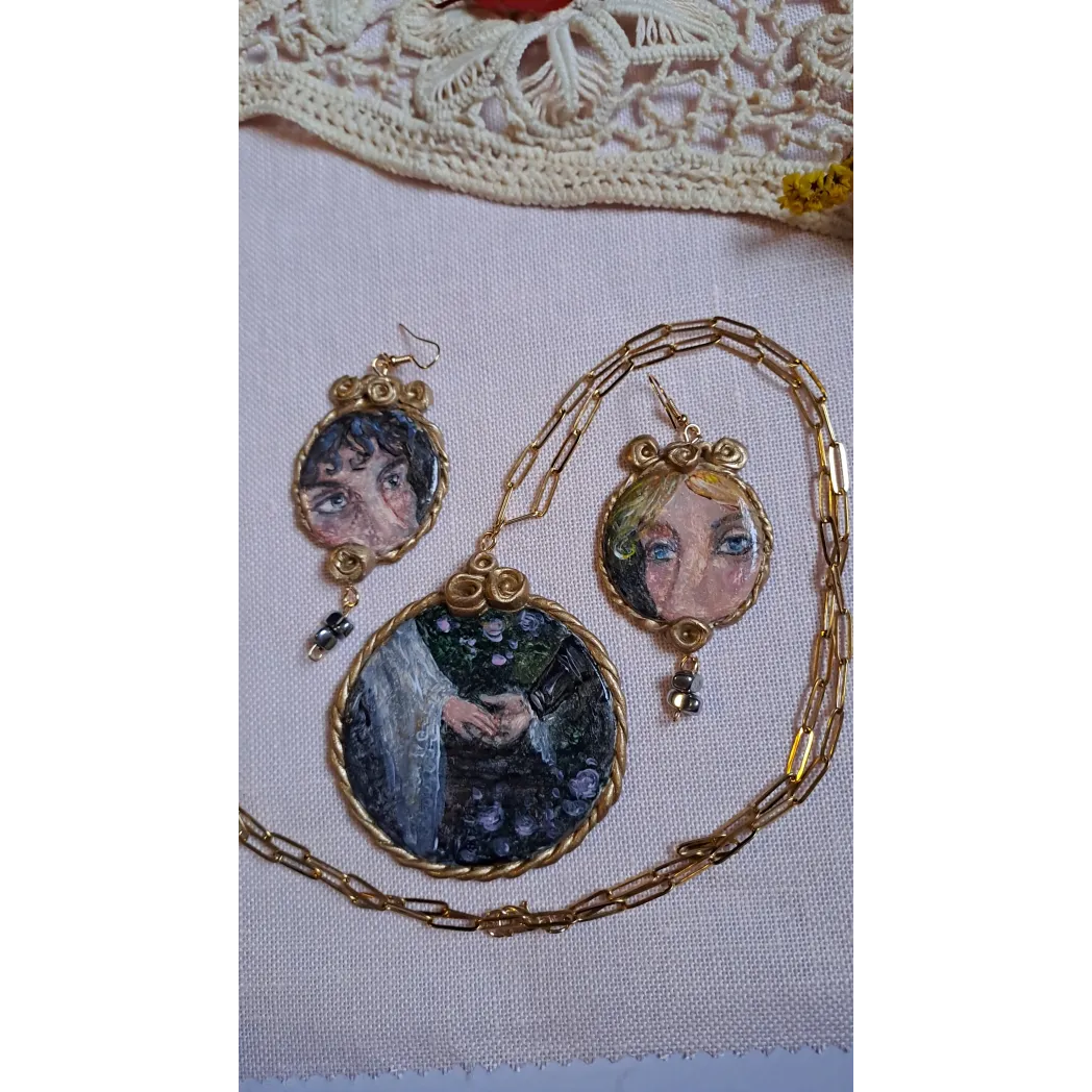 Set format din colier cu pandantiv si cercei, realizați din lut polimeric. Pictate manual, cu accesorii din oțel inoxidabil, iar cerceii au și cateva pietre din hematit.