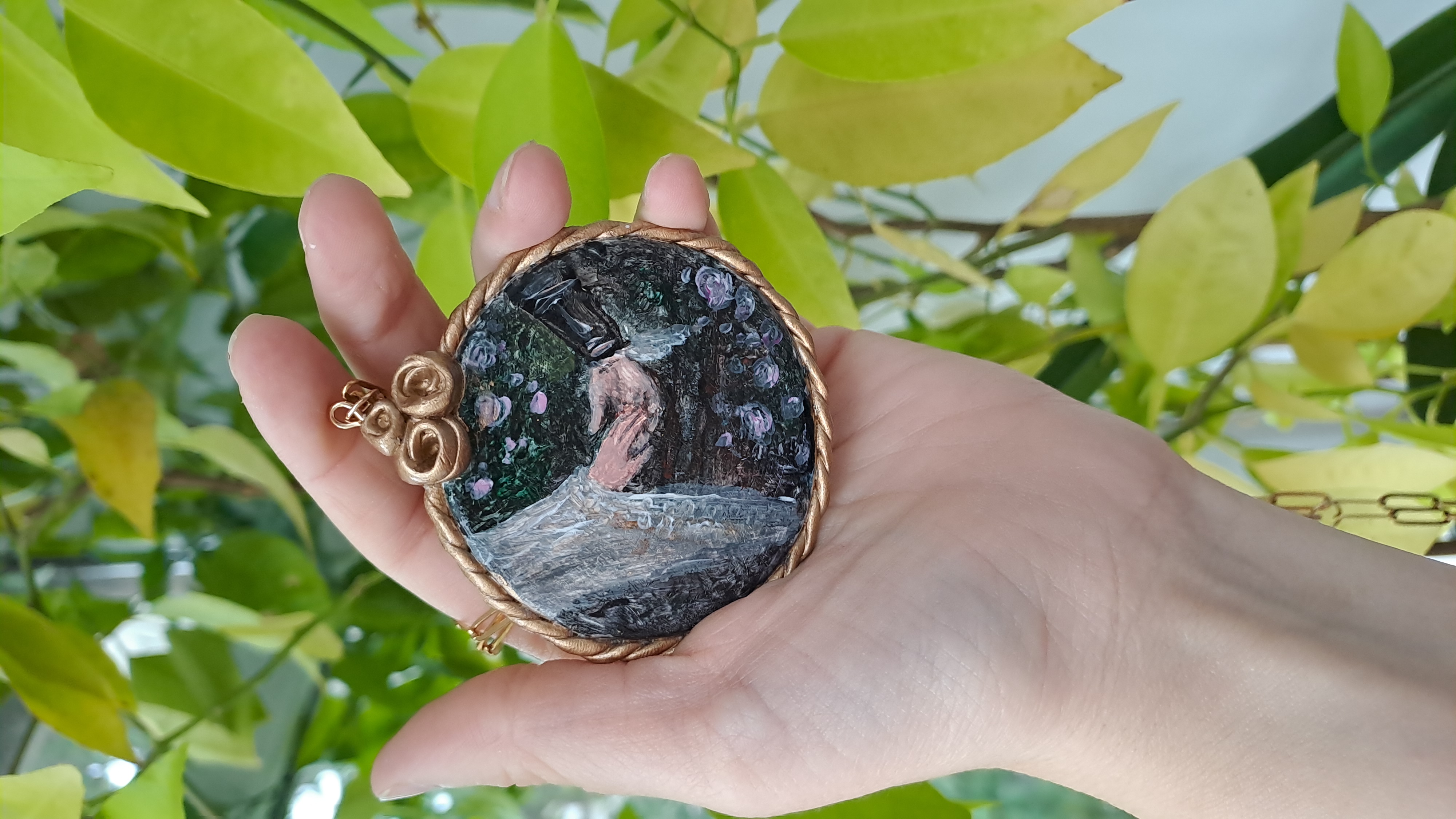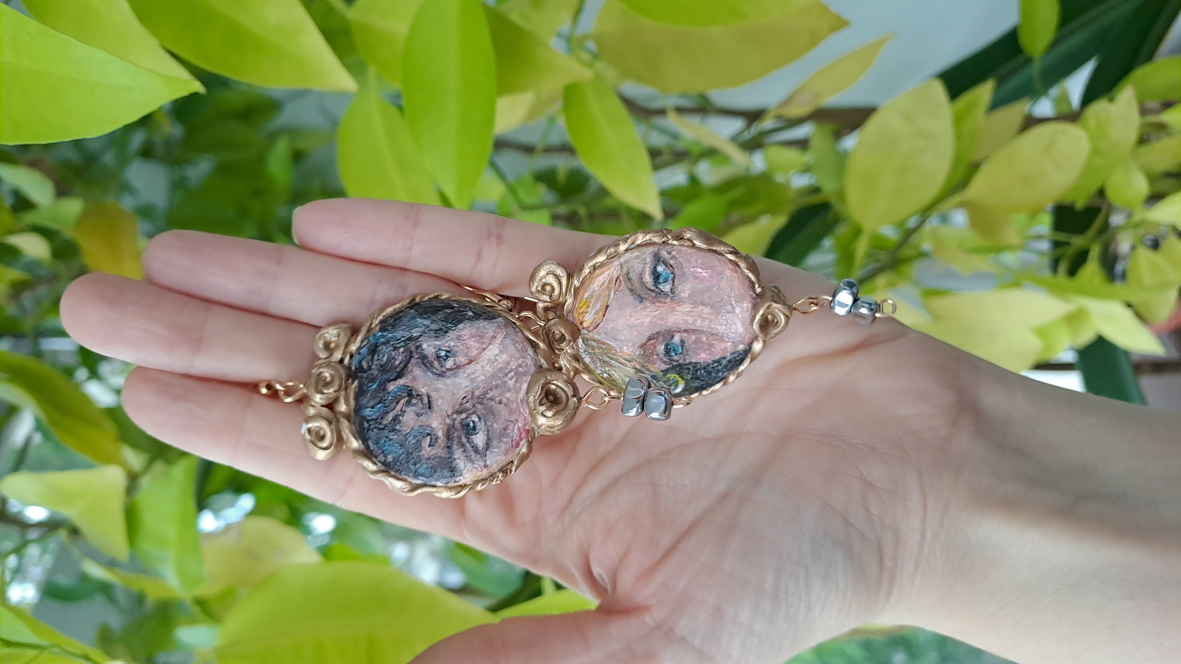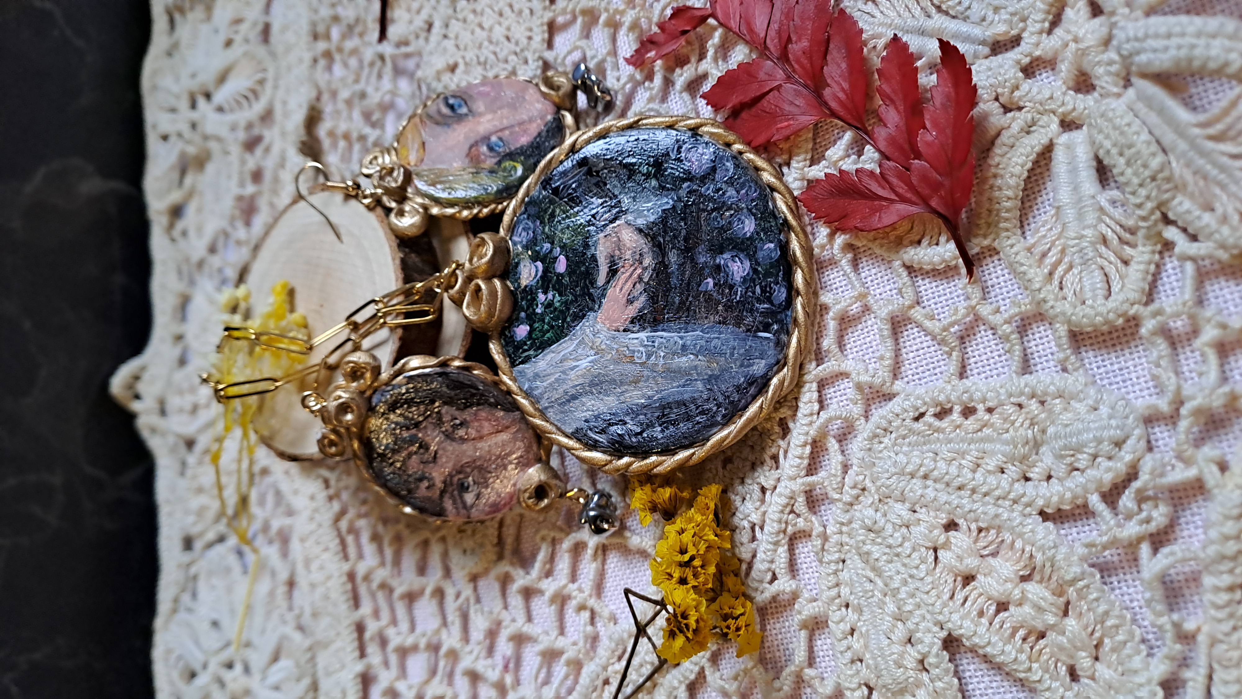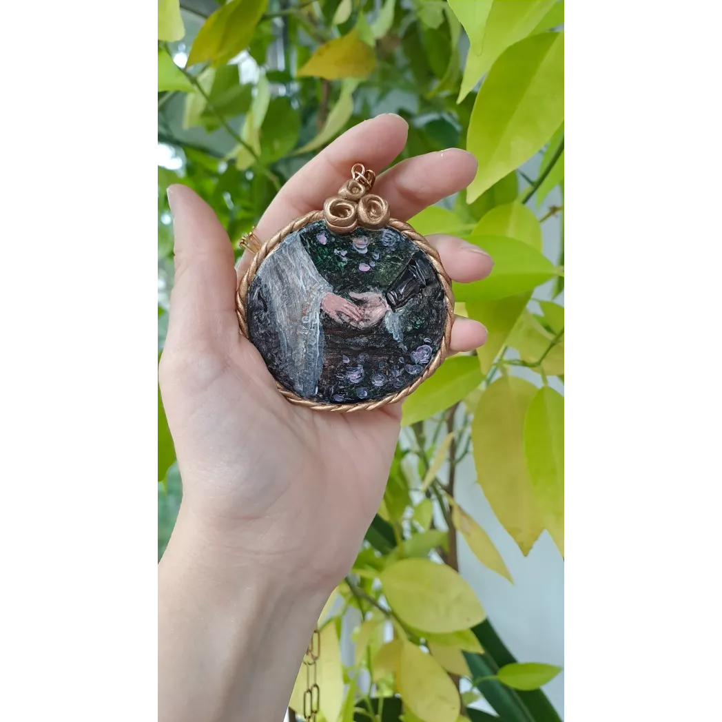 Set format din colier cu pandantiv si cercei, realizați din lut polimeric. Pictate manual, cu accesorii din oțel inoxidabil, iar cerceii au și cateva pietre din hematit.